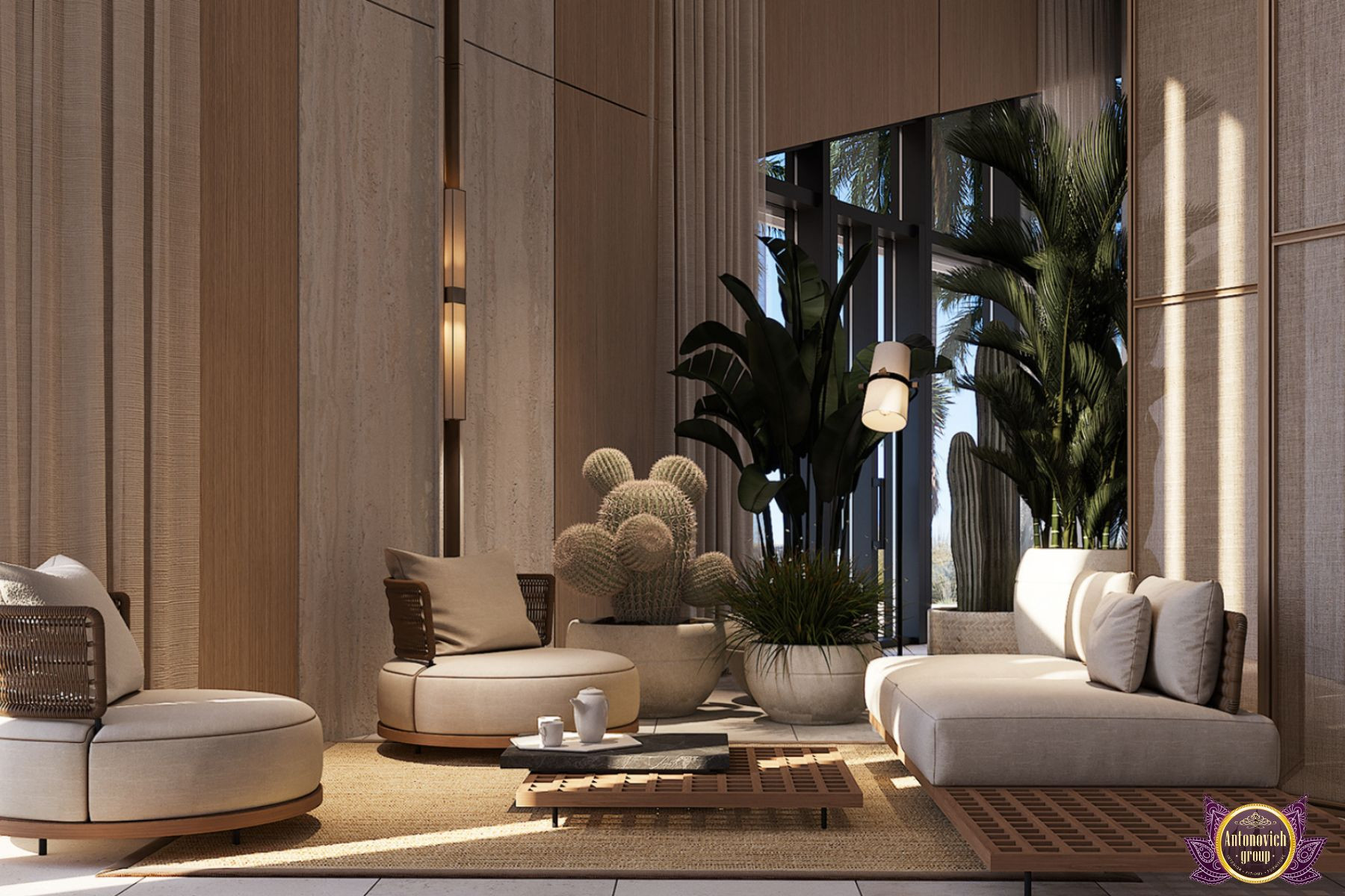 Anantara is located near the end of Palm Jumeirahs east crescent, away from the crowds, but with a view of the citys glittering skyline across the Arabian Gulf. This Luxurious combination of residential and hospitality property has an exterior setting with a red-roofed Thai temple-inspired resort is built around three lagoon pools where floating market-style boats while colorful tuk-tuks transport guests around the property. The entire residential and hotel property has indeed paid homage to its location. As the top interior design and fit-out company in Dubai, Antonovich Group is very proud to welcome you to its wonderful creation of interior design for the penthouse which has been situated at this magnificent residential property at Anantara, Palm Jumeirah.