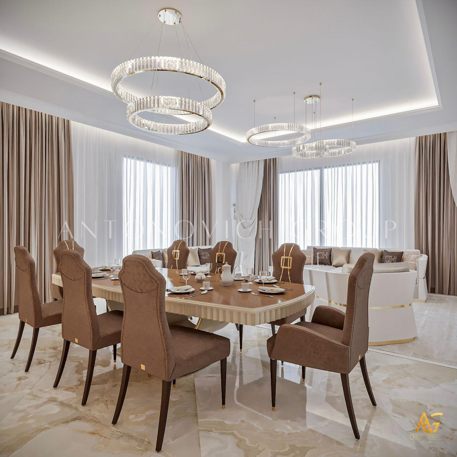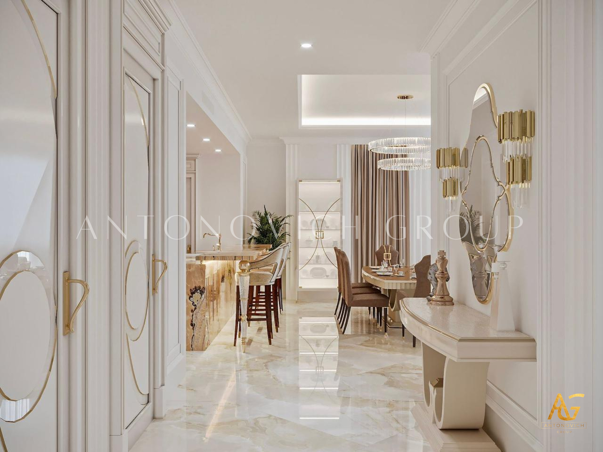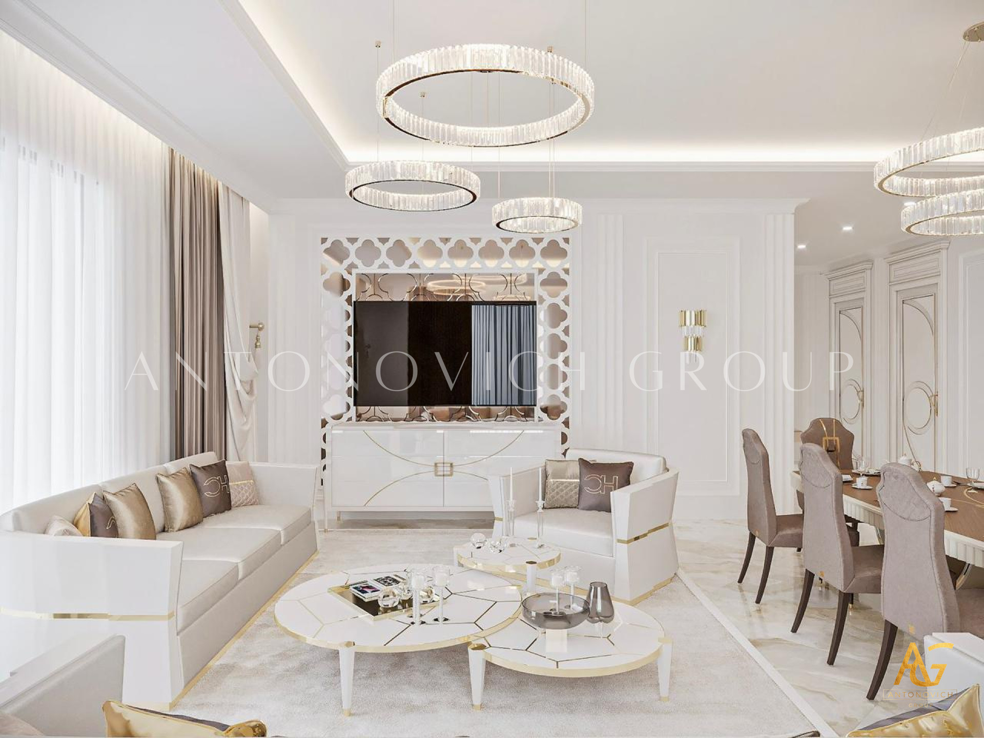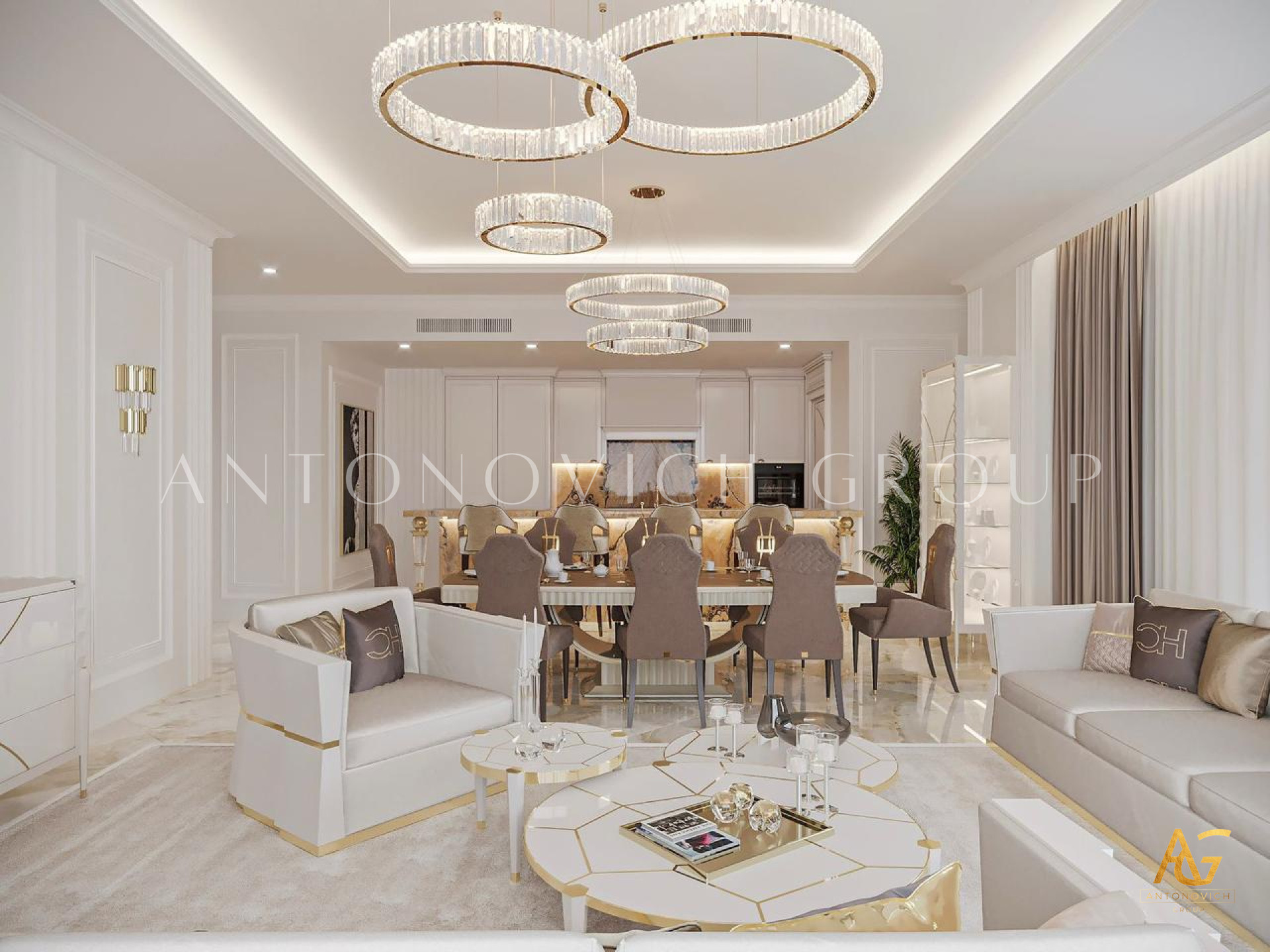 Penthouse designs define luxury. A penthouse offers maximum luxury, seclusion, and a refined ambiance. Penthouses are typically found on the upper floors of buildings and offer spectacular views of the surrounding area. Unlike ordinary apartments, these residences have both a terrace and a balcony, providing ample space. Antonovich Group interiors are inviting yet ornate, and their design concepts are dynamic while adhering to a contemporary brief, making them the best fit-out company in Dubai. The modern design and decor of the penthouse interior must be appealing and in keeping with the overall atmosphere of the area. There are a few design elements that distinguish them from modern apartments in general, and well go over a few of them below. The best fit-out company in Dubai, Antonovich group has created this magnificent and sumptuous Penthouse interior modern design in Creek Harbour. This interior design firm executes this high-quality project with finesse, providing us with a spacious and luxurious living room interior design. This luxury living room fits in well with Dubais elite and rich lifestyle, with the elegance that only Antonovich Group can provide.