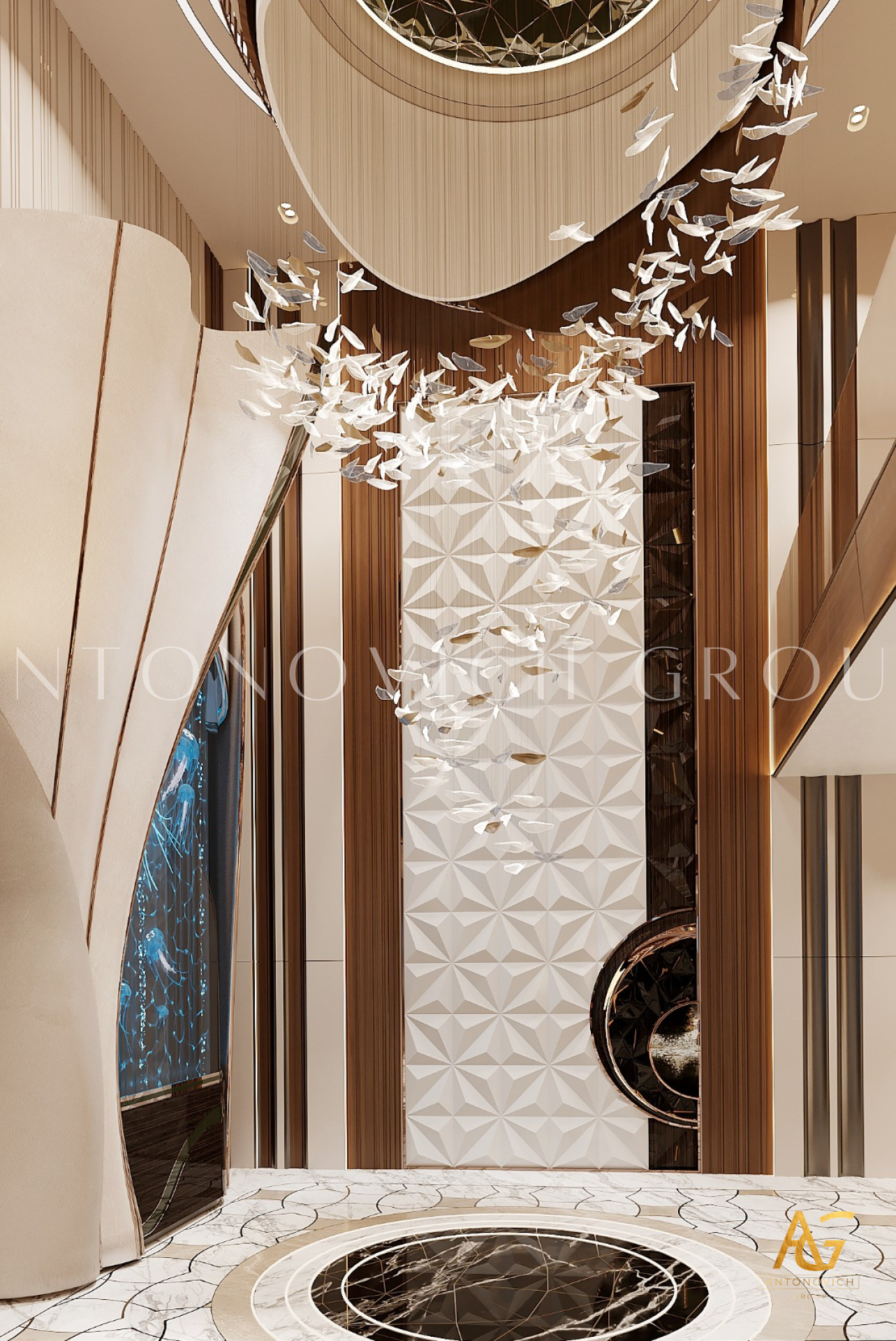 Bespoke Entrance Design: Crafting Grandeur with Custom Chandeliers and Spiral Staircases