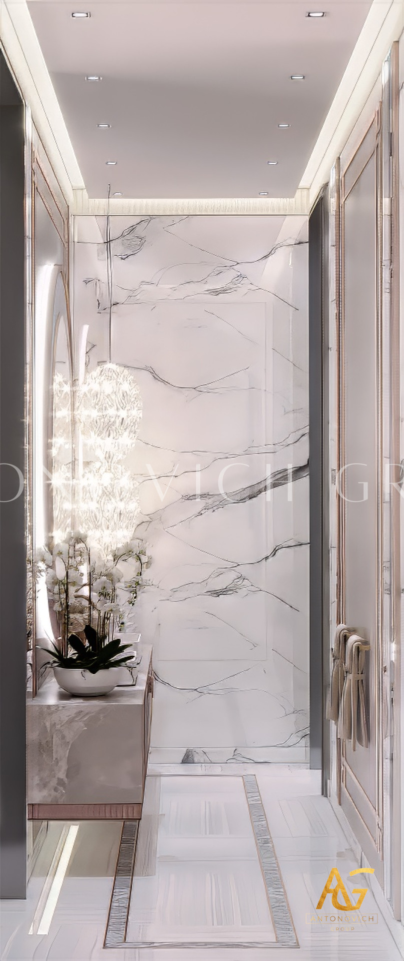 Antonovich Group is known for integrating the latest bathroom design trends with a timeless aesthetic. Natural materials such as marble, travertine, and wood veneers bring warmth and texture, while polished metals and glass accents add modern refinement. Soft lighting plays a vital role, with LED mirrors and layered illumination enhancing both ambiance and functionality. The use of statement bathtubs, floating vanities, and frameless glass showers continues to define the group’s contemporary approach to luxury bathroom design.