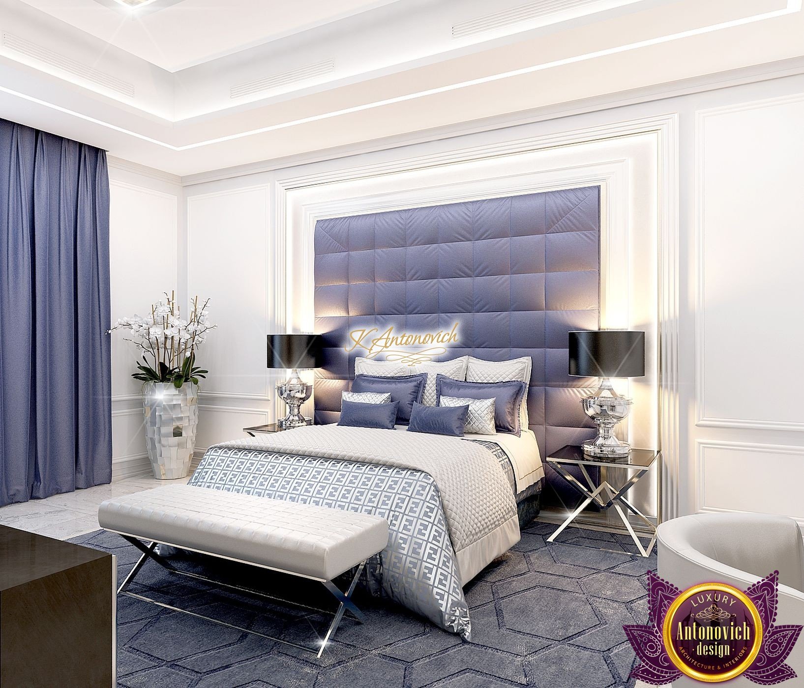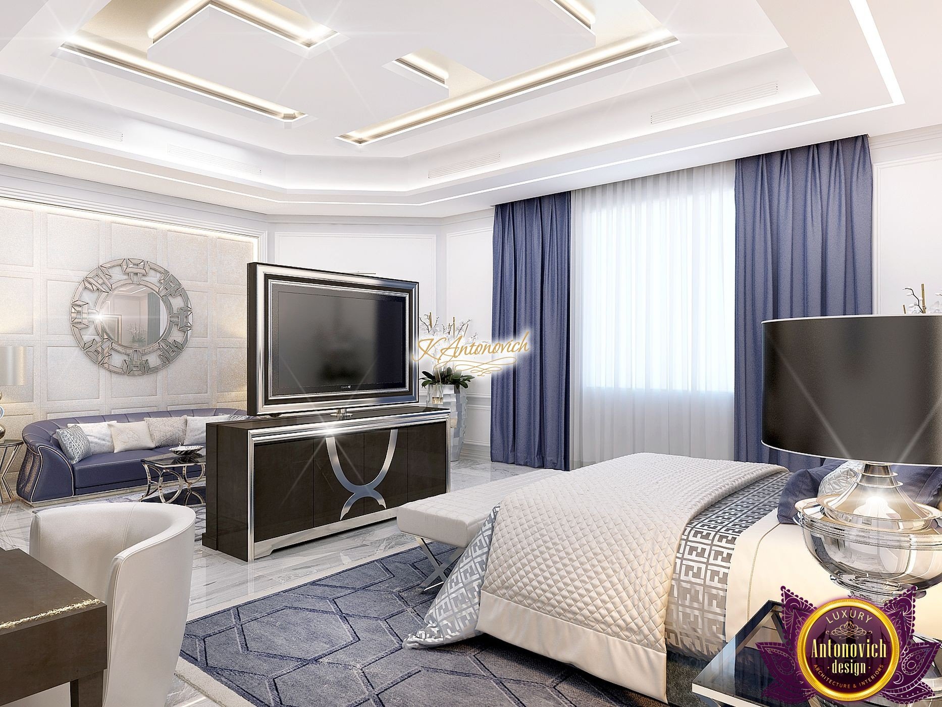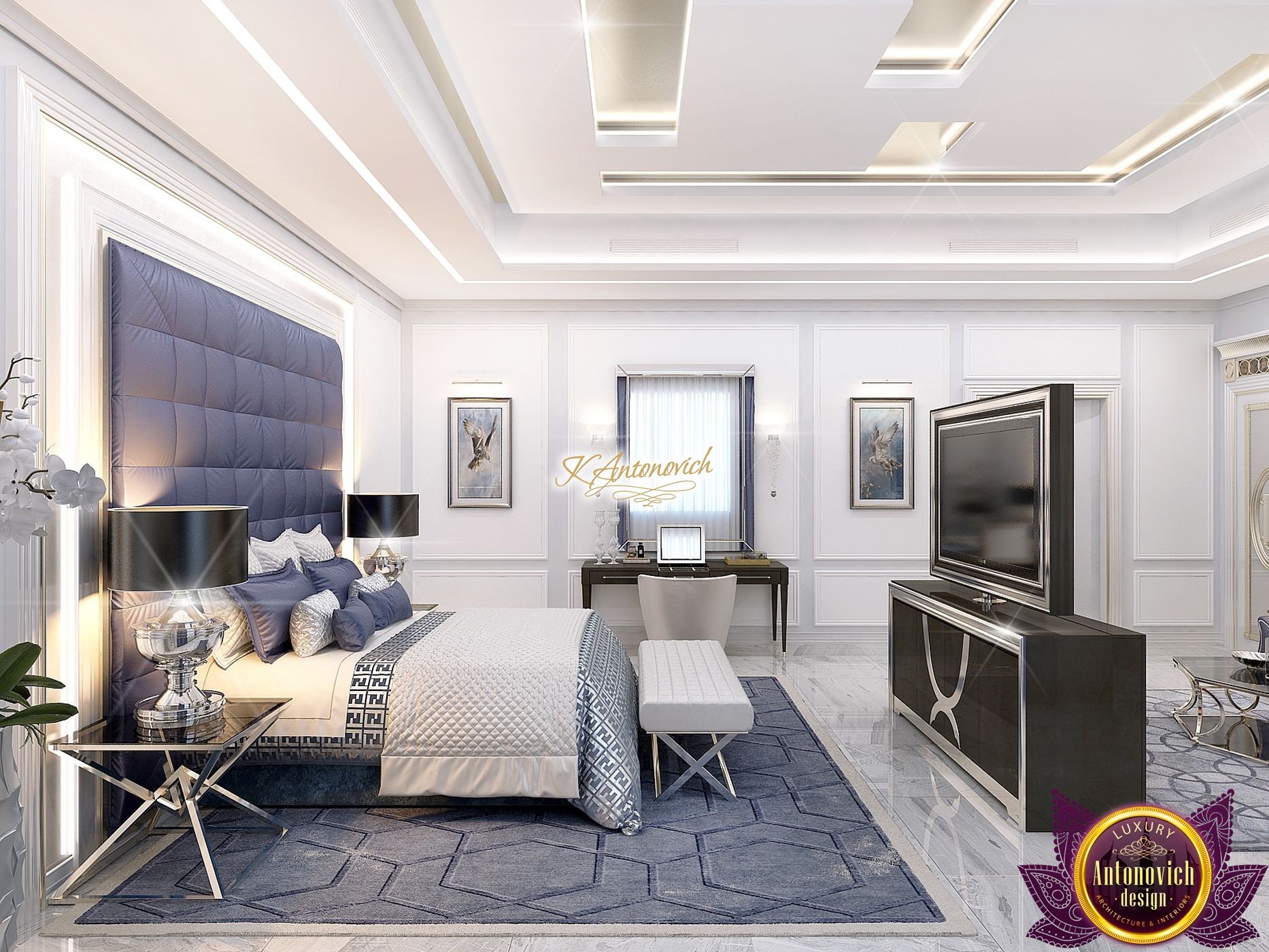 The master bedroom in the elite mansion is ideally for the overall design of the interior concept in a classic style. Designers of the studio Luxury Antonovich Design create impeccable interiors in the classical style. Moreover, each project is unique and special in its beauty. A large space of the room, which was allocated for the project of a bedroom on the second floor, gave a large scope for the creativity of designers. The authors of the project conditionally divided the interior into three zones. Every detail is designed to create ideal comfort for the owners of the house. One of the rest zones is located by the window. Two comfortable chairs and a decorative table with a vase allow a cozy and comfortable rest, admiring the scenery outside the window or reading a book. A special approach of the studio Luxury Antonovich Design applies to the design of windows. The design of curtains in Dubai is famous for its unique solutions and impeccable embodiment. For this interior, textile designers offered curtains in the classic style of luxurious silk soft turquoise hue with printed ornaments. It is beautifully colored by a one-colored silk of bronze hue. An important role is played by the elements of decoration. The decoration of the window is impeccable and perfectly blended into the interior. In order to the interior with the three zones has its completeness, the designers unite it with the ceiling decor. The snow-white surface is outlined by a line of molding stucco decor and additional soft backlighting. Two crystal chandeliers fill the interior with enough light. For watching favorite films, for the owners, a rest area with a sofa and a plasma panel was provided. And the epicenter of the beauty in the bedroom interior was a comfortable bed with a velvet panel behind its headboard.