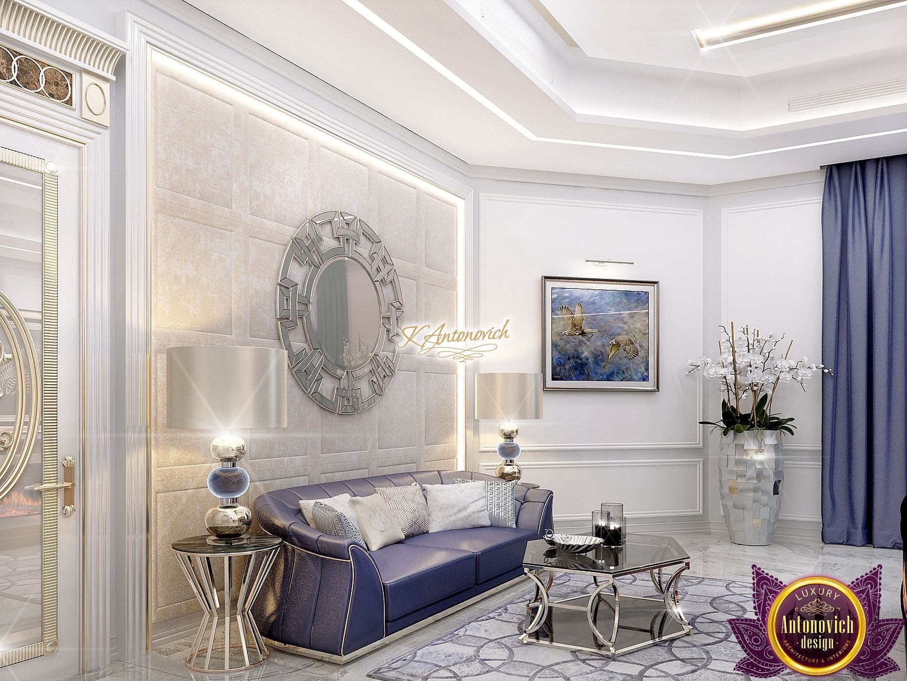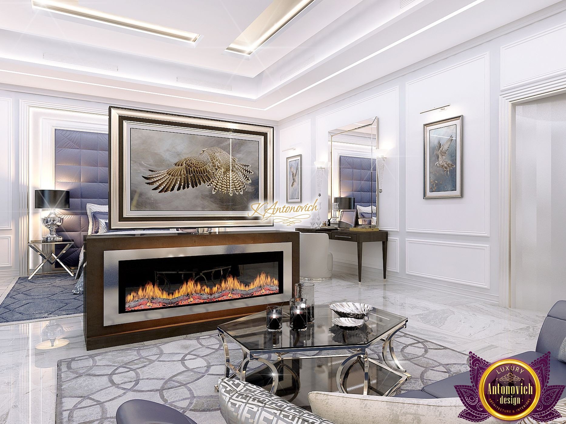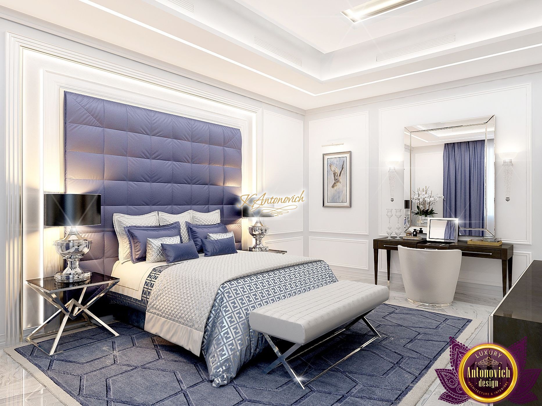 The master bedroom in the elite mansion is ideally for the overall design of the interior concept in a classic style. Designers of the studio Luxury Antonovich Design create impeccable interiors in the classical style. Moreover, each project is unique and special in its beauty. A large space of the room, which was allocated for the project of a bedroom on the second floor, gave a large scope for the creativity of designers. The authors of the project conditionally divided the interior into three zones. Every detail is designed to create ideal comfort for the owners of the house. One of the rest zones is located by the window. Two comfortable chairs and a decorative table with a vase allow a cozy and comfortable rest, admiring the scenery outside the window or reading a book. A special approach of the studio Luxury Antonovich Design applies to the design of windows. The design of curtains in Dubai is famous for its unique solutions and impeccable embodiment. For this interior, textile designers offered curtains in the classic style of luxurious silk soft turquoise hue with printed ornaments. It is beautifully colored by a one-colored silk of bronze hue. An important role is played by the elements of decoration. The decoration of the window is impeccable and perfectly blended into the interior. In order to the interior with the three zones has its completeness, the designers unite it with the ceiling decor. The snow-white surface is outlined by a line of molding stucco decor and additional soft backlighting. Two crystal chandeliers fill the interior with enough light. For watching favorite films, for the owners, a rest area with a sofa and a plasma panel was provided. And the epicenter of the beauty in the bedroom interior was a comfortable bed with a velvet panel behind its headboard.