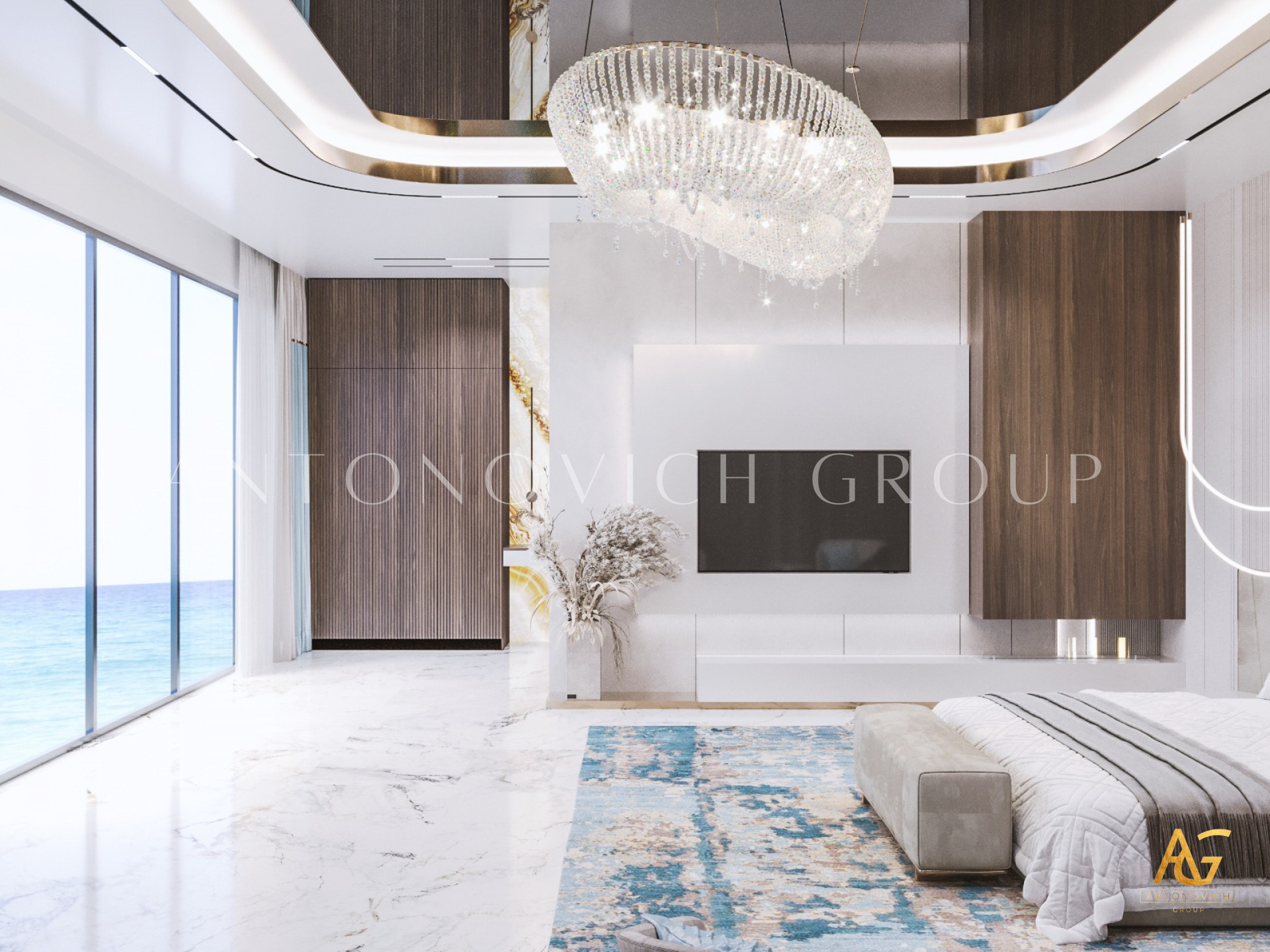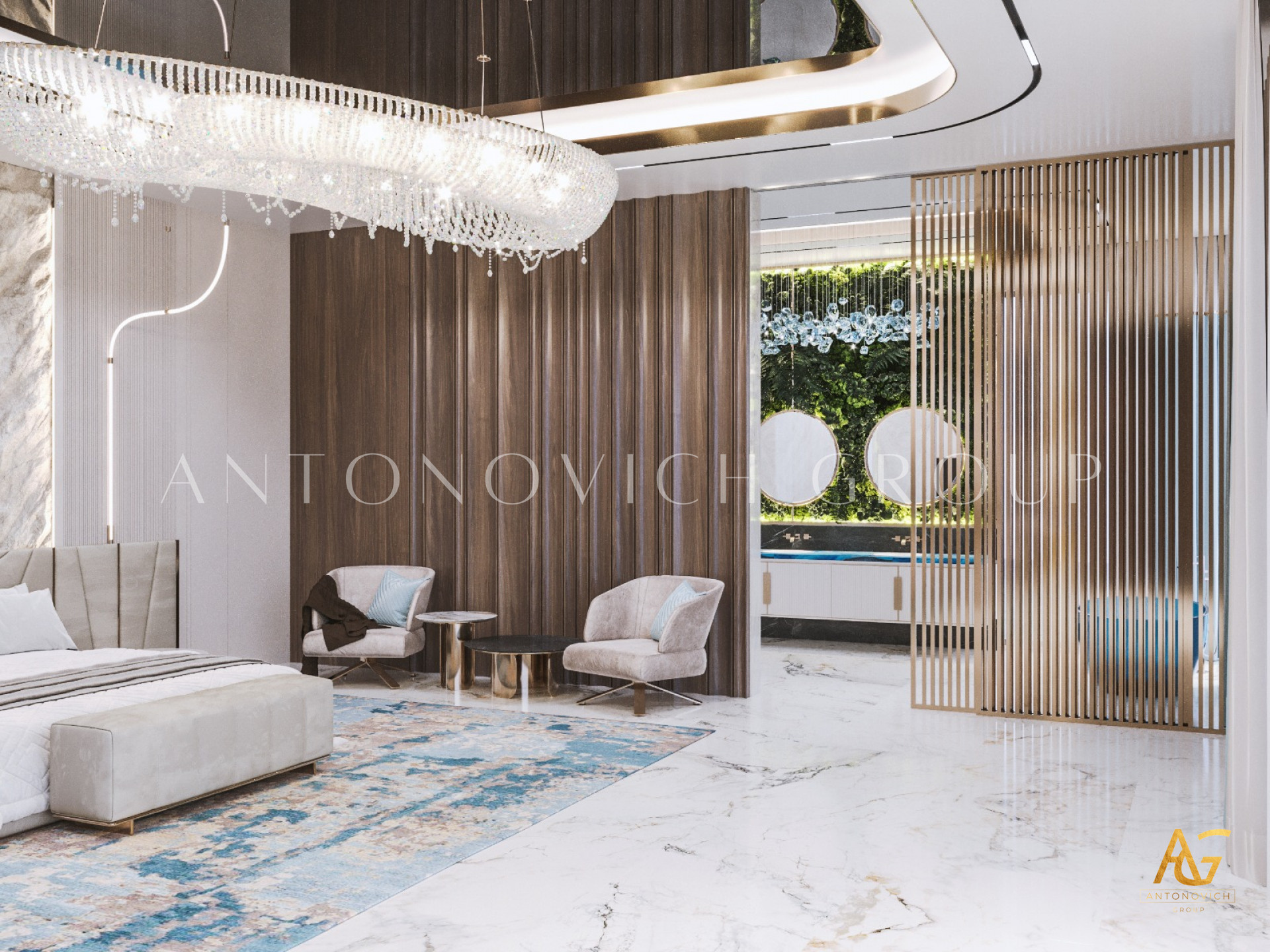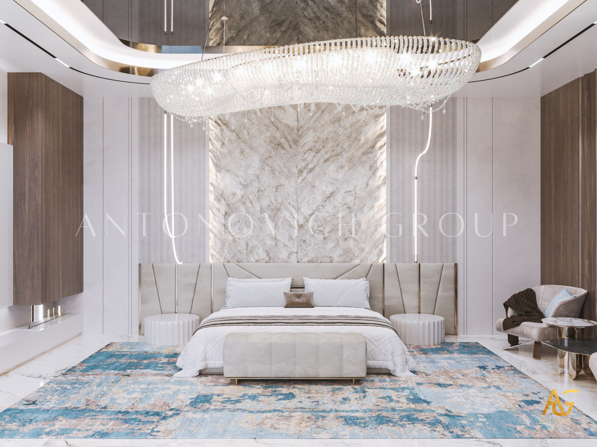 Antonovich Group understands that lighting is the crowning jewel in luxury interior design. In the master bedroom, carefully selected chandeliers take center stage. Hanging like celestial sculptures, they cast a soft glow that enhances the ambiance, turning the bedroom into a sanctuary of tranquility.
