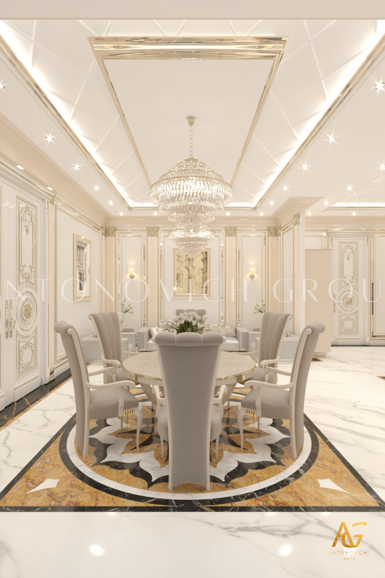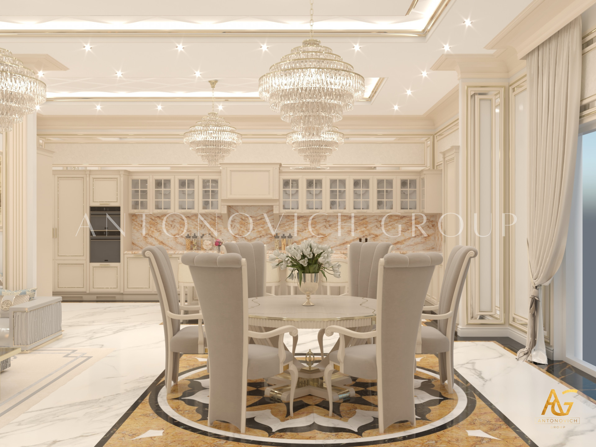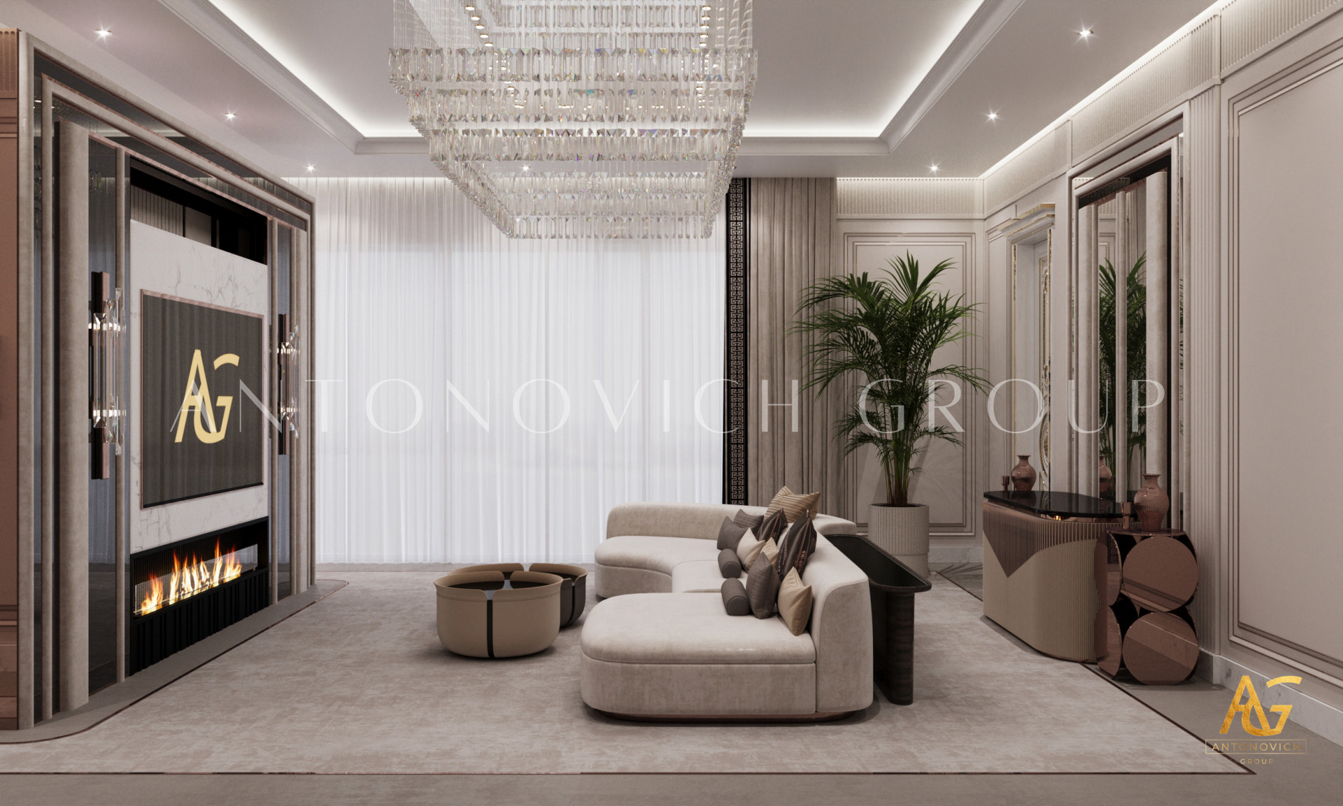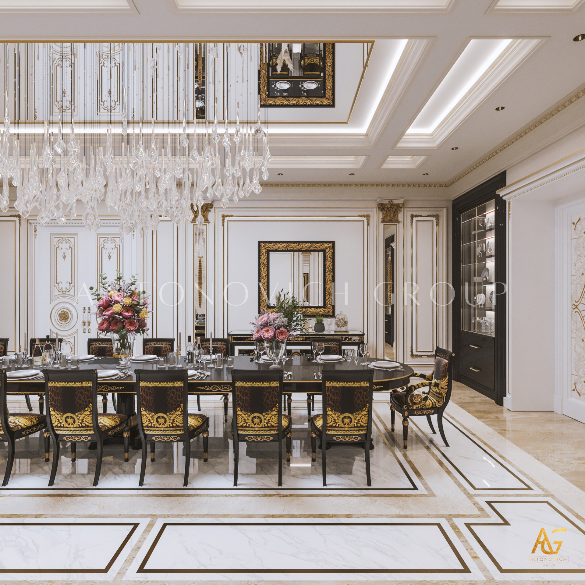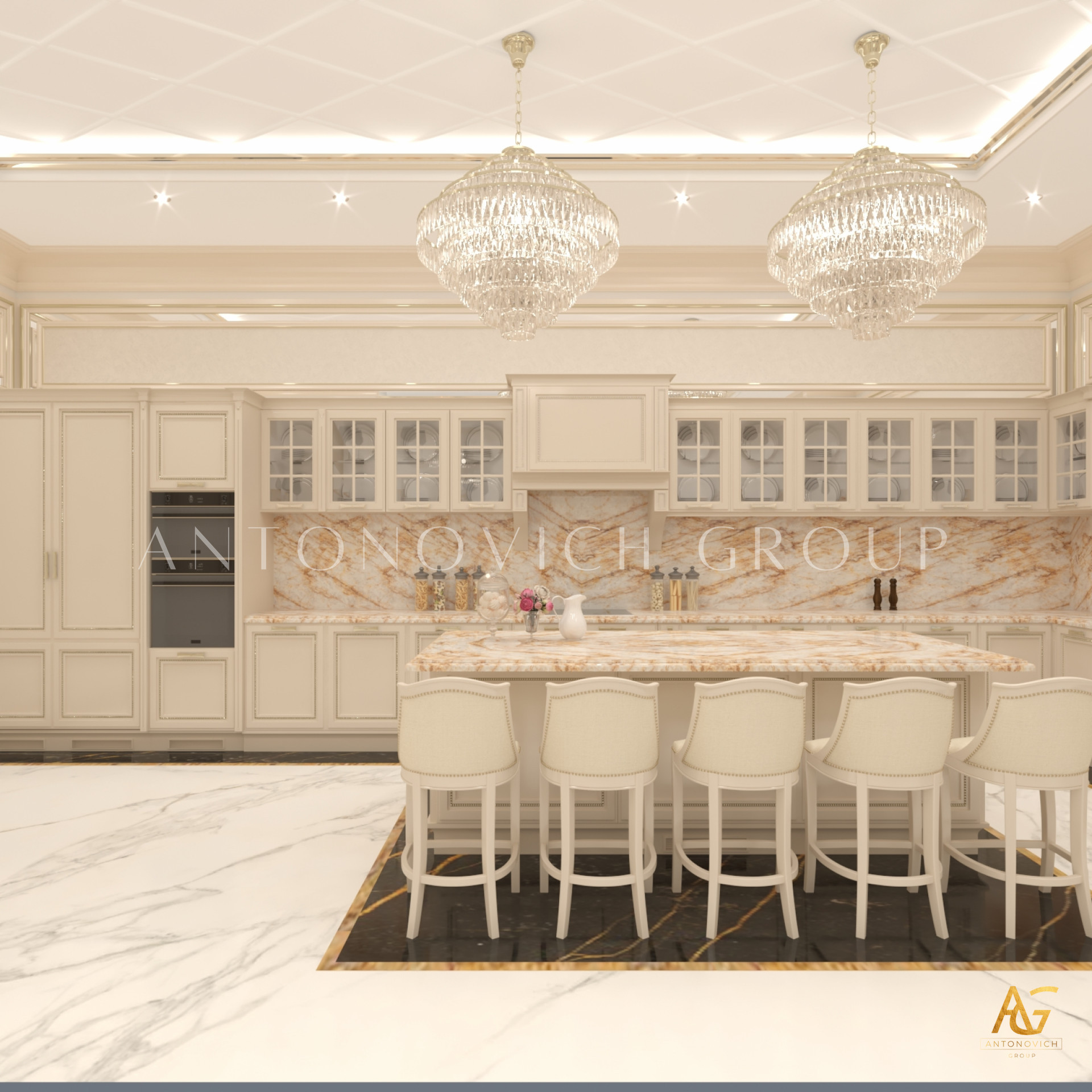 Stepping inside the villa is like entering a realm where classic elegance meets modern luxury. Antonovich Group's interior design team has orchestrated a symphony of opulent details, creating an environment that is both regal and inviting.