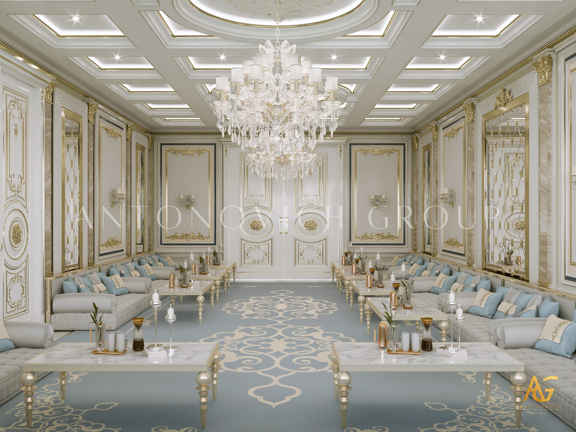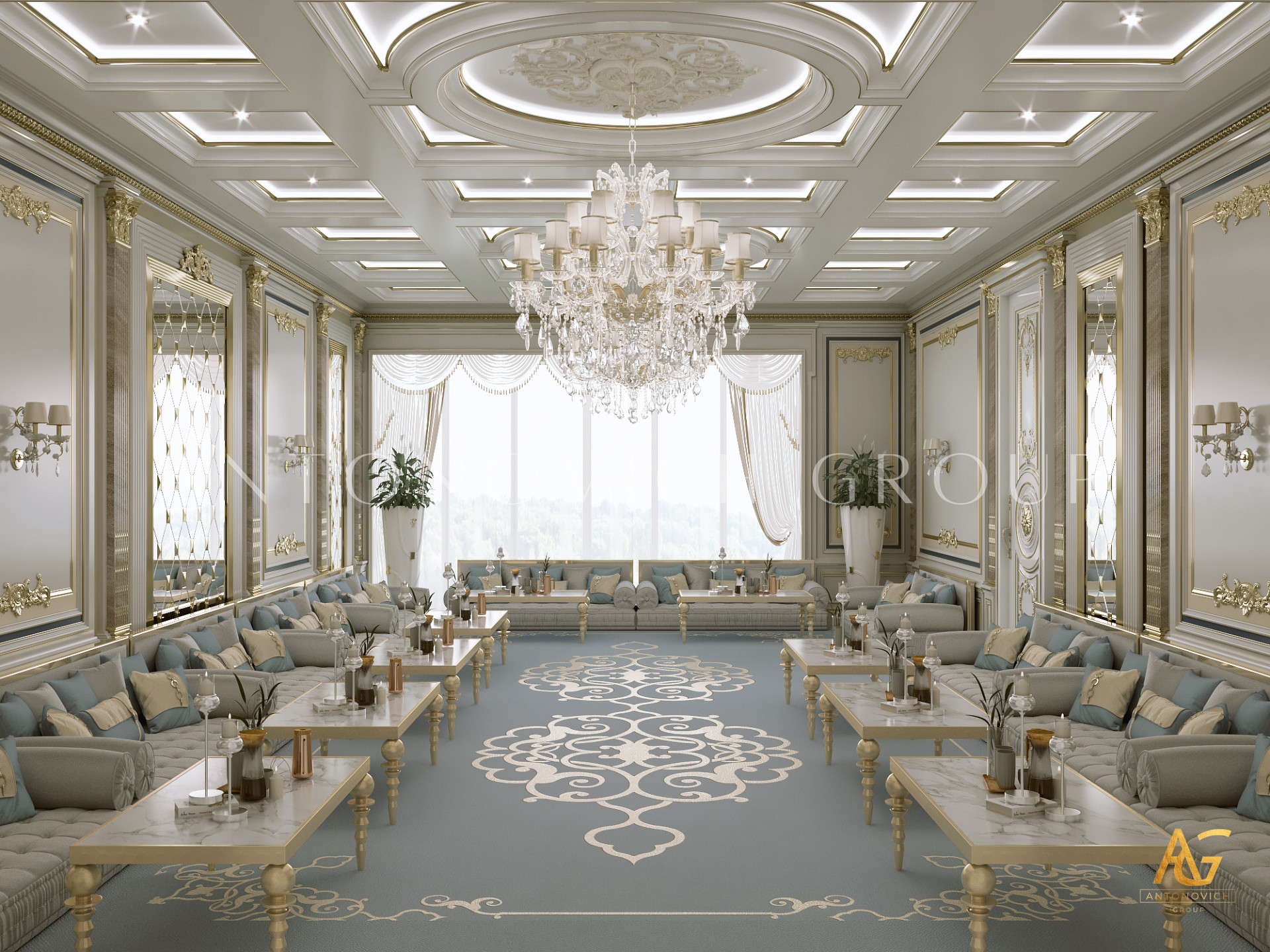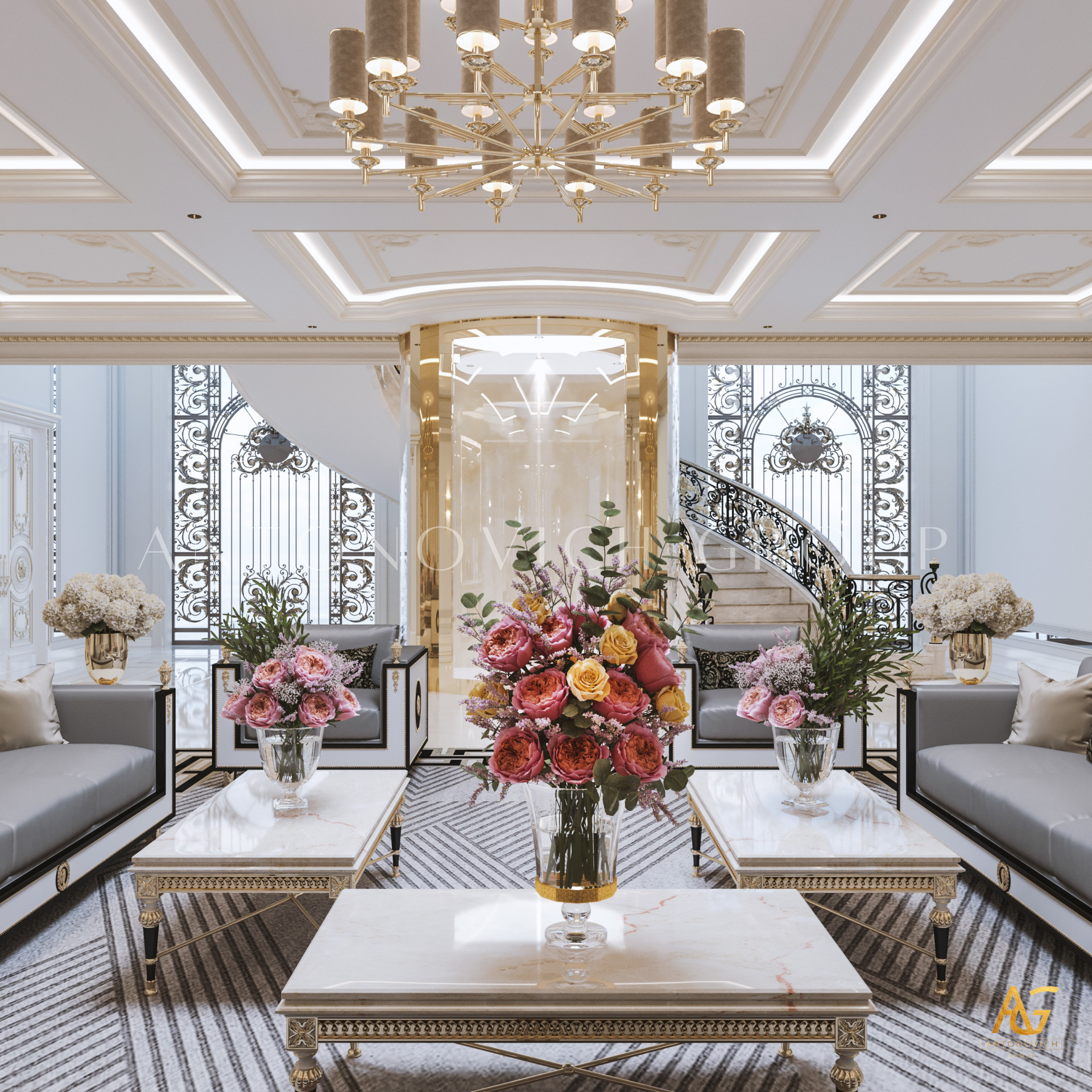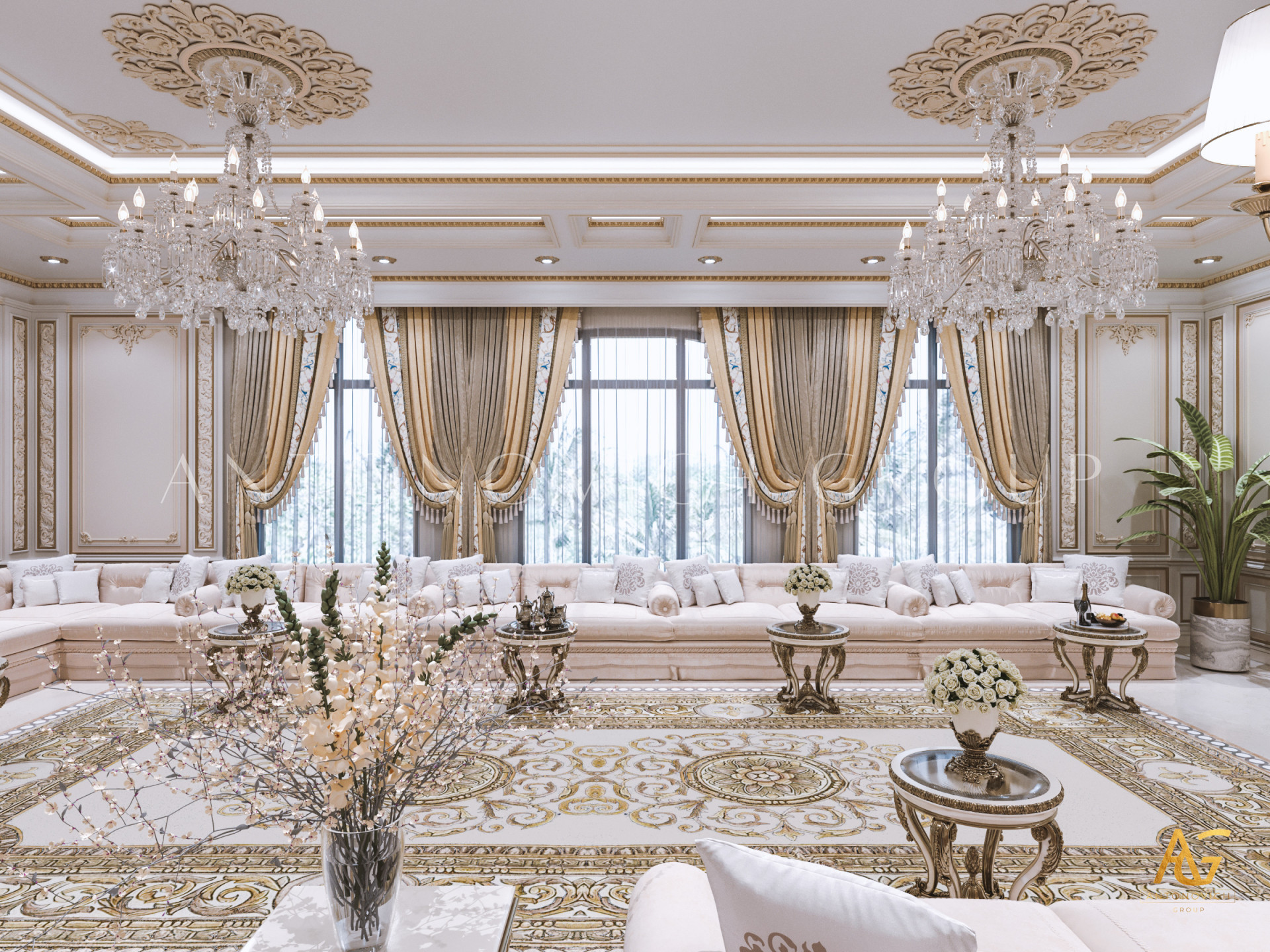 The grand foyer, adorned with a cascading chandelier and intricate marble flooring, serves as an impressive introduction to the villa's interiors. Classic architectural details, such as ornate moldings and archways, are seamlessly integrated with contemporary furnishings, striking the perfect balance between tradition and modernity.