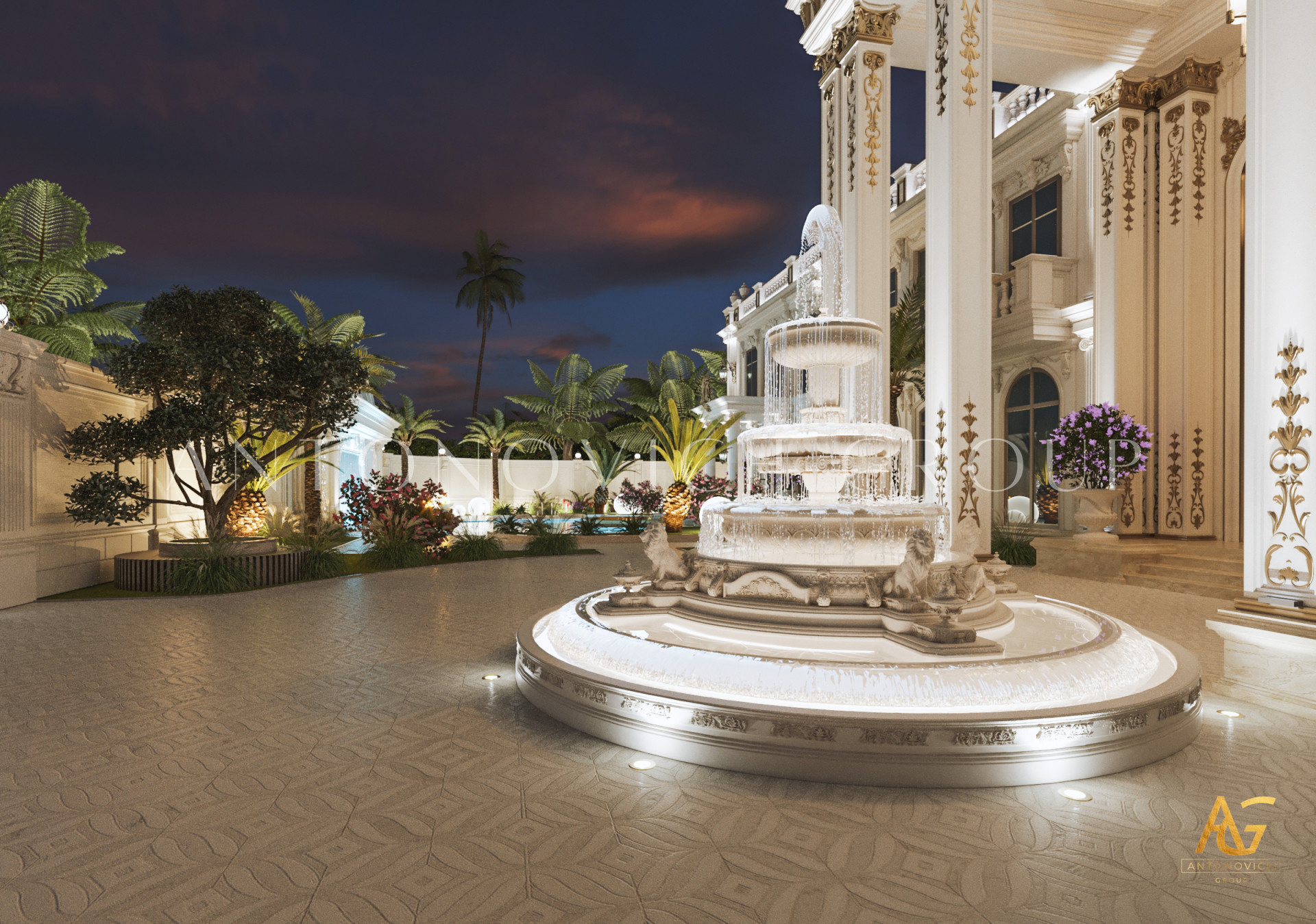 The entrance, adorned with majestic columns and a grandiose porte-cochère, beckons residents and guests alike into a world of opulence. The exterior lighting, designed with precision, transforms the villa into a beacon of sophistication as dusk settles, casting a warm glow that enhances the architectural details.