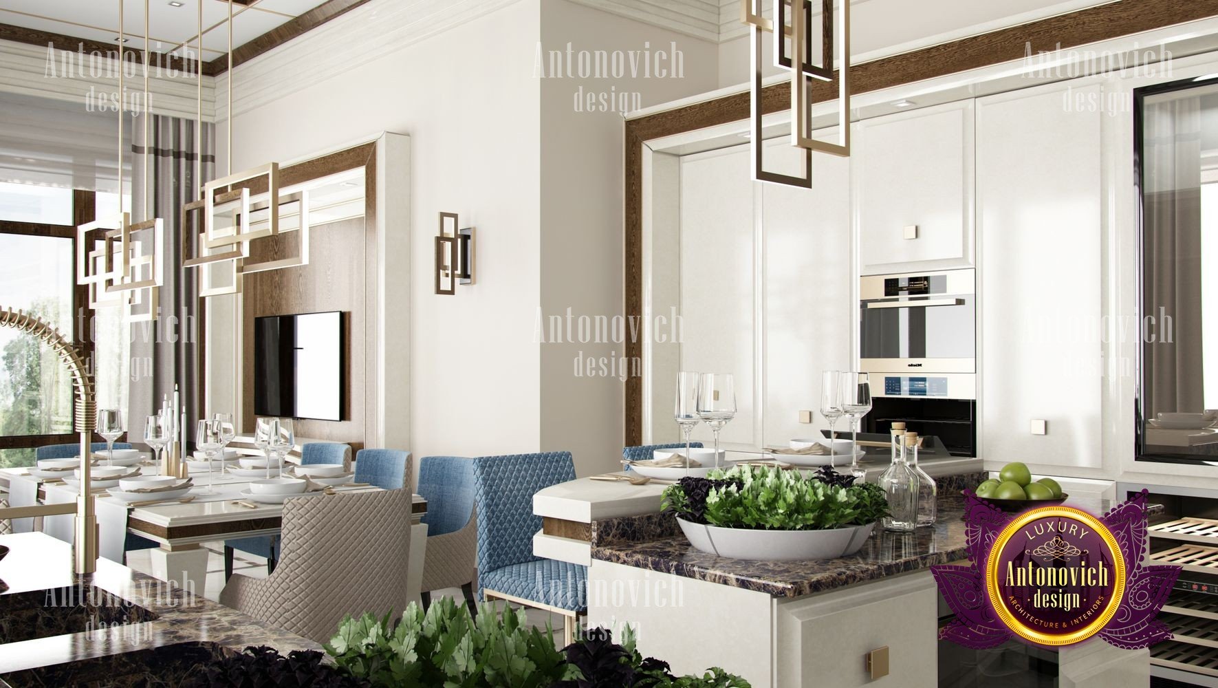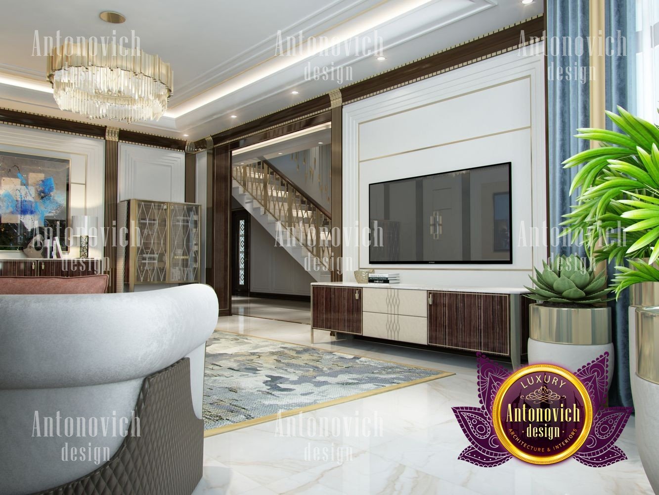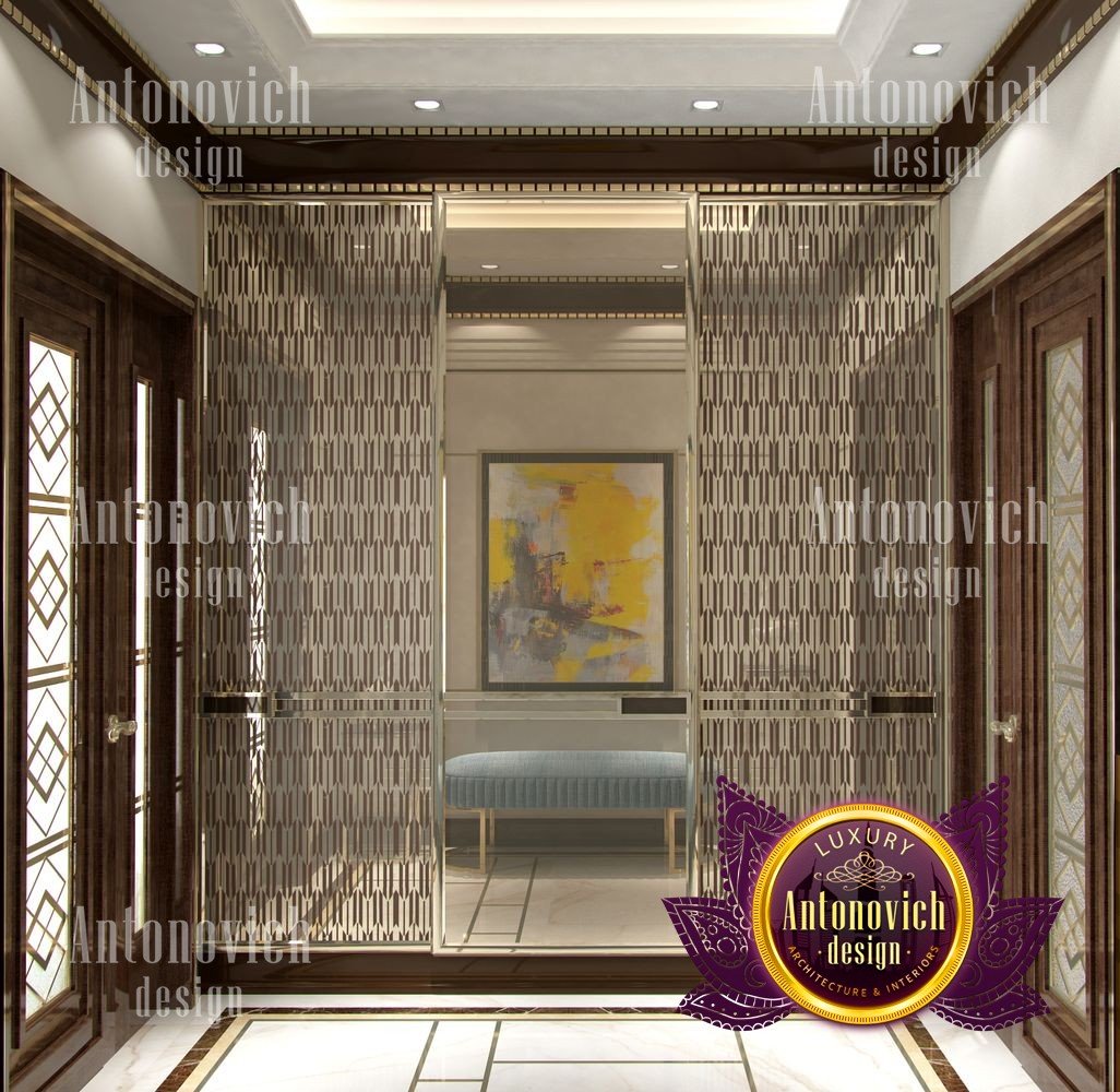 Stylish apartment interior in Dubai perfectly matches the stylish and contemporary nature of its owner. With his dynamic and active lifestyle it is very important in own home to be able to relax in a comfortable environment. Interior design in the UAE from the studio Luxury Antonovich Design is the creation of absolute comfort with a respectable character. Modern style in the interior acquired its easy and laid-back charm. Apartment Design Dubai has a lovely concise and clean lines. In the lobby, interior designers have taken chocolate shades as a basis. Glossy facades of the sliding door wardrobe reflect original features. And the gloss itself glitters with more luster, thanks to the abundance of accents in the form of LED backlighting. At the request of the owner in the hall additional seating area with stylish seating was organized. Saturated shades of the hall flow in more gentle hues of the interior. Apartment Design Dubai perfectly corresponds to the fashion trends of modern interiors. The focus here is in intellectual comfort. Living room is harmoniously combined with the dining room and kitchen. Quite spacious dining room speaks of the hospitality of the villa owner. Spectacular design techniques fill the interior with a special mood of warmth of home comfort. Thus, modern fireplace is built into the wall, which is decorated with natural stone in cool shades of gray. The ceiling lighting is decorated with lines, which along with original chandeliers illuminate the interior.