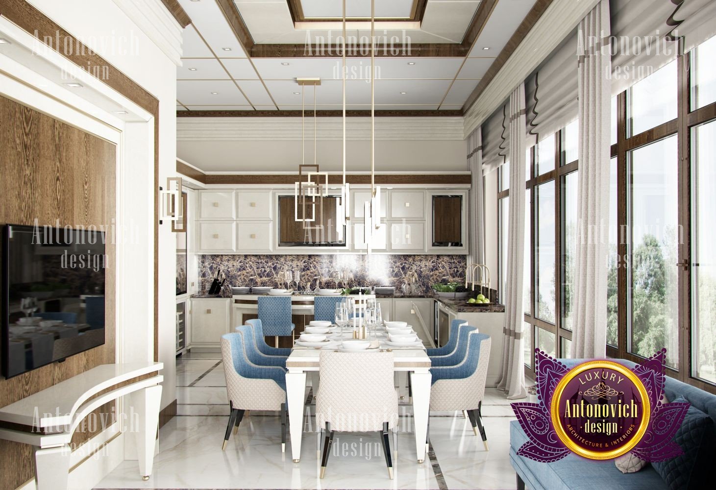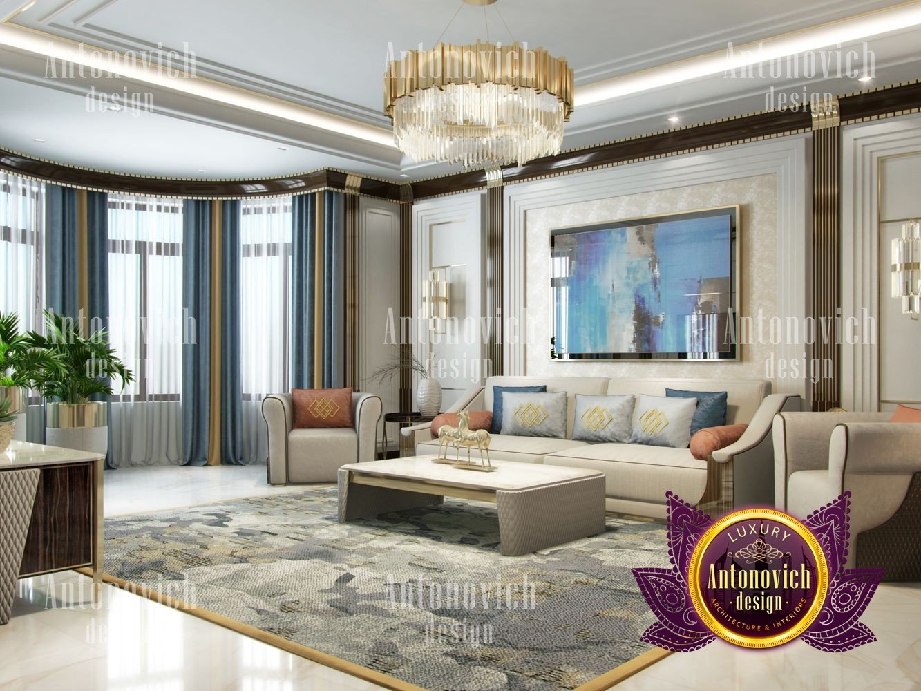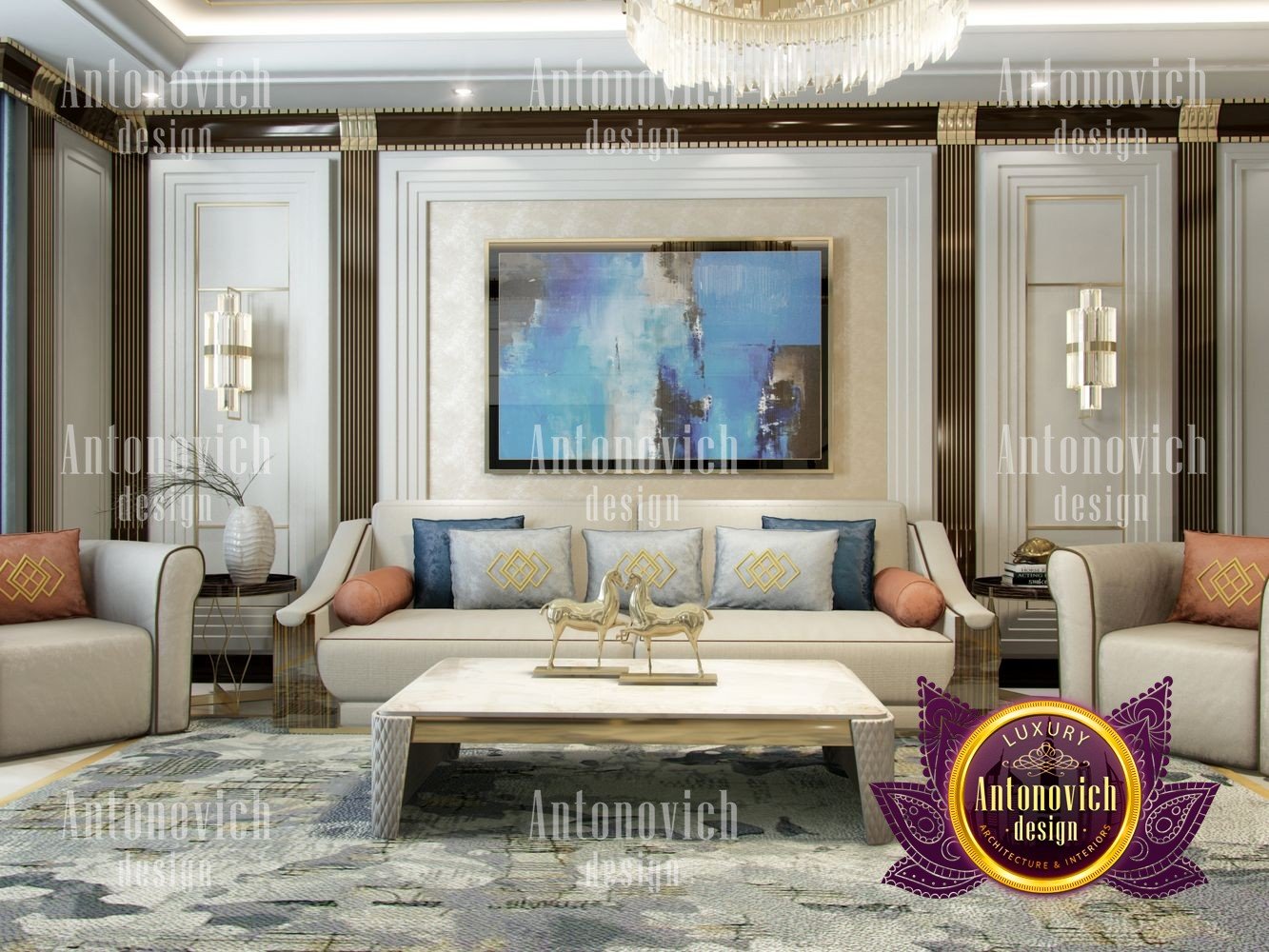 Stylish apartment interior in Dubai perfectly matches the stylish and contemporary nature of its owner. With his dynamic and active lifestyle it is very important in own home to be able to relax in a comfortable environment. Interior design in the UAE from the studio Luxury Antonovich Design is the creation of absolute comfort with a respectable character. Modern style in the interior acquired its easy and laid-back charm. Apartment Design Dubai has a lovely concise and clean lines. In the lobby, interior designers have taken chocolate shades as a basis. Glossy facades of the sliding door wardrobe reflect original features. And the gloss itself glitters with more luster, thanks to the abundance of accents in the form of LED backlighting. At the request of the owner in the hall additional seating area with stylish seating was organized. Saturated shades of the hall flow in more gentle hues of the interior. Apartment Design Dubai perfectly corresponds to the fashion trends of modern interiors. The focus here is in intellectual comfort. Living room is harmoniously combined with the dining room and kitchen. Quite spacious dining room speaks of the hospitality of the villa owner. Spectacular design techniques fill the interior with a special mood of warmth of home comfort. Thus, modern fireplace is built into the wall, which is decorated with natural stone in cool shades of gray. The ceiling lighting is decorated with lines, which along with original chandeliers illuminate the interior.