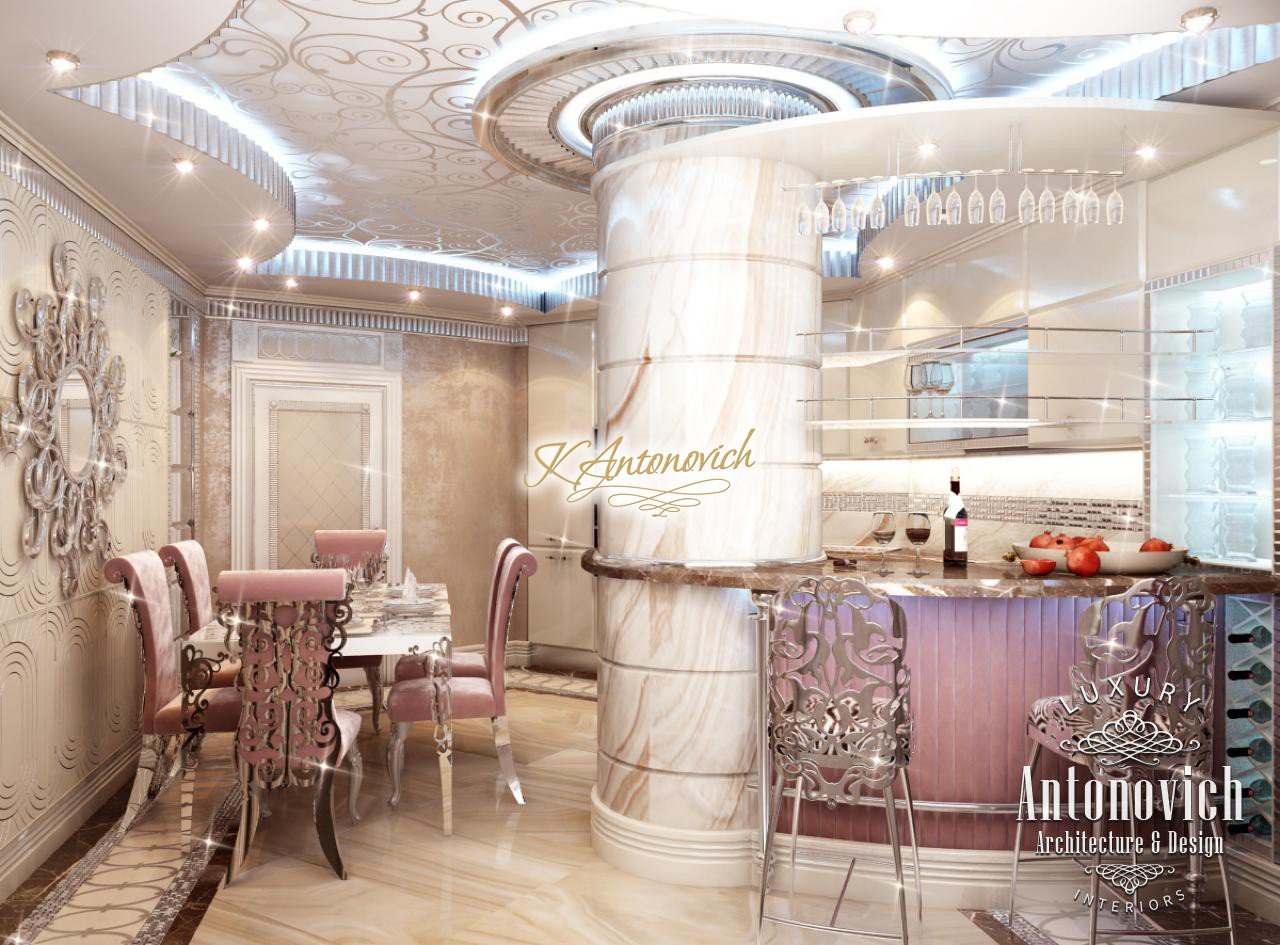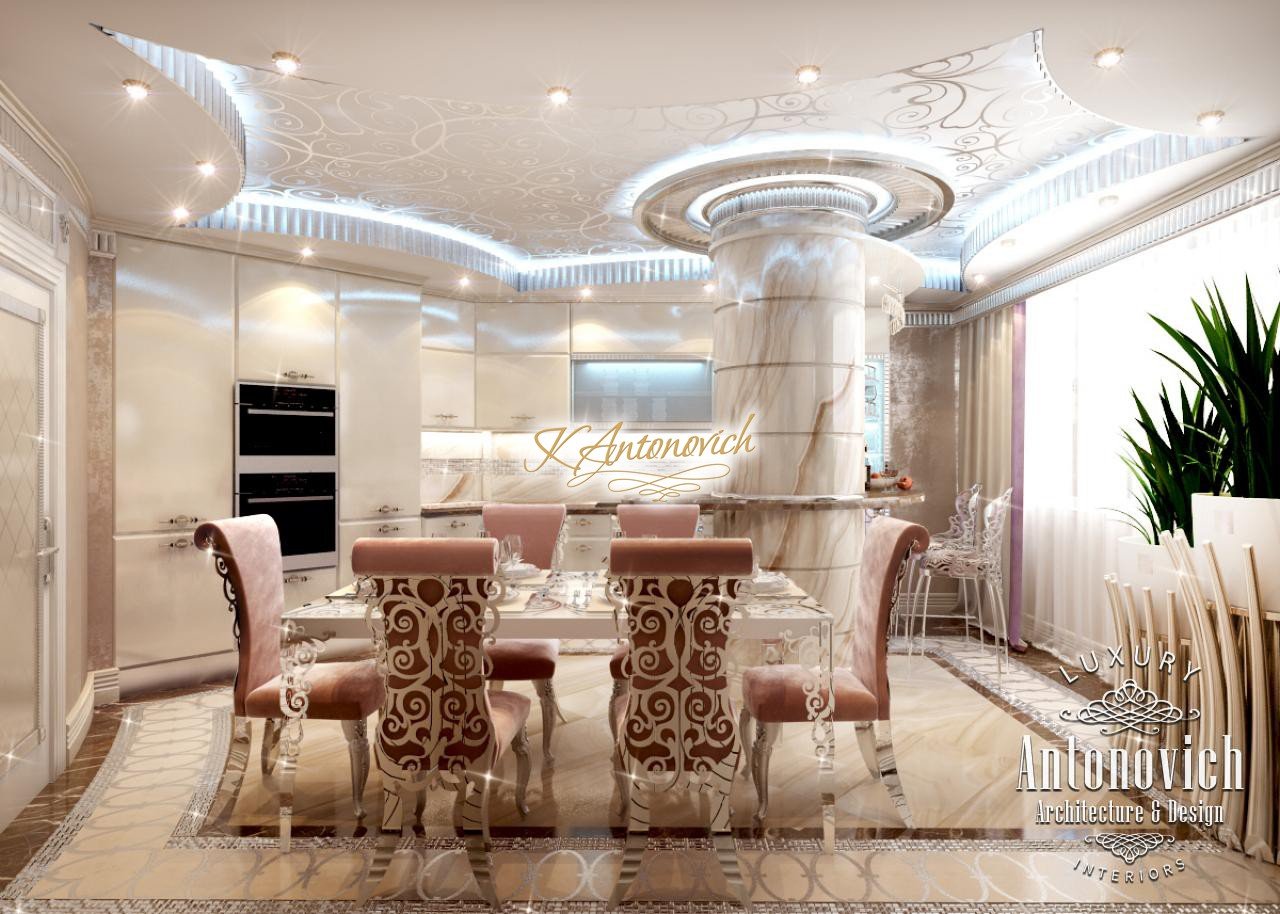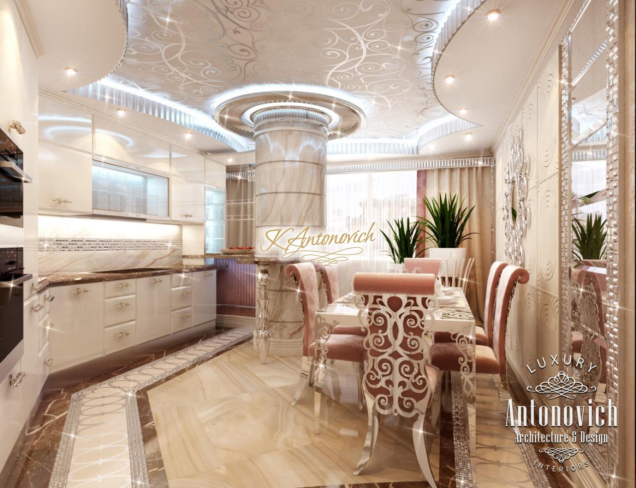 Elegance and sophistication of the owner of the apartment in Dubai are reflected in this beautiful apartment design in a modern style. Interior Designers Dubai caught the subtle mood of lightness and grace, and filled the rooms with luxury. Kitchen design fully reflects this conceptual direction. Luxury elegant character perfectly emphasizes the taste of the great owner. Apartment design in Dubai confirms that with the help of new technologies and new ways of lighting the most daring design ideas can be implemented. The interior was very luxurious and expressive. A striking element of the decor was a large round column with decorative plaster with marble texture. It is perfectly in harmony with noble marble floors of light shade. The lightness and freshness of the interior is based on a range of light shades. The snow-white surface of the ceiling is decorated with lace patterns of swirls and lines complemented by soft lighting. Interior designers Dubai replaced a traditional chandelier with LED backlight, which further surrounds the column in the area of the ceiling, and ceiling lights that are placed around the perimeter. The highlight of the interior was the dining area. High soft chairs decorated with lace elements of polished metal. Kitchen interior design is complemented by charming details in the form of mirror panels and elegant accessories.