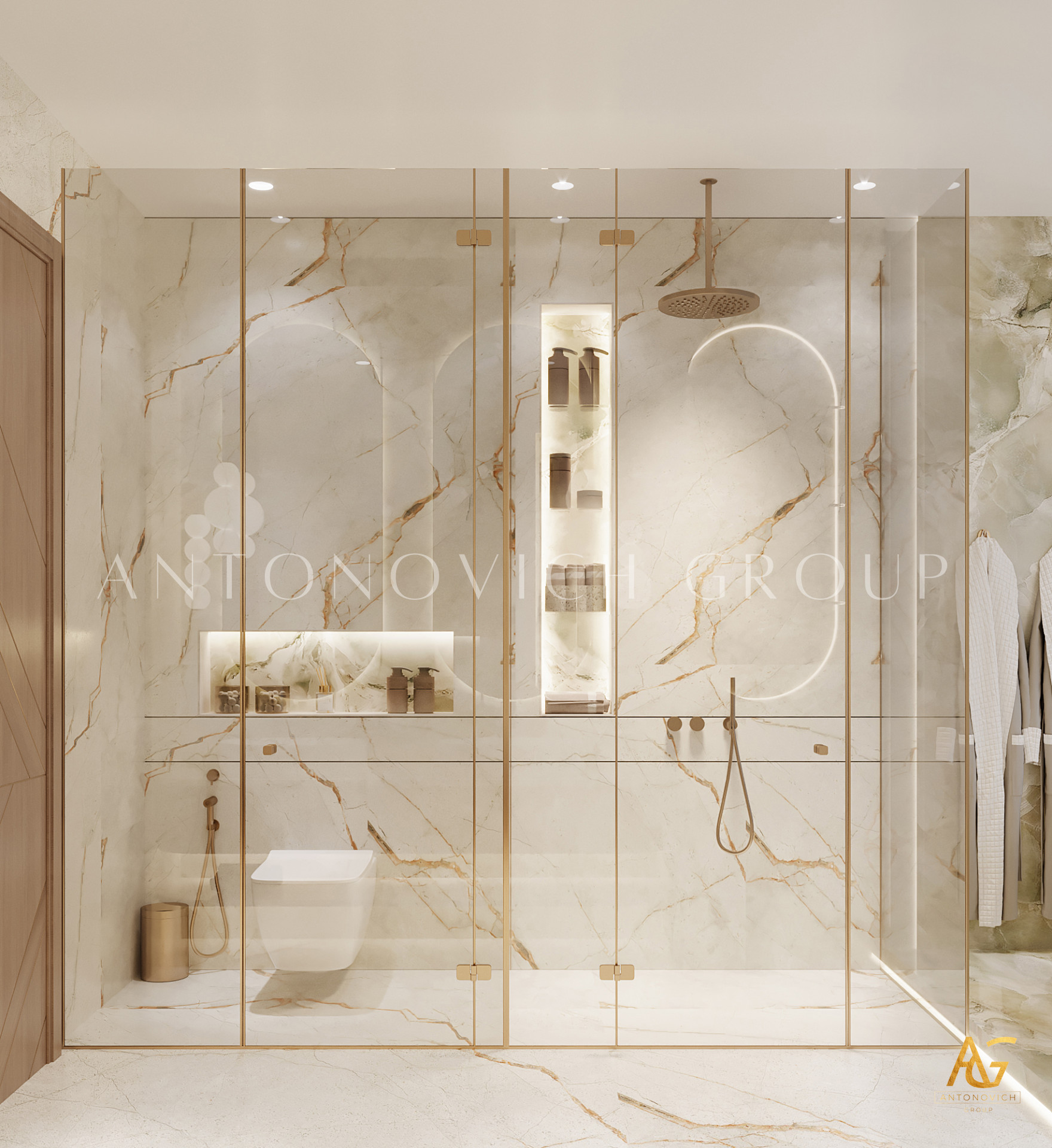 Each authors project by design studio in Dubai Luxury Antonovich Design has its own unique character. In every interior designers add zest and spectacular decorations. Luxury villa design in Dubai is luxury in every square meter. Bathroom design keeps the harmony of classical luxury, which is present in the rest of the space. In the interior you feel pleasant warmth of a sunny day. Warm shades of gold, cream and peach form the basis of this charming bathroom interior. Elite status of the place is emphasized with carved frames, covered with gold leaf, floors made of natural marble with carved patterns and luxurious curtains of precious silk. Round bathtub is raised on a low podium. The window is decorated with luxurious curtains in a classical style. Graceful accents of the classical style became two half-columns with stucco capitals on each side of the bathroom.