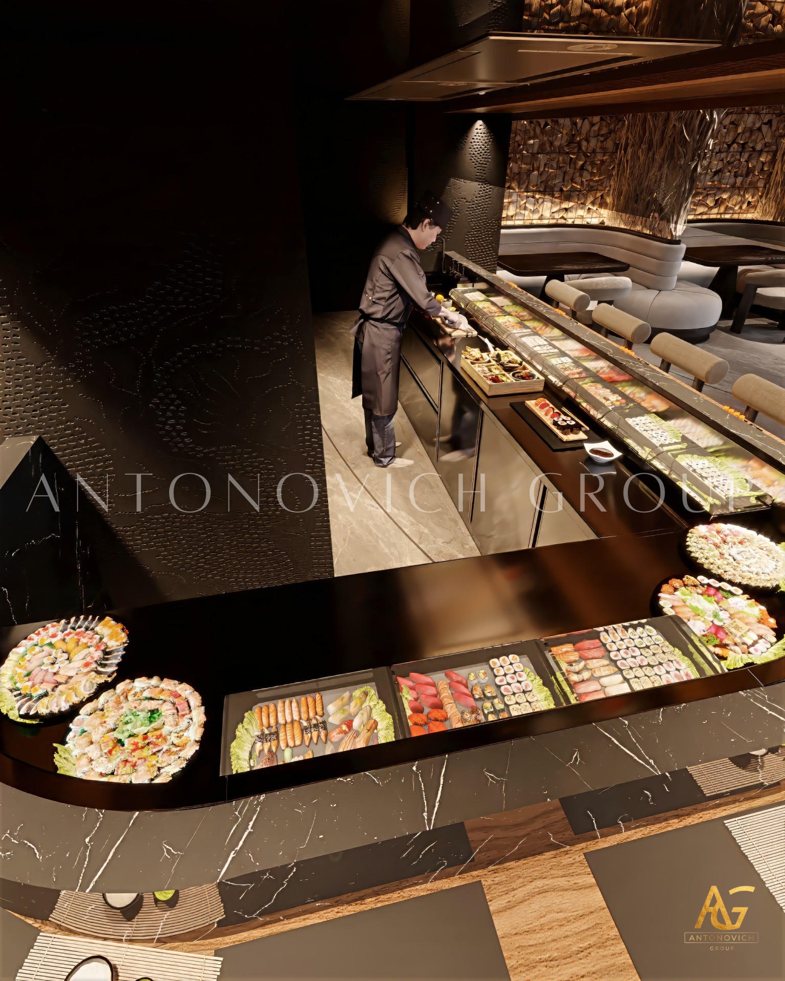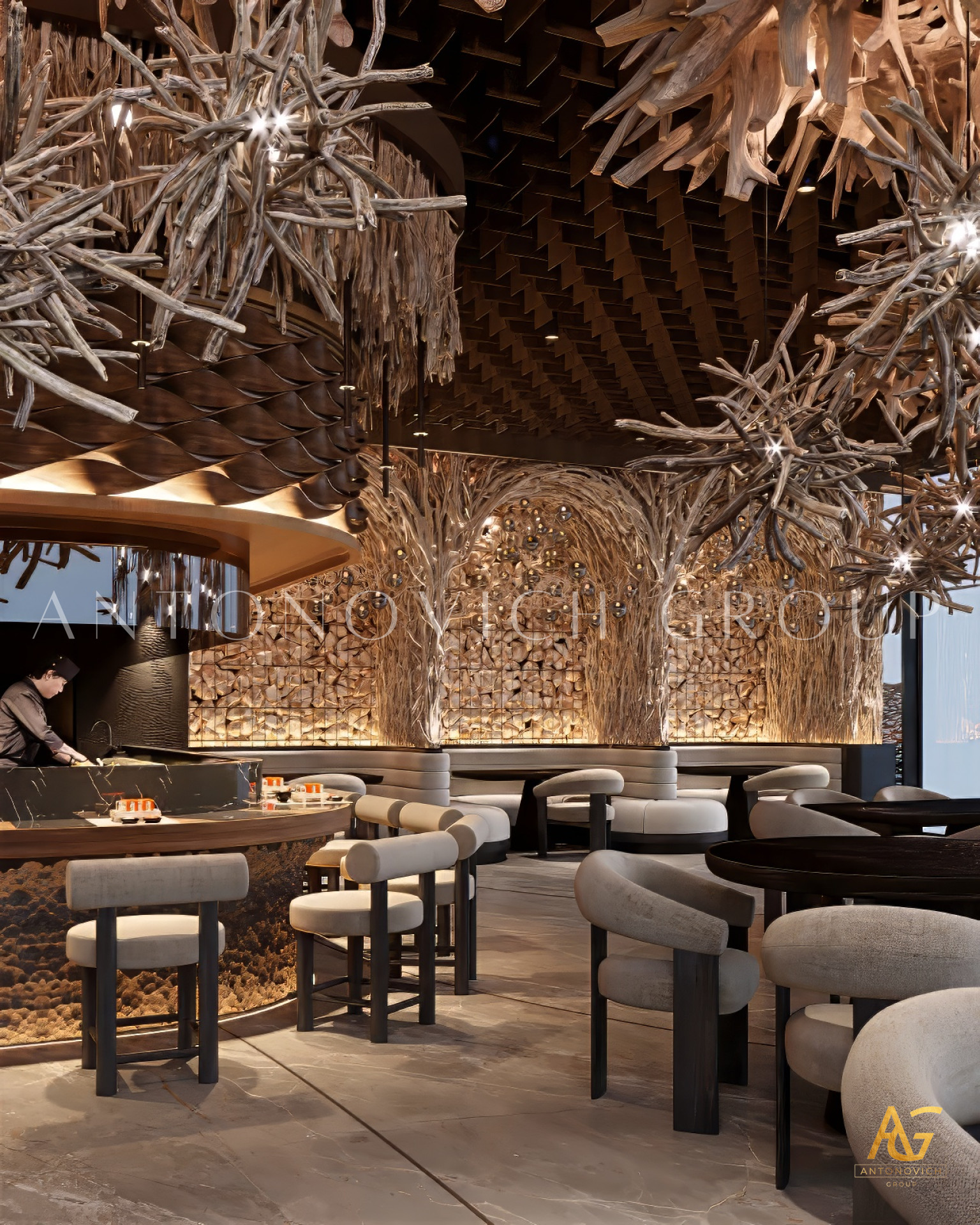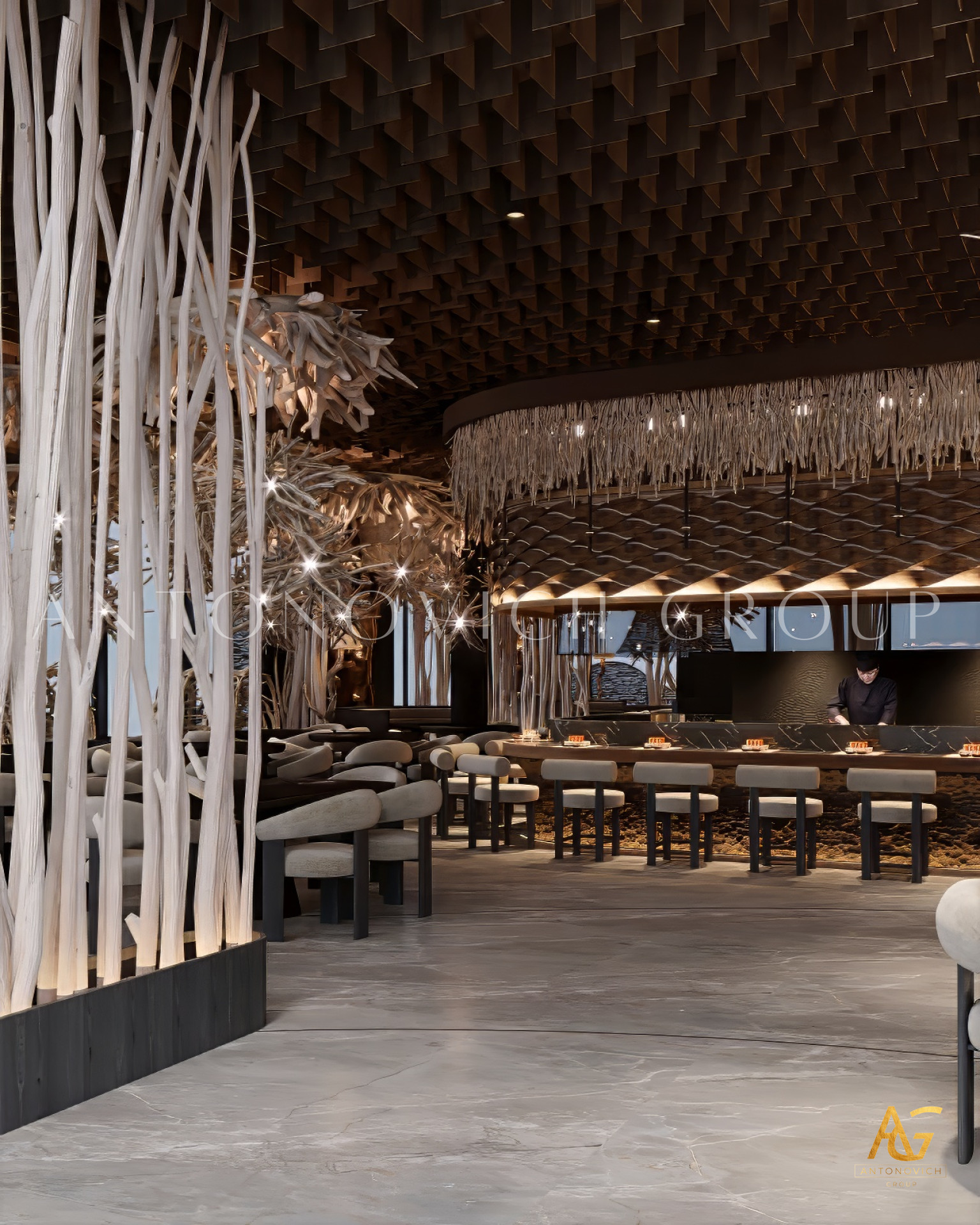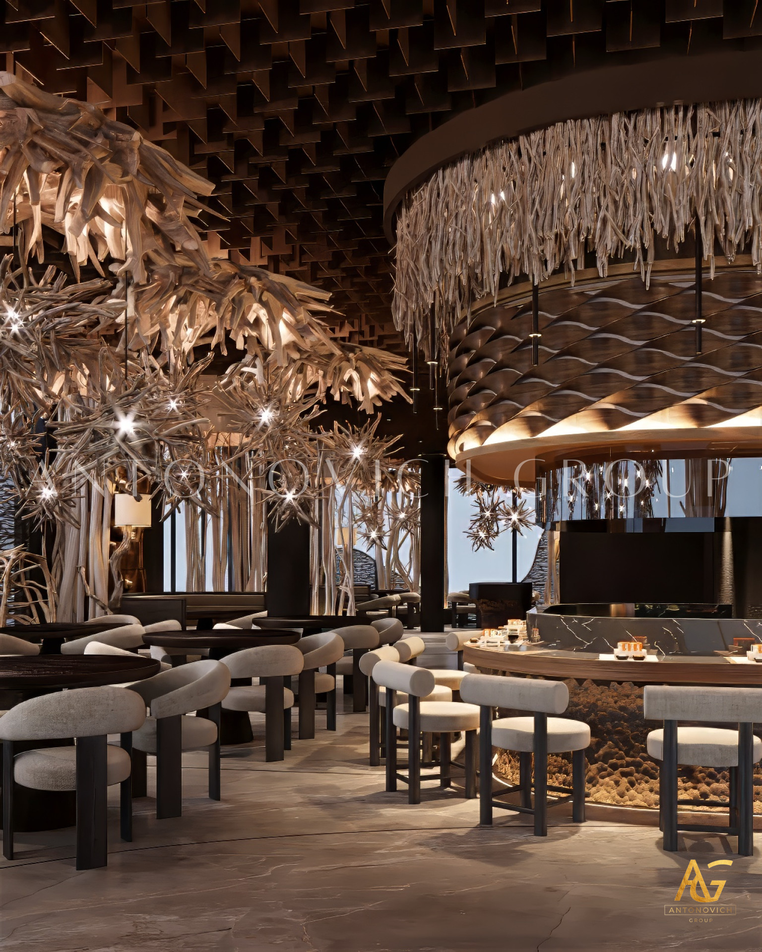 Author's design project of the restaurant emphasizes the elite status of this place. Design studio in Dubai Luxury Antonovich Design creates a luxurious houses, apartments and public buildings design. This complex project included the architectural design of the restaurant interior. Exquisite architectural image with open terraces, rounded shapes and large windows is a masterpiece of architecture. The facades design attracts with its beauty and its interior design amazes and cozy atmosphere makes customers return to a favorite restaurant again and again. Luxury restaurant design perfectly underlines respectability and luxury of this place. There a large group of people can rest comfortably as well as, simply to spend a romantic evening together. Dubai Interior Designers created a luxurious restaurant interior, which is fully consistent with the concept of the exquisite place. The restaurant interior in the style of Art Deco has a bright and refined character. A delightful combination of comfortable upholstered furniture of milky and rich pink base sets a festive mood. Interior Designers Dubai masterly play contrasts, shades, materials and textures. The floors are made of black marble decorated with themed design. Mood light romance is set with curtains of milky silk. Colorful accents became fine columns, capitals , which continue harmoniously decorated ceiling. The interior design Dubai by Luxury Antonovich Design is an elite and luxurious image of modern interiors.