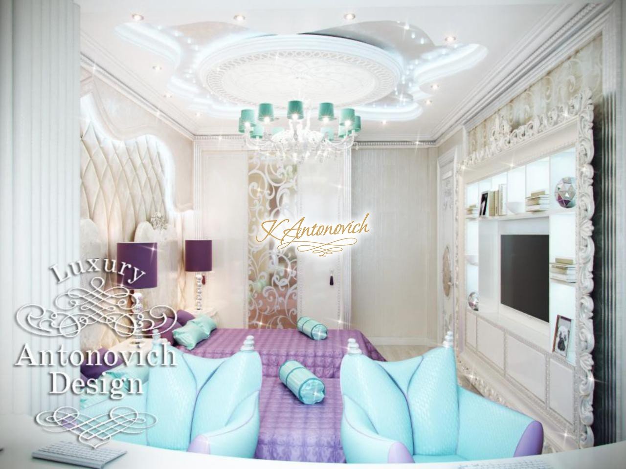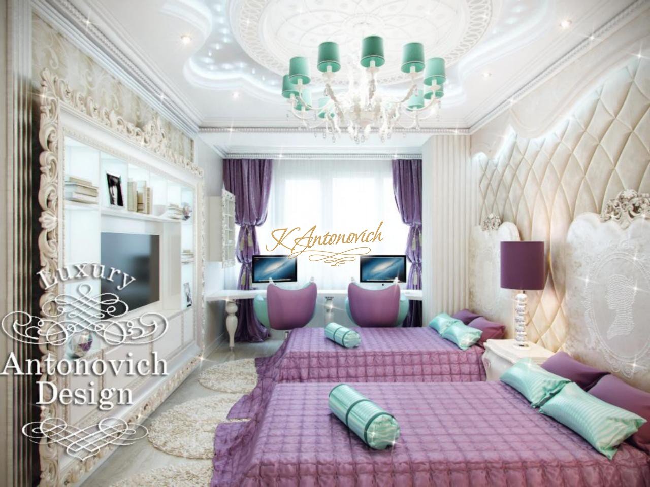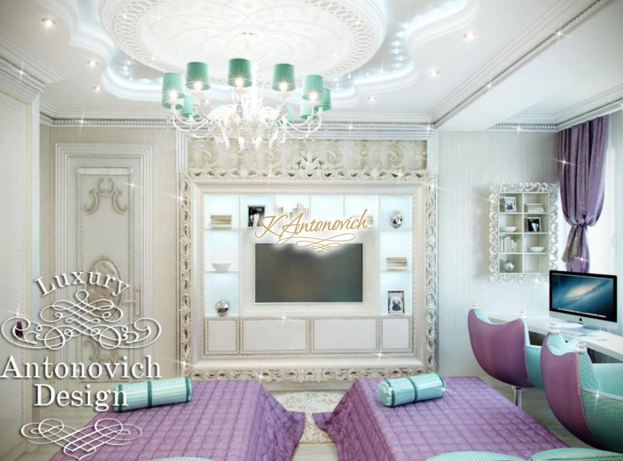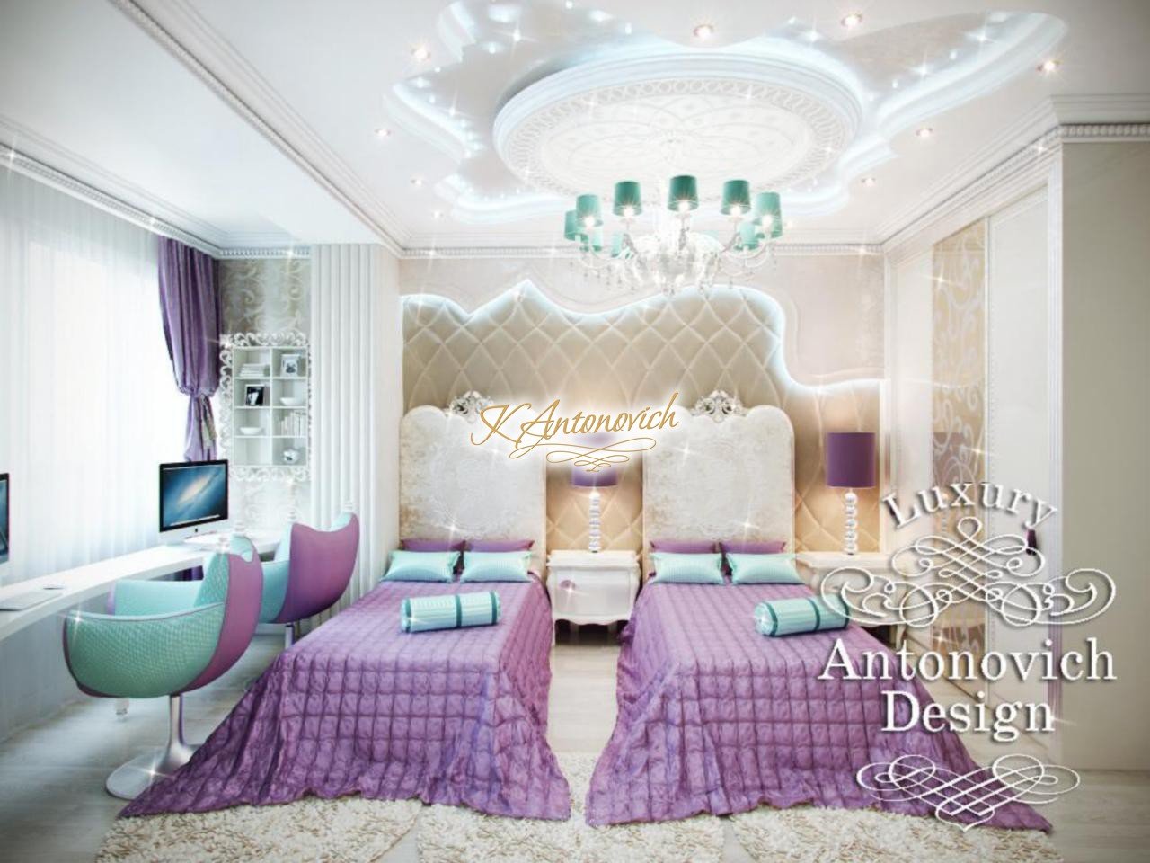 In the interior there is a very bright and sunny mood. Juicy colors of purple and turquoise set off wonderfully crisp white and cream notes. Childrens room interior design for two daughters of the apartment owners in Abu Dhabi amazingly underlines the bright and cheerful characters of the girls. Interior Design Studio in Abu Dhabi offered a luxury version of the design, blended harmoniously the classical style and Art Deco. Interior Designers Abu Dhabi in each work combines traditions and innovation. Along with the traditional methods of interior lighting, authors of the project use modern LED backlighting to accent. The lines delineate the boundaries of the niche on the ceiling and wall decor over a soft textile panel. Chandelier with emerald shades exquisitely plays up with the pillows on the comfortable beds. A quilted silk bedspread is in harmony with curtains on the windows. The massive carved frame that surrounds the cabinet with open shelves looks refined and luxurious. Childrens room interior design ideally helps to educate the childrens refined taste and understanding of beauty. In the room each of the girls will feel comfortable and cozy.
