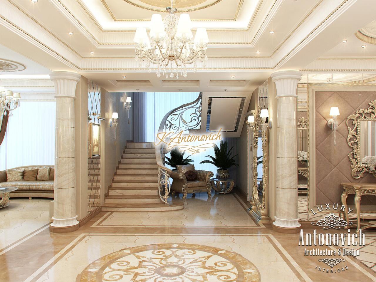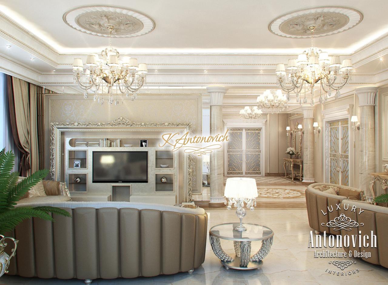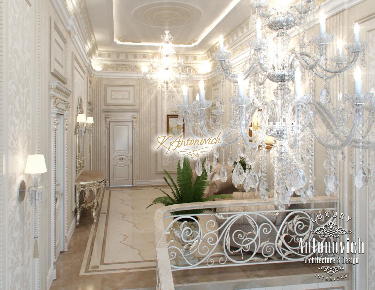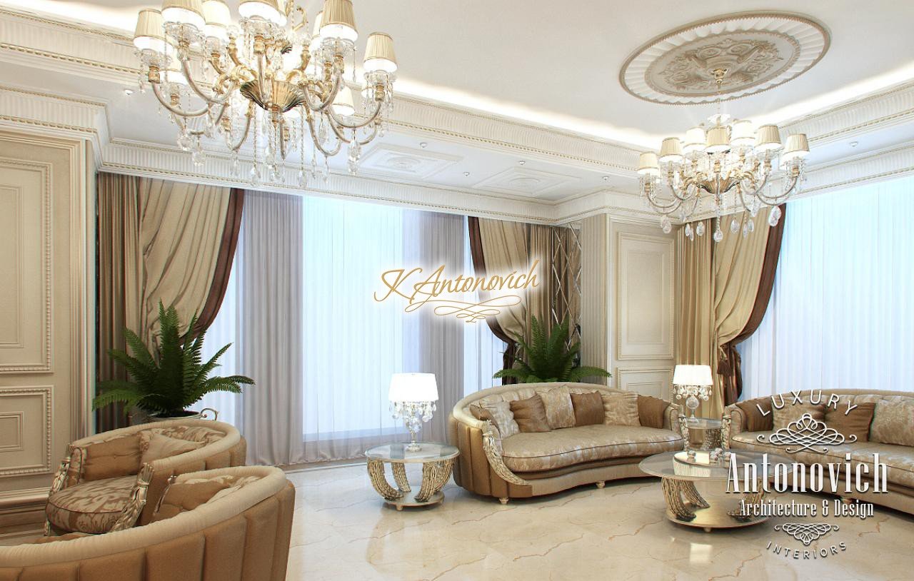 House Design Abu Dhabi with a very warm and refined mood combines classical and modern art deco accents. Design studio in Dubai in this author's project combines fine traditions and daring original solutions without leaving the main idea, which is apparent in the design concept of the interior. The main idea is a great feeling of warmth and homeliness, feeling of absolute comfort. Interior Designers Abu Dhabi masterly arranged the space at home, emphasizing the advantages of its architectural plan. Great hall of rectangular shape is decorated with marble pilasters with white capitals, carved marble floors, mirrored panels and luxurious furniture with carved decoration and gilding. Soft wall panels in the interior of the hall are covered with cream-colored velvet and on this background gilded carved mirror frames look great. On the second floor of the house staircase with a wrought-iron balustrade is magnificent. House Design Abu Dhabi gives a sense of delight from the beautiful image in each square meter of the interior. Magnificent crystal chandeliers and mirrors filled the apartment with festive mood. The spacious living room is divided into two zones. One area is a cozy corner with a fireplace and two comfortable armchairs. Marble fireplace looks especially luxurious, thanks to the large mirror panels with facet, which will decorate the wall above it. Coffee and beige shades in the upholstery and window decoration look stylish on the background of light cream-colored marble. Interior Design Abu Dhabi perfectly reflected the wishes of all home owners, emphasizing their exquisite taste and high status.