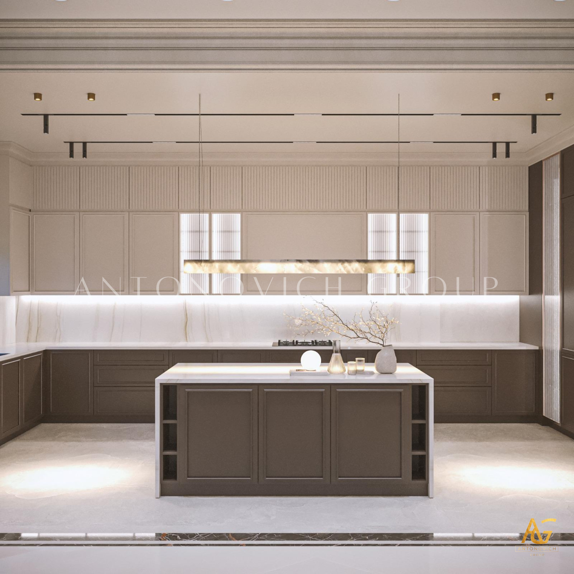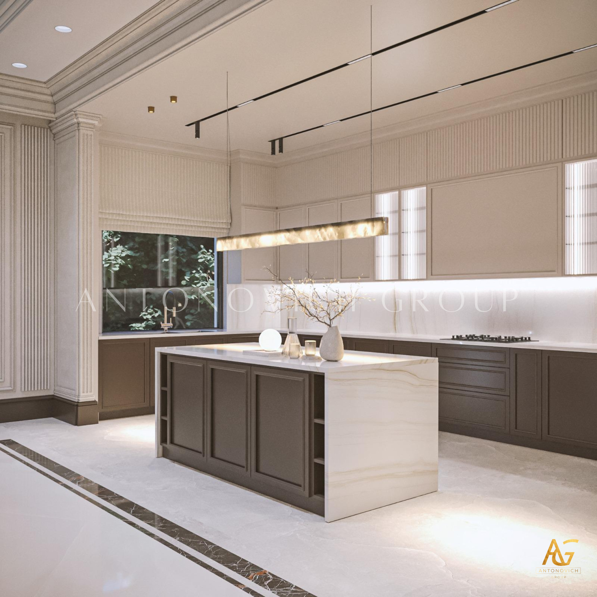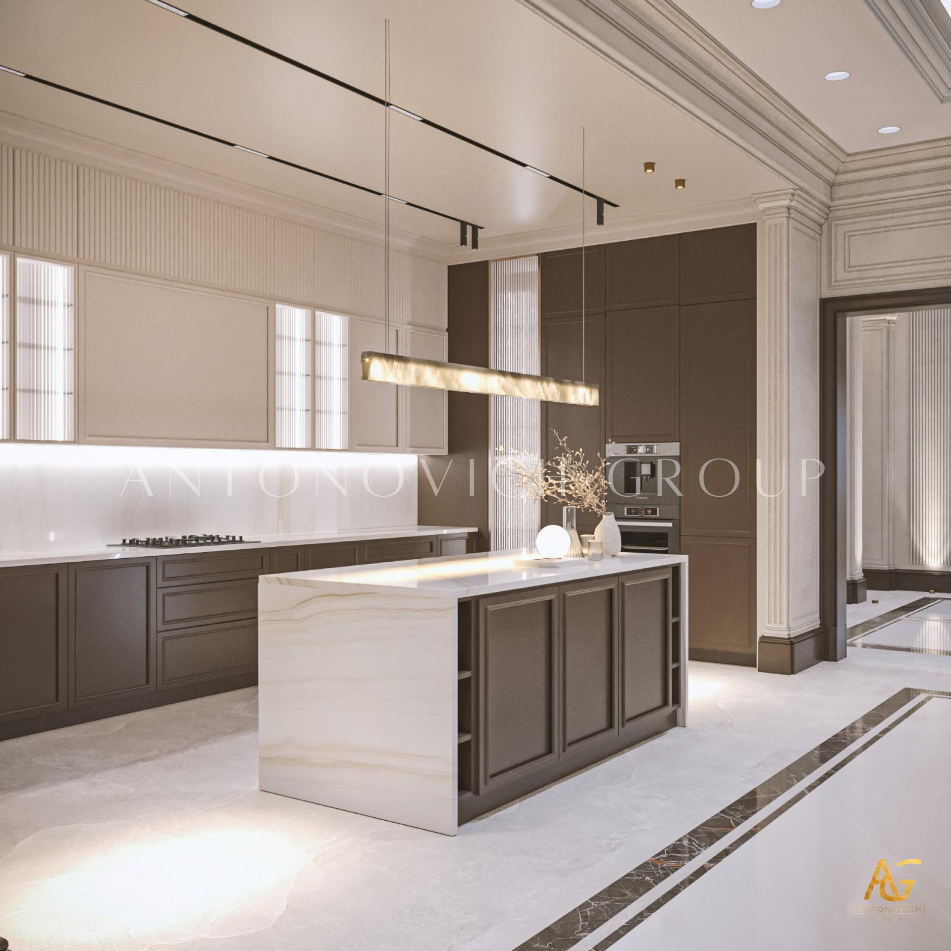 The villa design Abu Dhabi is an enchanting mix of Art Deco and modern style. The luxury of a new era, which design studio Dubai Luxury Antonovich Design offers its customers, combines innovative ideas and traditions. Kitchen Design became concise continuation of the design concept of the house. Spacious apartment on the first floor has combined kitchen and dining area. These apartments are equal in size to the apartment of cozy living room. In such a luxurious interior you feel light and harmony. The interior is not loaded with unnecessary details of decor, but still looks very elegant and refined. Interior Designers Abu Dhabi for zoning of the space used two massive elegant art deco chandeliers with large crystal pendants. To create a dynamic mood and sense of harmony the ceiling is divided into several niches of rectangular shape. Stucco, LED lights, mirror elements, all of this together forms a complete image of the ceiling decoration. Additional ceiling lights enhance luster of the luxury interior. The kitchen is full of exquisite details. For example, to distinguish kitchen and living room interior designers offered by two graceful columns with silver capitals, between which crystal beads fall.