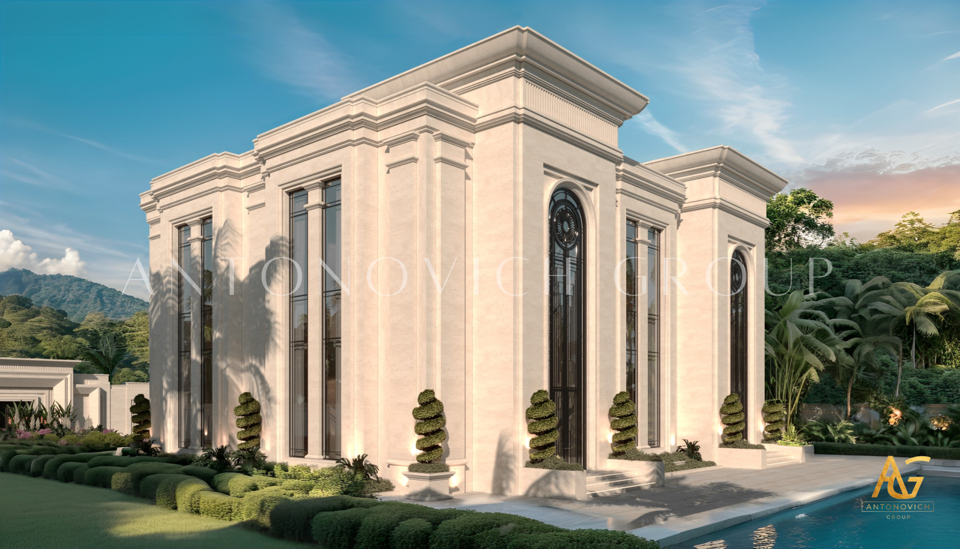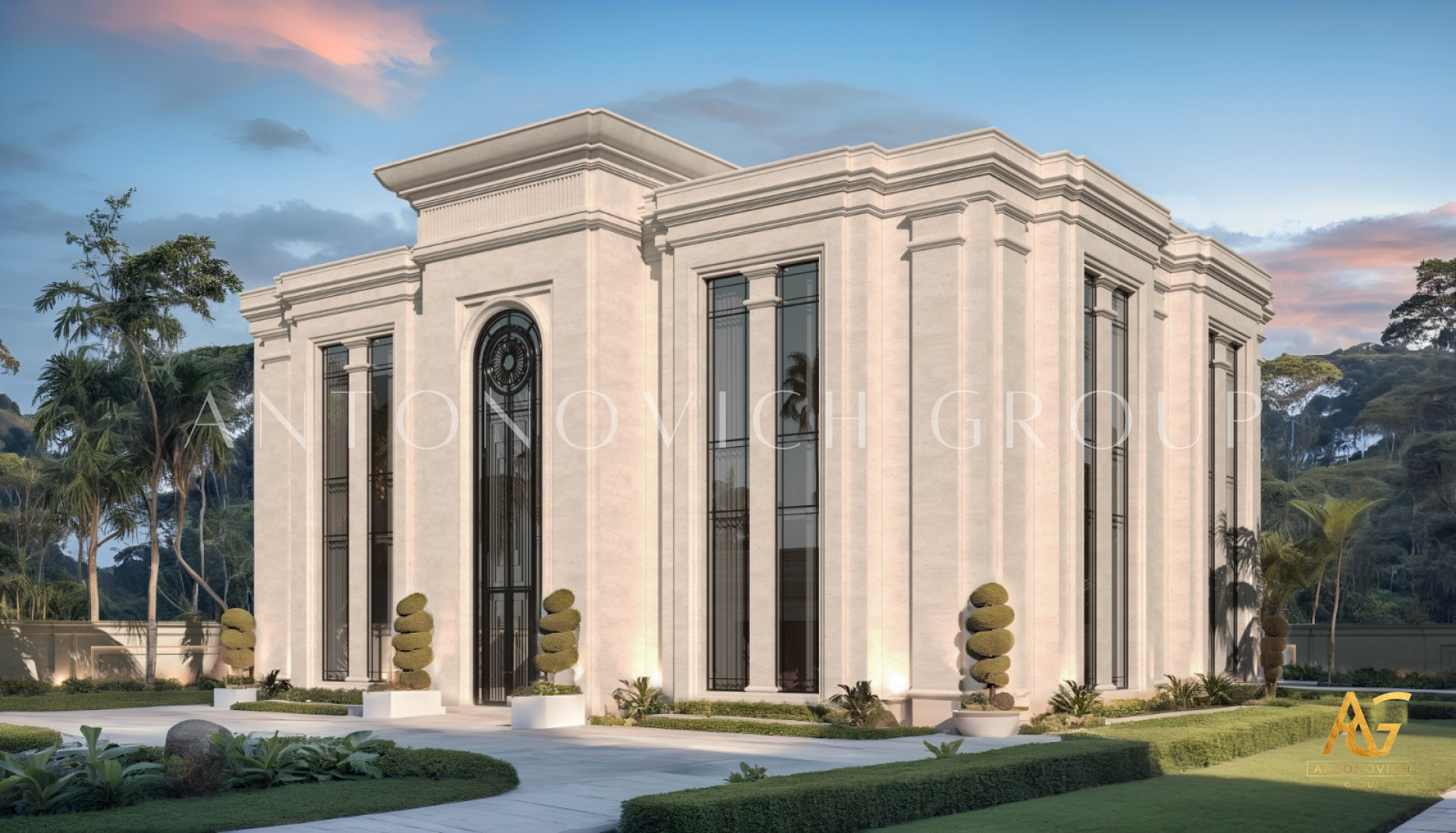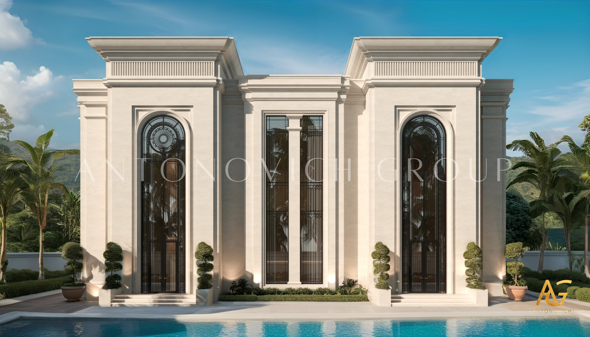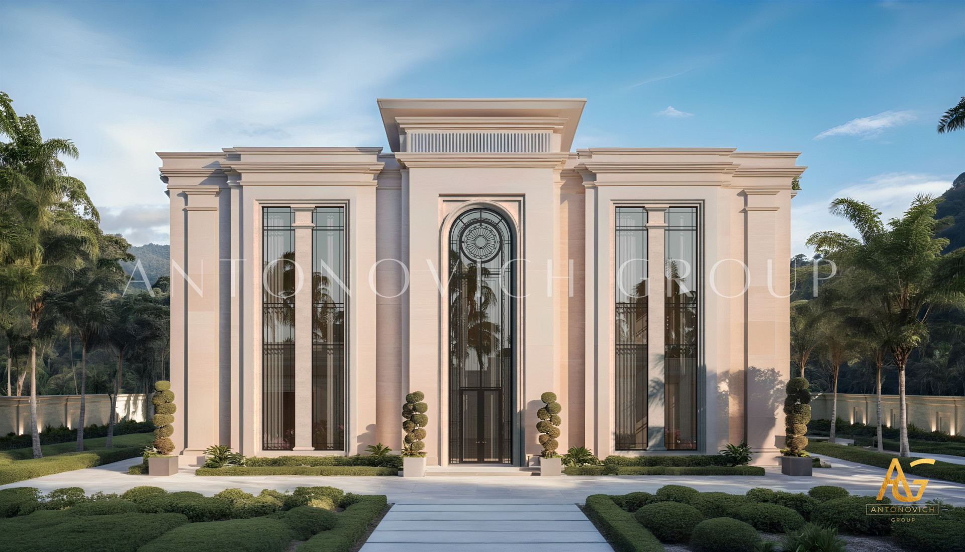 The best solution that design studio Dubai Luxury Antonovich Design offers, primarily is based on the dreams and wishes of our customers. House design in Abu Dhabi has become the dream of its owners for their own luxury home. The villa exterior design in Art Deco style perfectly matches the interior. This style is still on the wave of popularity. Exterior Design in Art Deco represents the eternal celebration of life. The villa image is light and easy. The exterior design emphasizes beautiful architectural solutions. Bright building with plenty of outdoor terraces eloquently alludes to the fact that the owners of the house are hospitable people with an open and friendly character. The perfect organization of space at home is based on competent architectural and engineering solutions. And the villa exterior design in Abu Dhabi emphasizes the benefits. Open terraces are delineated with a classical balustrade. A visual harmony and lightness of the building are given by square columns with elegant capitals. Light and airy of the building are added by curtains of light silk in the terraces design. In this authors project modern and art deco harmoniously intertwined. As the basis designers took bright colors and natural materials with texture. The respectable image of the house is elegantly complemented by bas-reliefs with elegant curls of authors patterns that play beautiful with the light in the sun. The villa exterior design is a great way to emphasize the elite status of the object and impeccable taste of home owners.