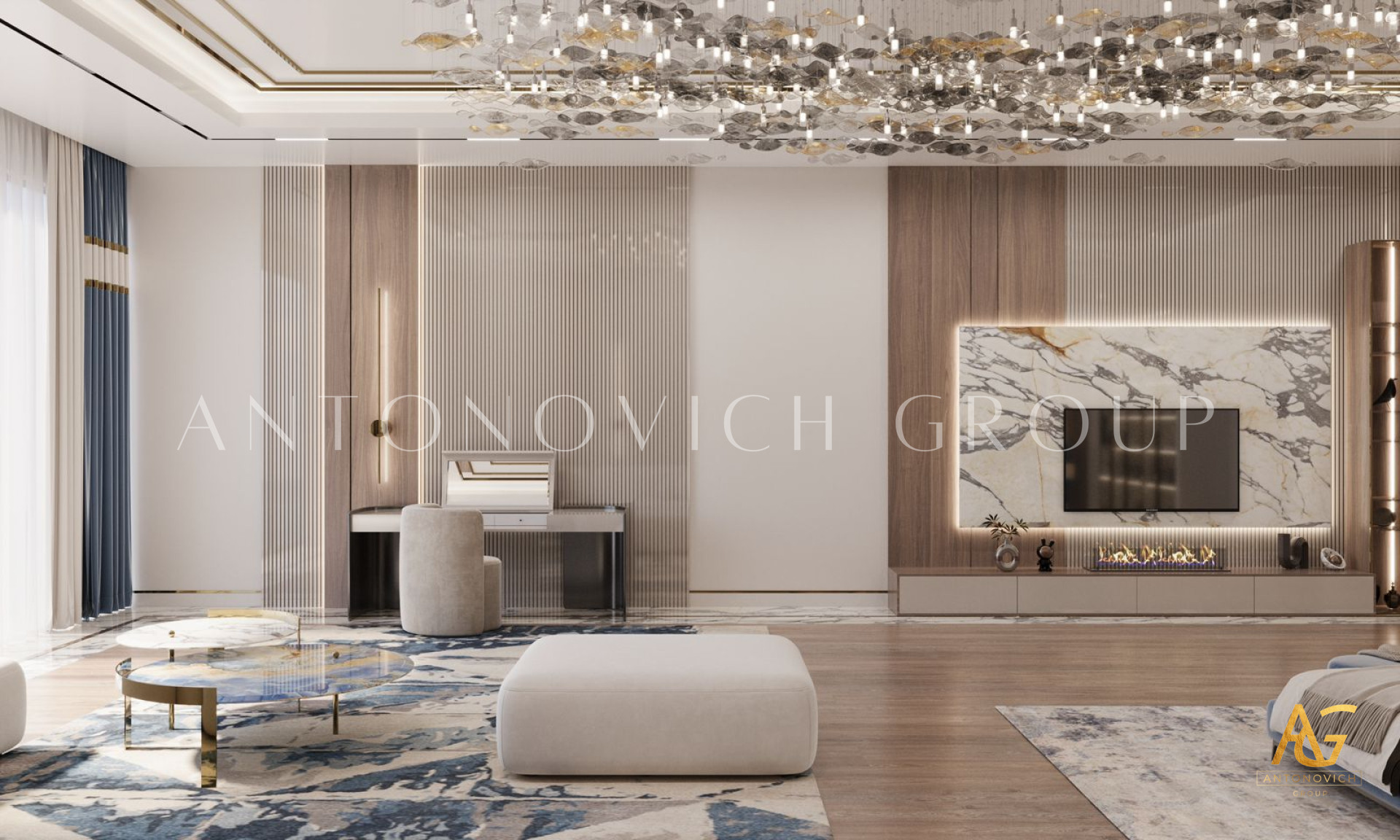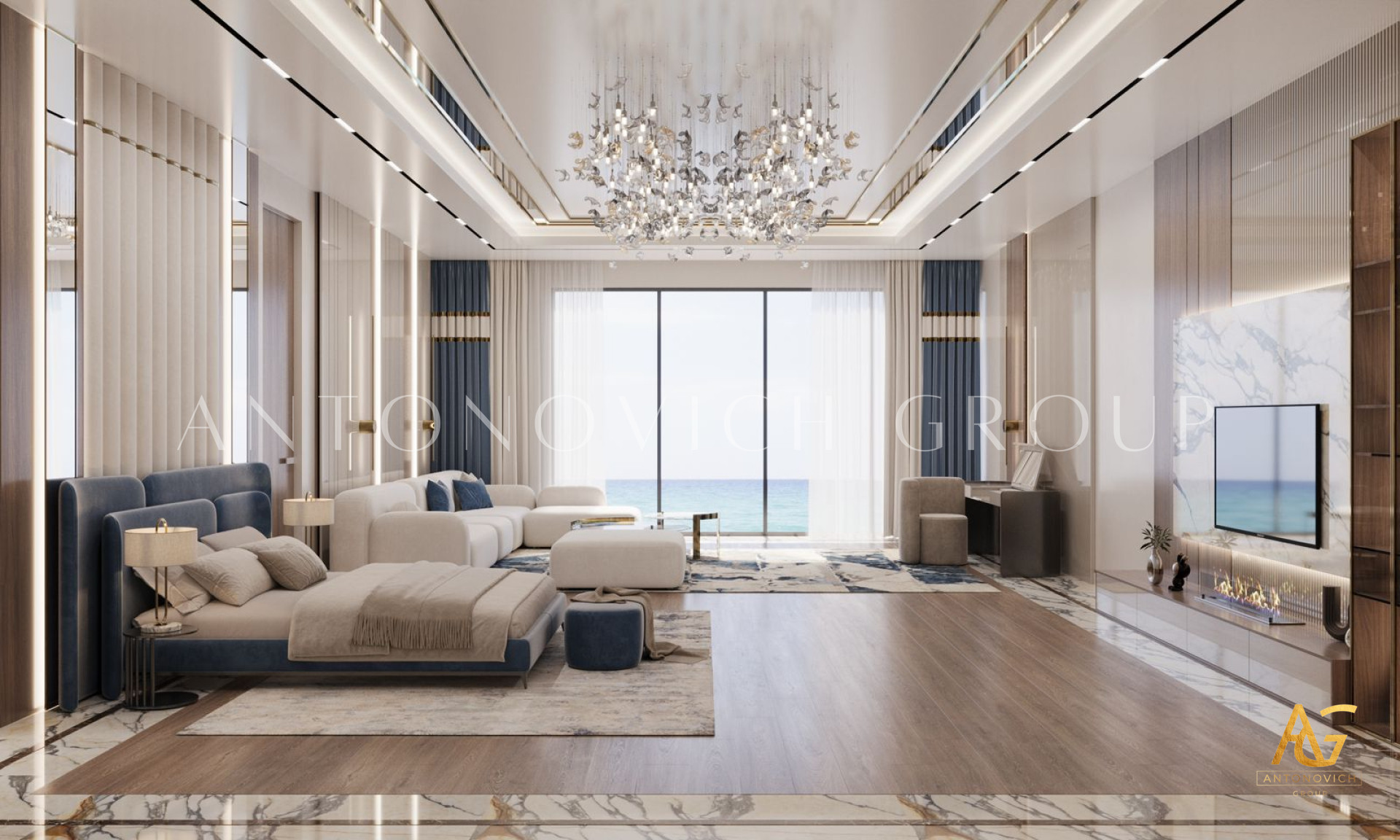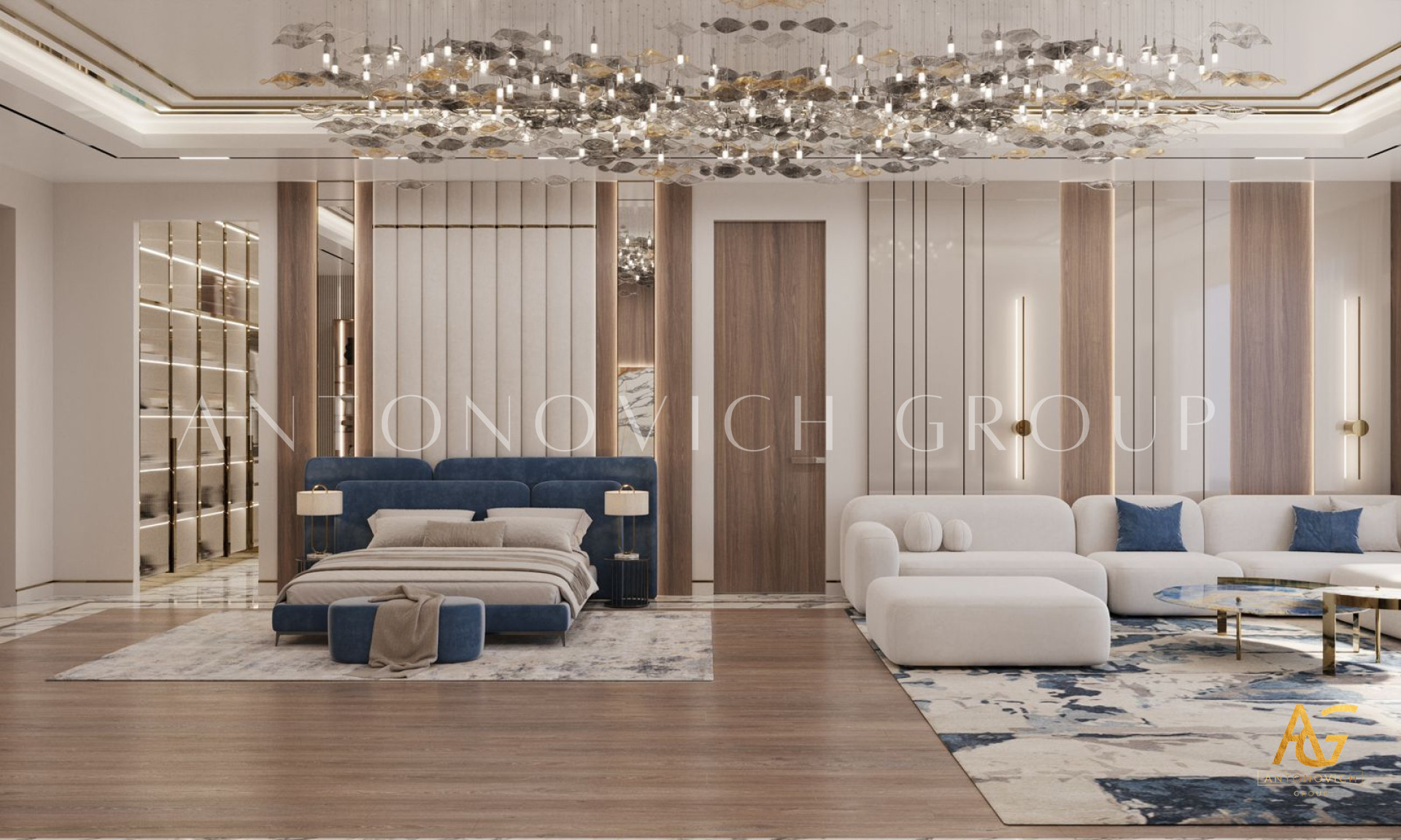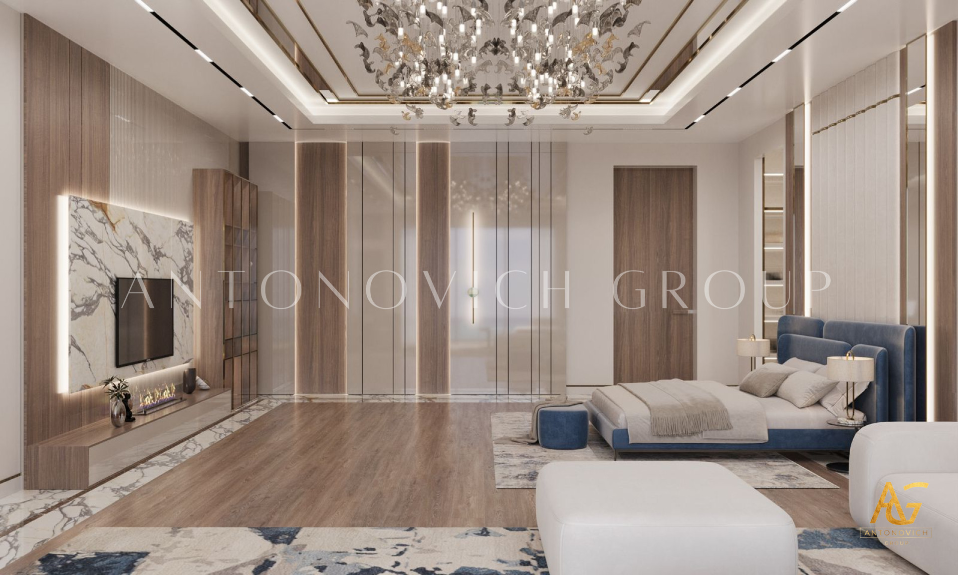 Bedroom design can keep as the overall look of the entire interior house or apartment, as have separate interior story. Villa Design Dubai is in the style of modern classics. The style, which combines fine traditions and modern trends in interior design, the project of the studio Luxury Antonovich Design becomes a bright personality. House Design Dubai included design and engineering of several bedrooms. Each bedroom is incredibly beautiful in its cozy and intimate way and seductive notes. If the old classical interiors decorated with swirls of ceiling stucco decoration and solemn chandelier, today these magnificent moments added new methods of illumination. Lines of soft lighting, internally illuminated niches complement light and shade on the stucco decoration. In bedroom design harmoniously design of windows integrates, walls decoration, floors, and of course the image of furniture in the interior. The main element in the interior of any bedroom is definitely a bed. This apartment is decorated with luxurious bed, high padded headboard, which is upholstered in noble turquoise silk and decorated with carved decor. Curtains are in perfect harmony with the interior decoration of the bed. Silk turquoise bedroom interior brings a sense of light and a pleasant coolness. Wall Decor for the headboard is closely related to its configuration. Arch in the wall is supplemented with exquisite carved pilasters and decorated with gilding. Floor of the floorboard with carved patterns is covered with a charming carpet with inlays of turquoise silk.