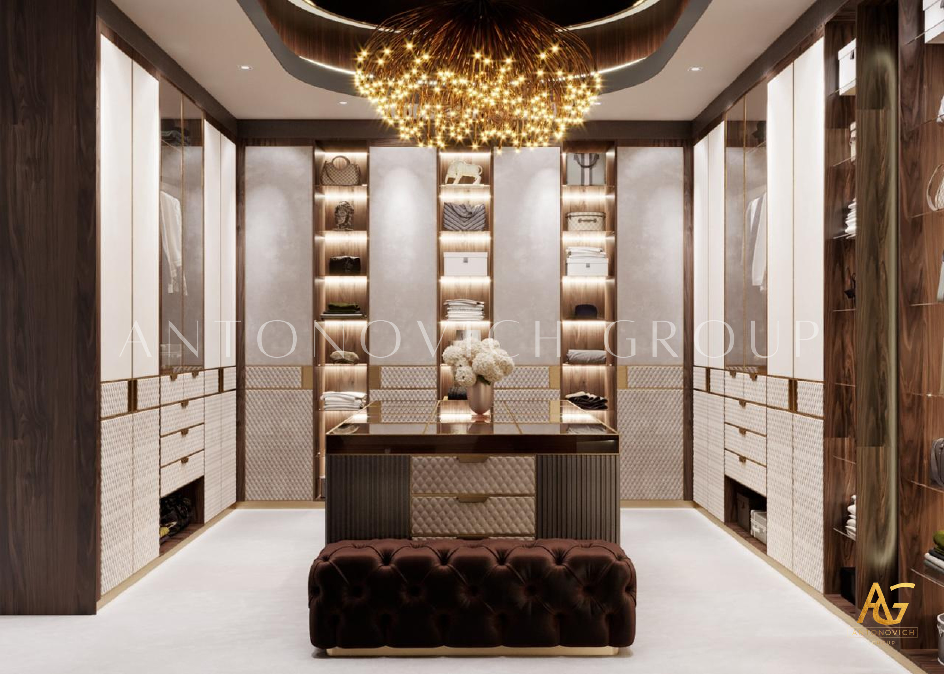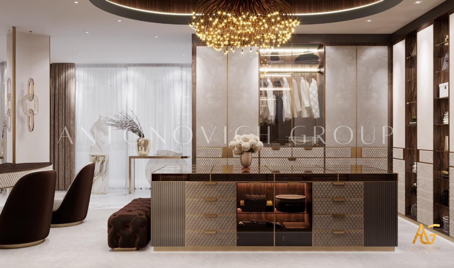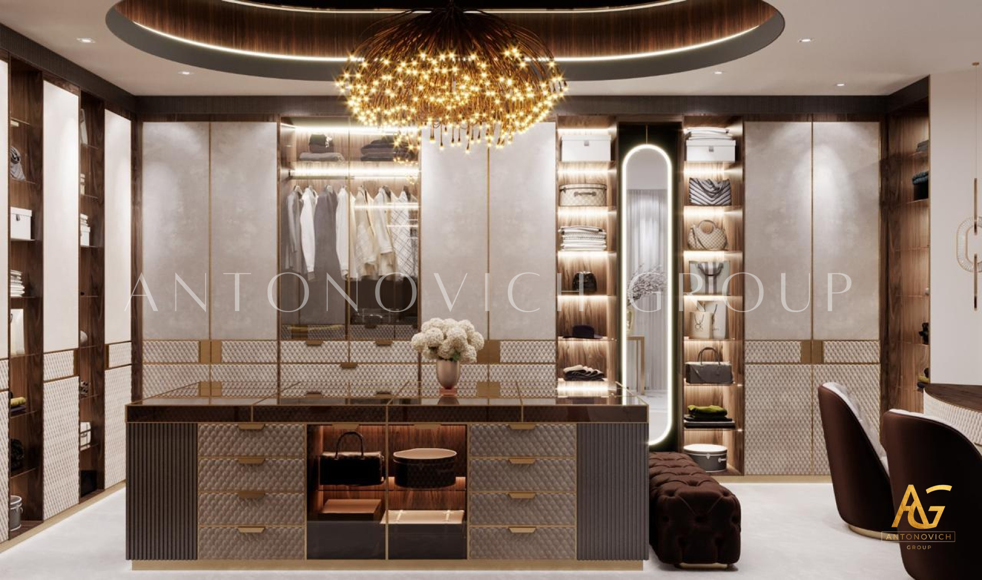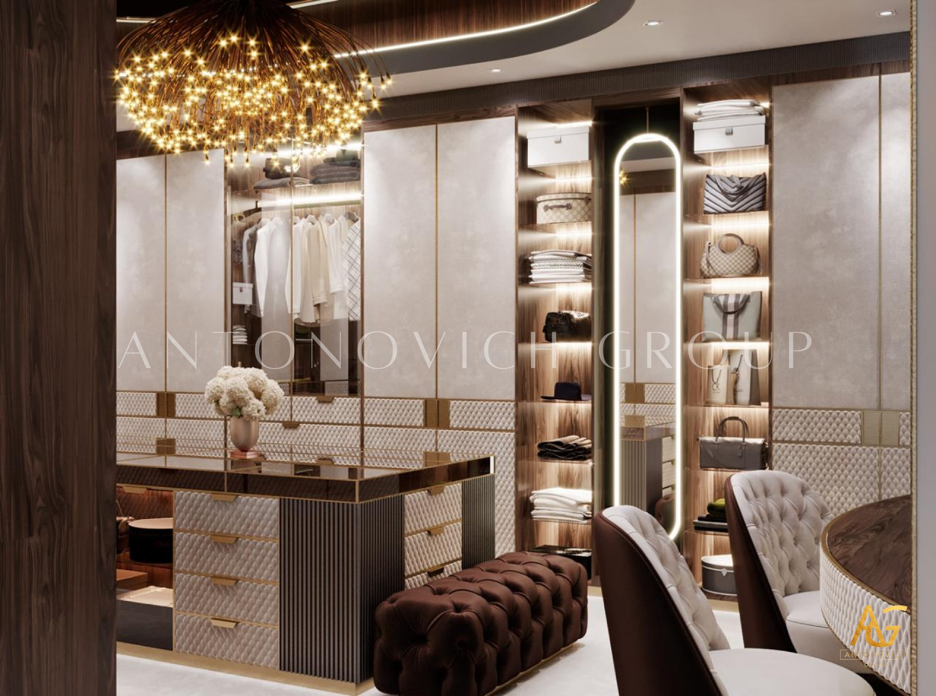 Interior design in a contemporary style with Art Deco accents, offered by studio designers Dubai, is reflected in the interior of a spacious dressing room. Apartment Design in Dubai has become a great opportunity to get an ideal habitat for each family member. Dressing room interior design is developed according to all the wishes of customers. The spacious place is roughly divided into two zones. In one of the areas we placed things of the hostess and in the other - things of the host. Already spacious dressing room looks more spacious, thanks to mirror panels. The highlight of the interior has become a showcase of transparent glass, behind which the most expensive and favorite things of the hostess are located. This showcase allows to especially cherish things.