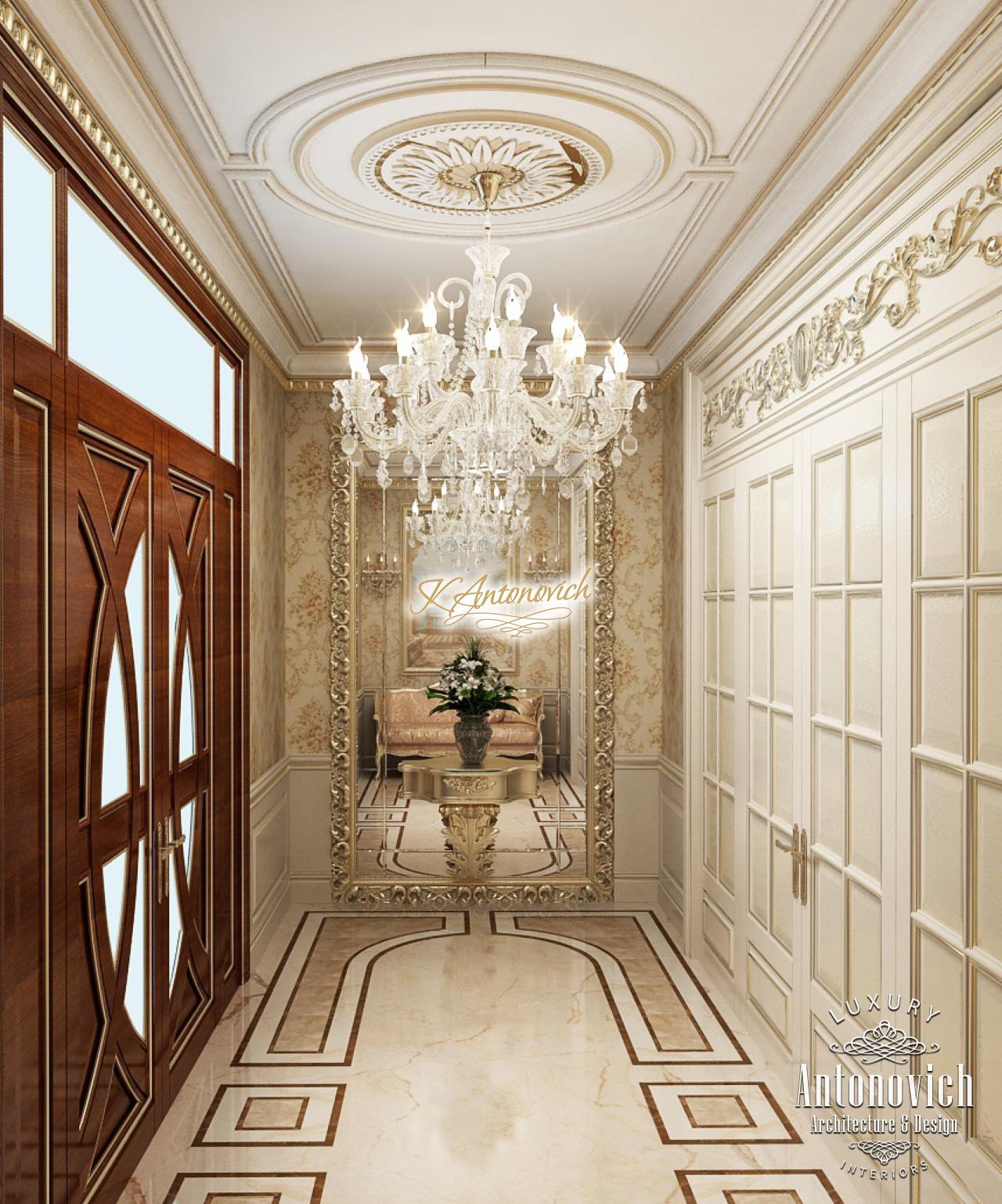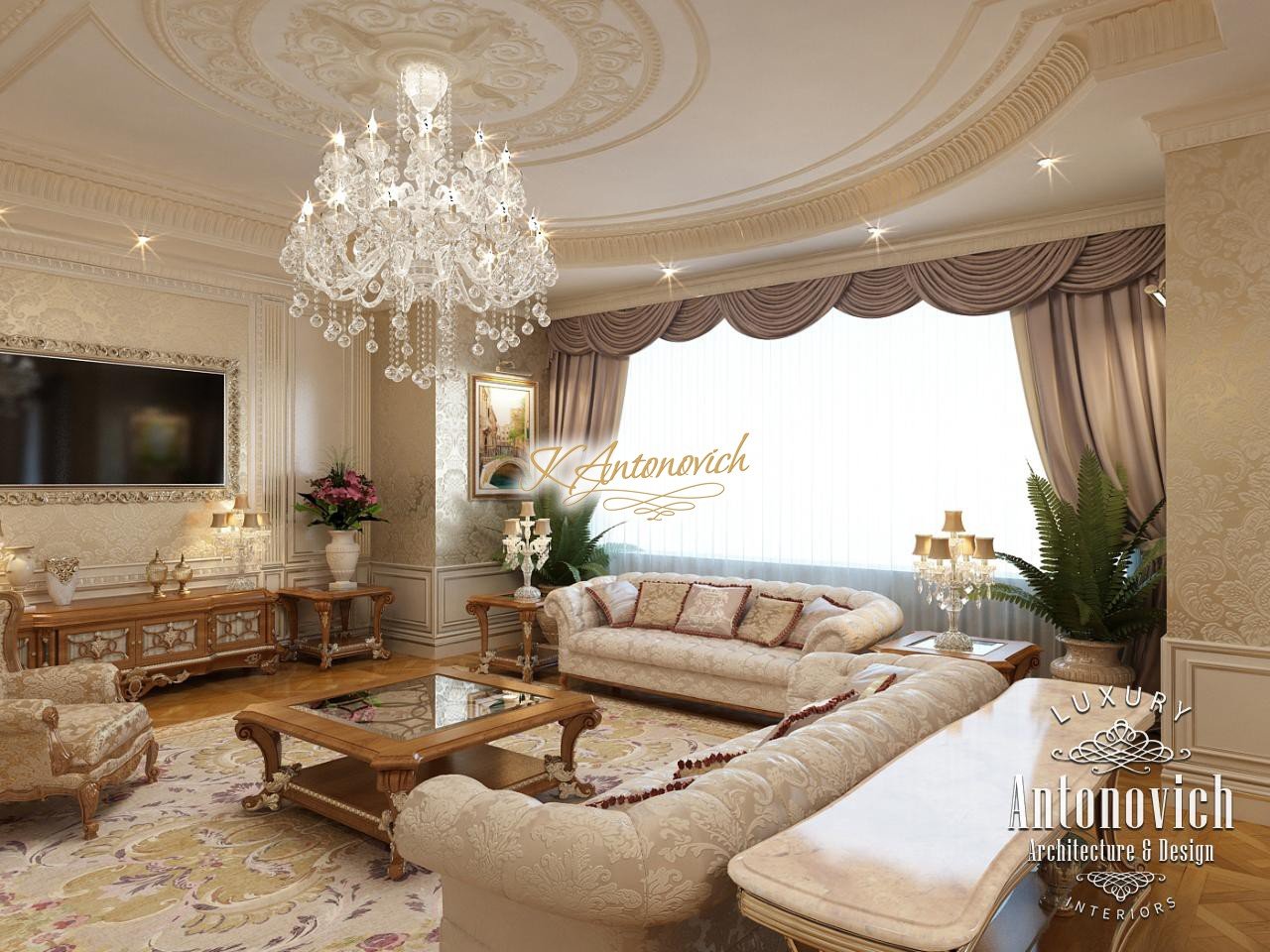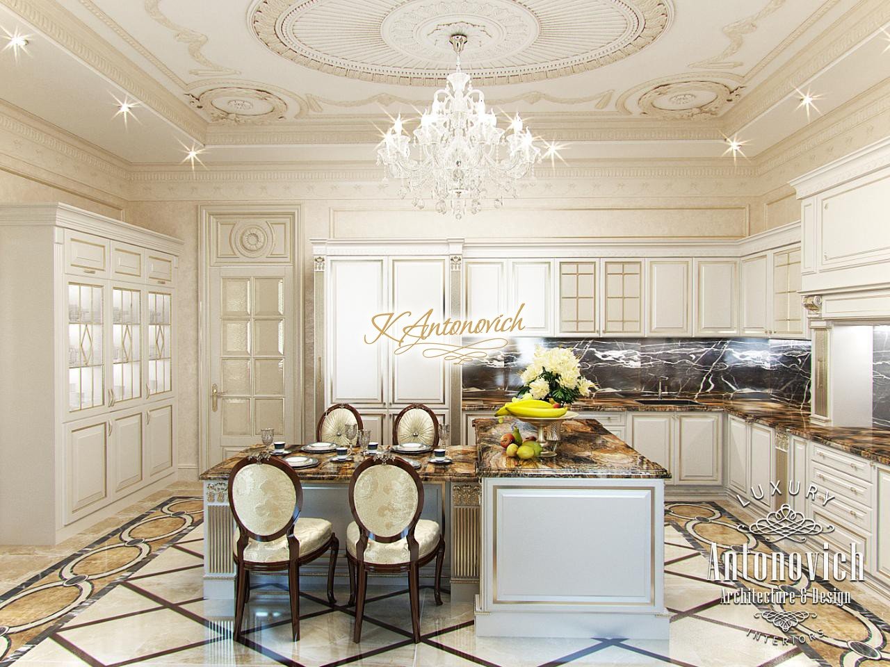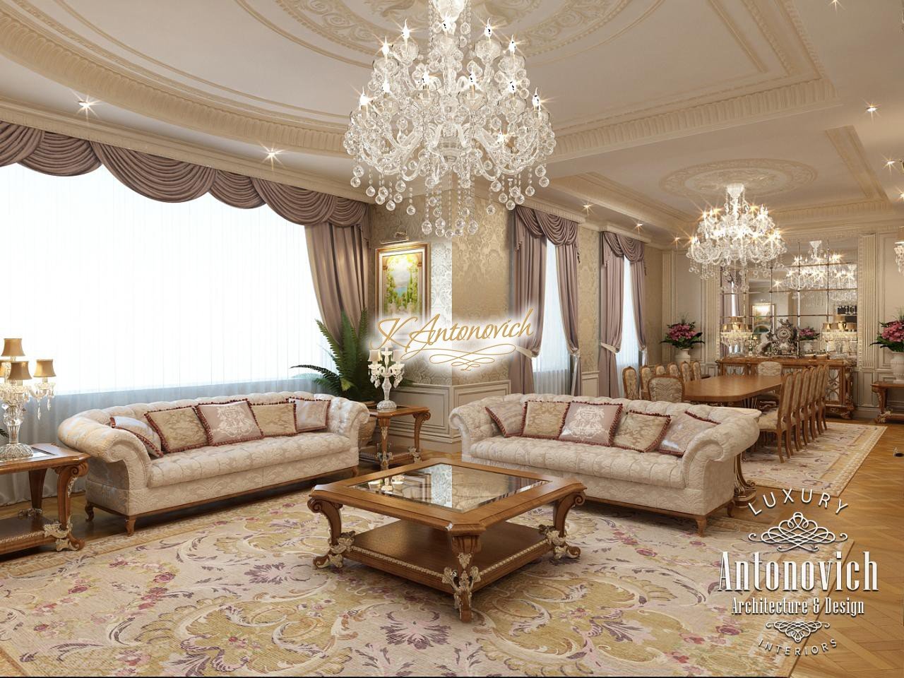 How beautiful, luxurious and elegant interior is, you can understand from the first moments of your stay in the house. Large size of the hall embodies the best traditions of modern classics. And interior designers Dubai bring to these traditions the shade of striking individuality. The highlight of each author's project of design studio Dubai Luxury Antonovich Design became floors, carved from precious marble. Dubai Interior designers create ornaments of the unique beauty. And thanks to modern technology, you can implement any design ideas. Interior literally captivates with its beauty and perfection. Carved pattern on the floor gracefully and elegantly echoes motifs of the ceiling decor. The central part of the pattern of carved on marble picks up the outlines of a pattern in illuminated stained glass, which framed a magnificent crystal chandelier. A refined curls of stucco on the ceiling repeat pattern with swirls of dark brown marble. Great hall is the beginning of a luxurious interior story that continues in the rest of the apartment. And each of those stories begins with luxury door, which is decorated with carved pattern and gilding. House Design Dubai underlines the fact that there you are always welcome. In the dining room interior, which is combined with the kitchen, there is a large table made of wood of valuable species, surrounded by many tall chairs with noble backs. The dining room harmoniously continues cozy living room. The floors are made of wood, soft Persian carpet and curtains of precious silk of coffee shade, are the basis of the warm and cozy mood in the interior.
