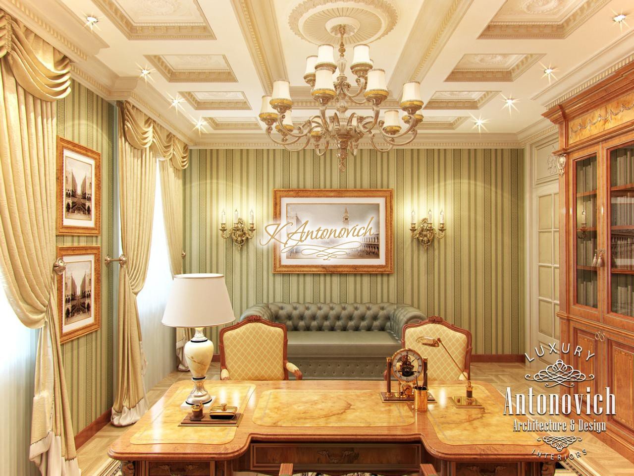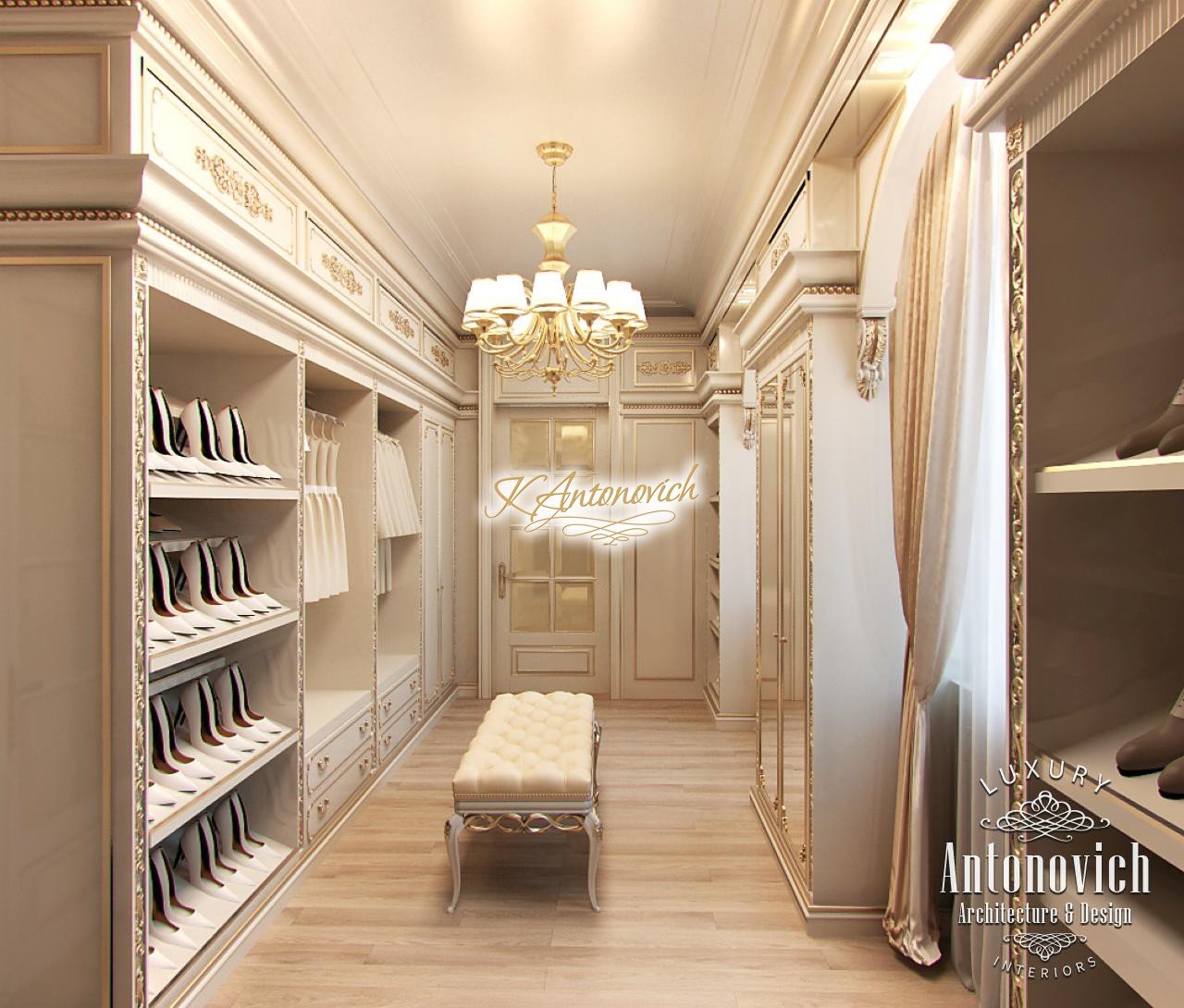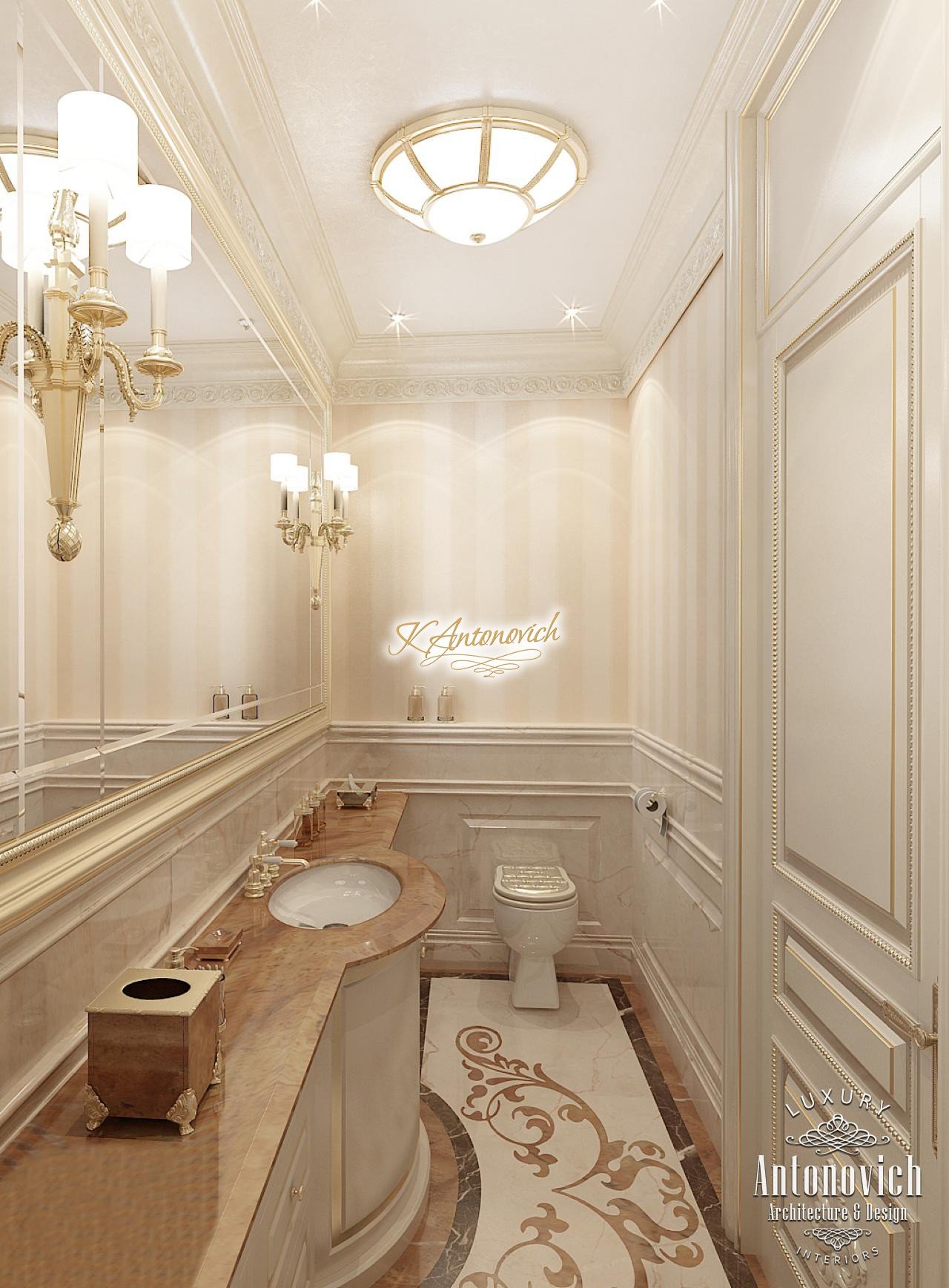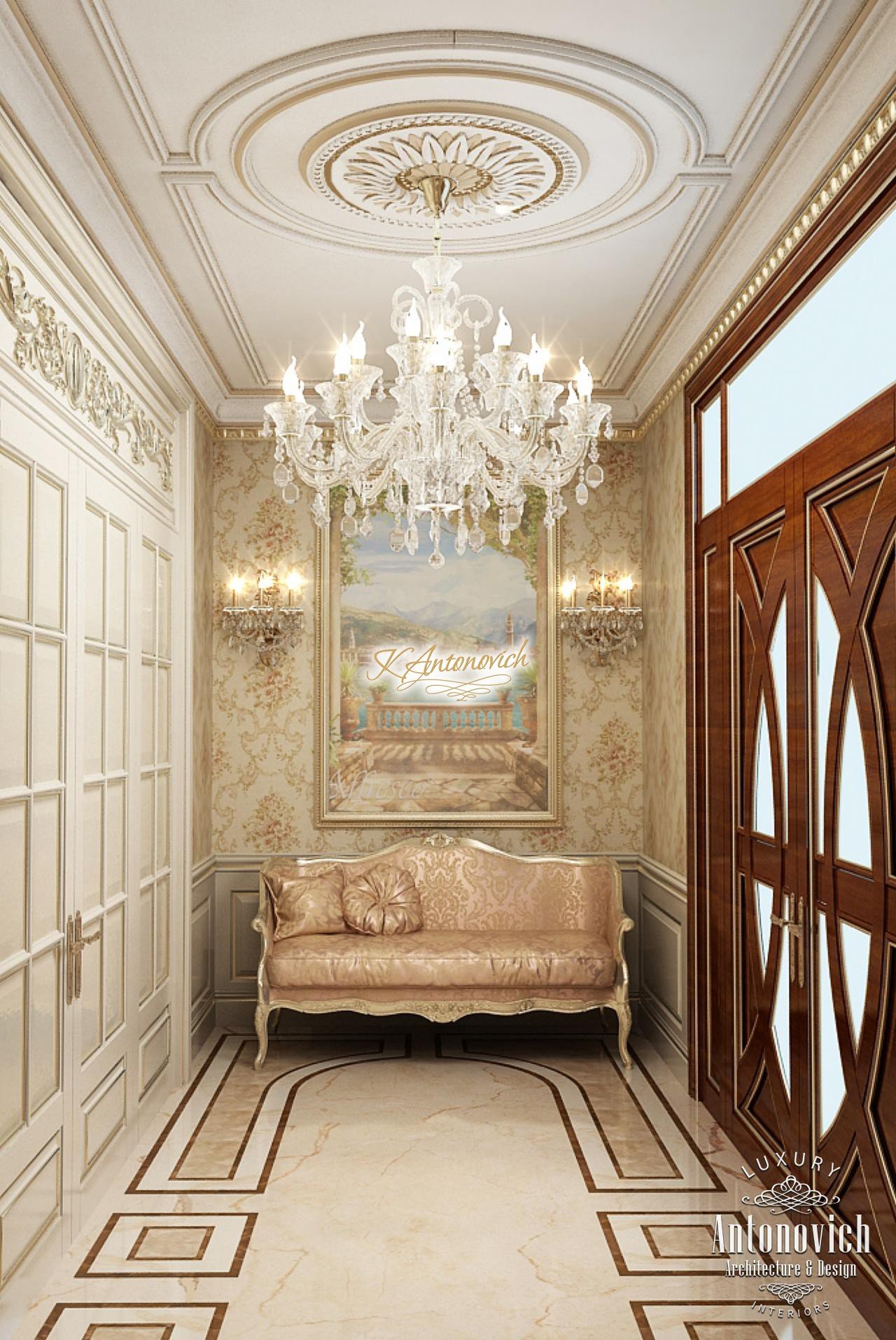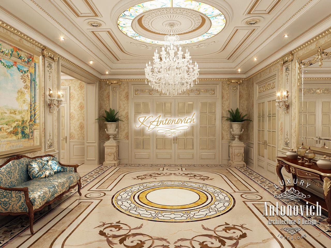 How beautiful, luxurious and elegant interior is, you can understand from the first moments of your stay in the house. Large size of the hall embodies the best traditions of modern classics. And interior designers Dubai bring to these traditions the shade of striking individuality. The highlight of each author's project of design studio Dubai Luxury Antonovich Design became floors, carved from precious marble. Dubai Interior designers create ornaments of the unique beauty. And thanks to modern technology, you can implement any design ideas. Interior literally captivates with its beauty and perfection. Carved pattern on the floor gracefully and elegantly echoes motifs of the ceiling decor. The central part of the pattern of carved on marble picks up the outlines of a pattern in illuminated stained glass, which framed a magnificent crystal chandelier. A refined curls of stucco on the ceiling repeat pattern with swirls of dark brown marble. Great hall is the beginning of a luxurious interior story that continues in the rest of the apartment. And each of those stories begins with luxury door, which is decorated with carved pattern and gilding. House Design Dubai underlines the fact that there you are always welcome. In the dining room interior, which is combined with the kitchen, there is a large table made of wood of valuable species, surrounded by many tall chairs with noble backs. The dining room harmoniously continues cozy living room. The floors are made of wood, soft Persian carpet and curtains of precious silk of coffee shade, are the basis of the warm and cozy mood in the interior.