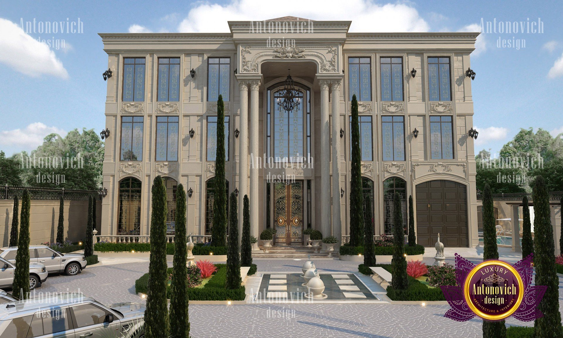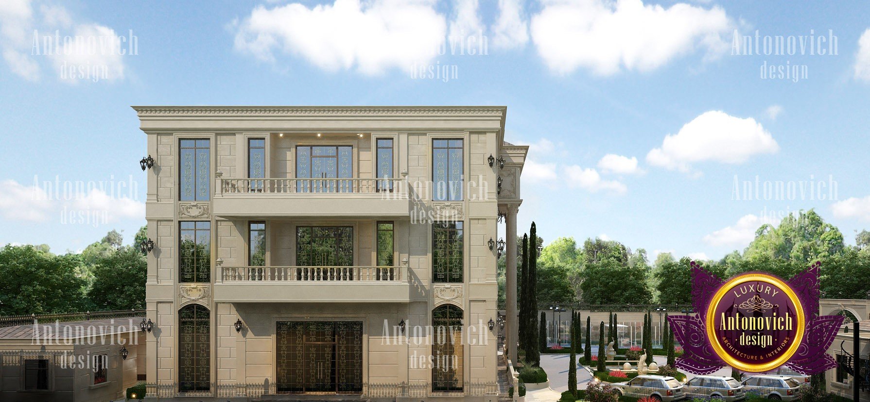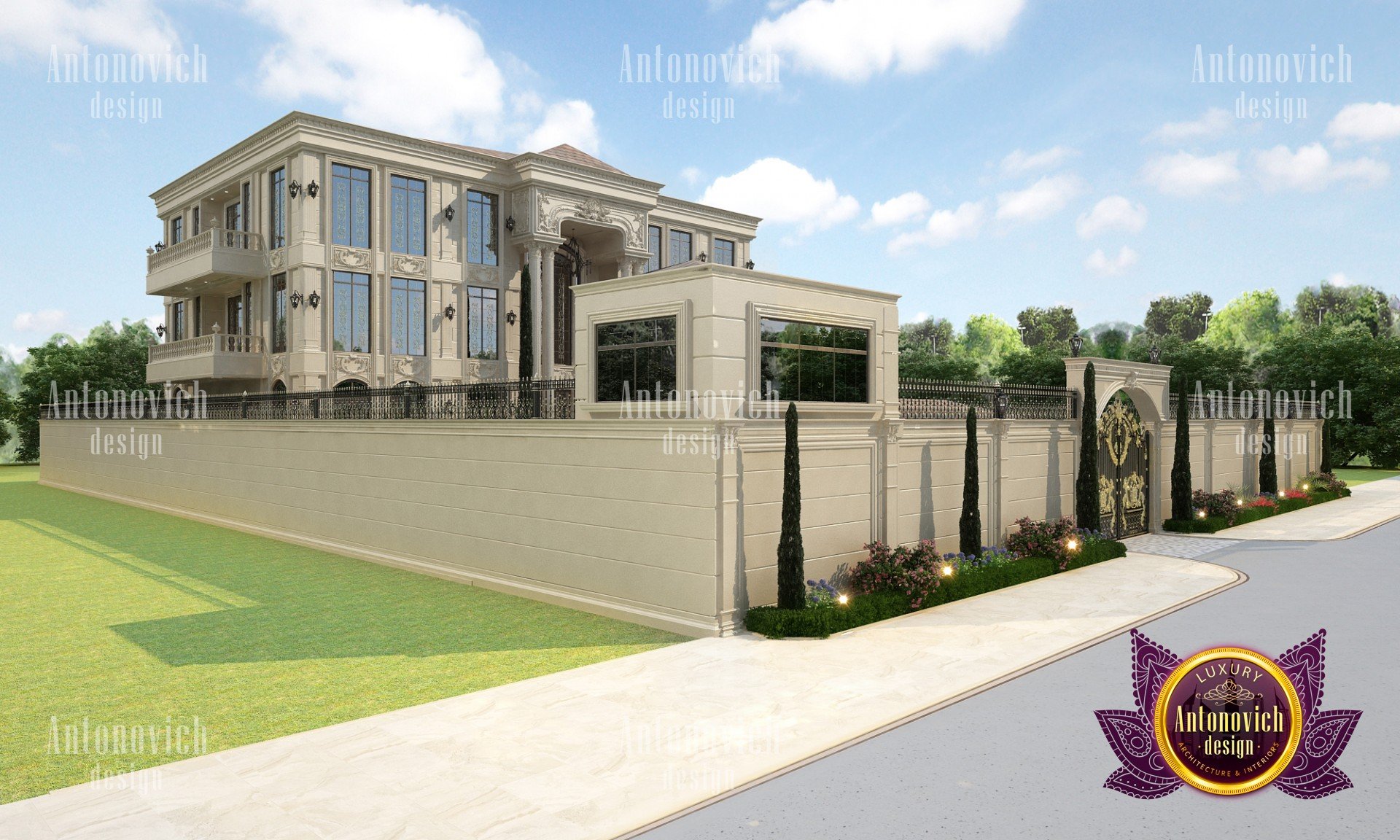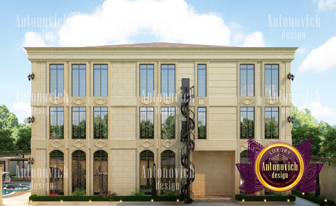 The exterior design of the villa gives the building aesthetically perfect and expressive look. Interior Designers Dubai of Luxury Antonovich Design studio harmoniously combine silhouette of the building, its general shape, the texture of the walls, architectural elements and color scheme. Every piece, every detail of the building exterior carries information and material aesthetic. As building appearance in the first place emphasizes the respectability of home owners and their wonderful taste. Also, the house exterior design is closely related to landscape design. Architects and designers filled every phase of the work with the special meaning. And the exterior design is no less luxury than interior design. Architects and designers took care of the right emotional impact. Refined house exterior has an elegant image. Three-dimensional spatial forms through the perception have effects on a person, giving wonderful emotions from the contemplation of the beauty of the building. Accurate edges of the house facade allows clearly identify the shape and curved line, which the view slides on, create wholeness and continuity of the image. Multigabled roof of light gray hues gives the image of the building lightness and high windows with light walls visually lengthen the form and make the image of the building even more graceful. The house exterior design studio by the studio Luxury Antonovich Design perfectly reflects fashion trends in design and architecture. Time proved classics remains at the peak of popularity. The harmonious image of luxury house will delight more than one generation of the family.