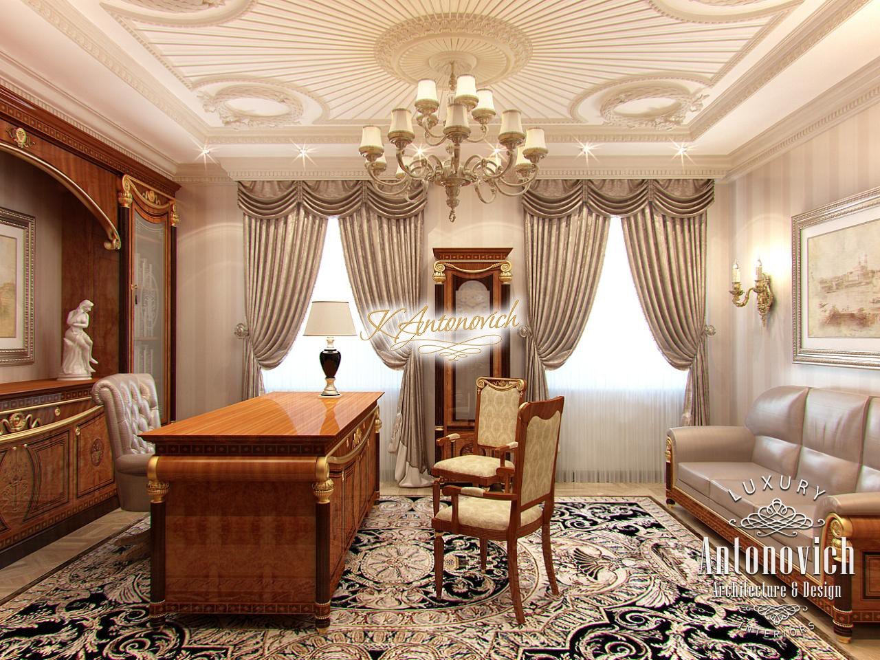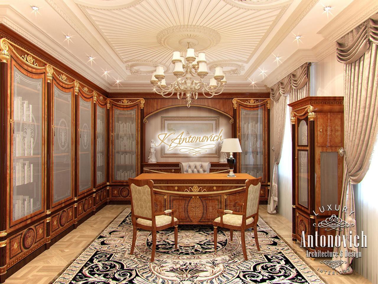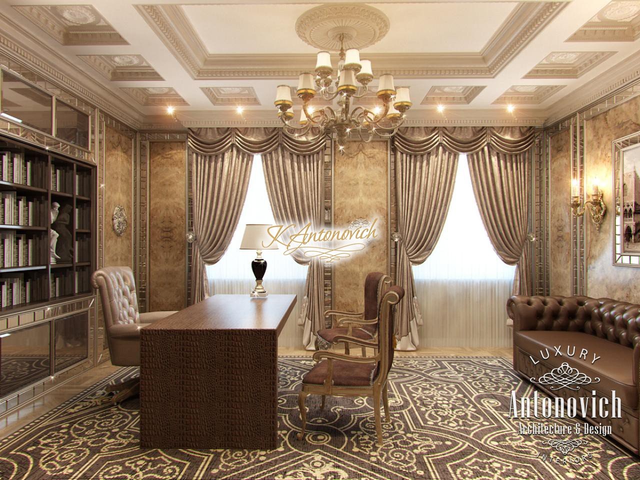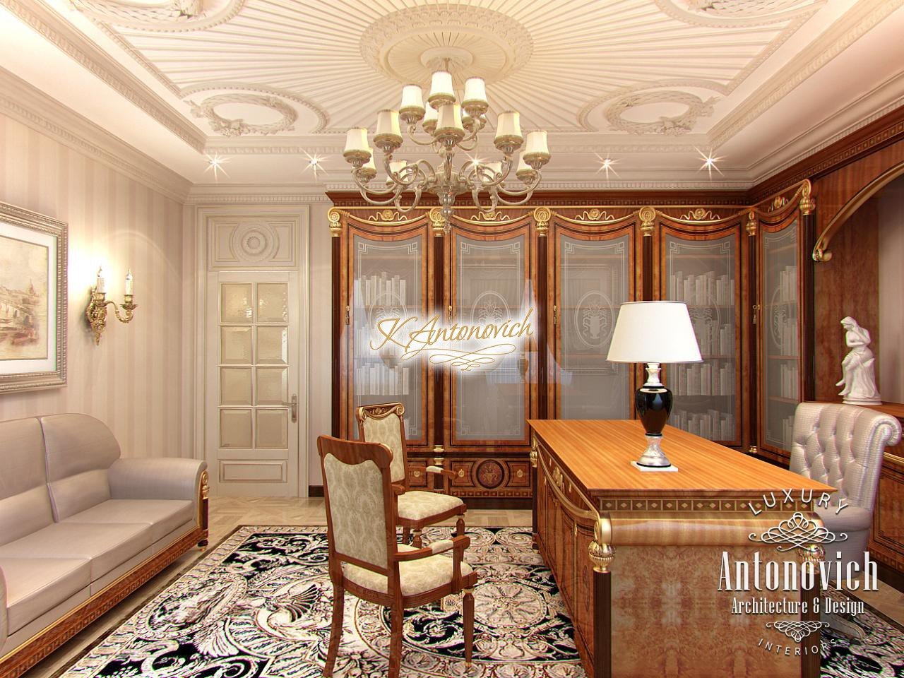 Office interior design from studio Luxury Antonovich Design is an ideal organization of space and the creation of a comfortable environment to work effectively. Office Design for the head of a large company is intended to emphasize the success of the company and its management. Interior Designers Dubai offered a project in a traditional classical style. Particularly luxury classics is most able to reflect the refined taste of the office owner and his high status. In the offices interior design the most important is furniture. And here it played a very big role. Luxury furniture of valuable species wood with exquisite carved decor gives the office an elegant image. Negotiations will be held in this office on a wave of confidence and friendly atmosphere. Feeling of warmth of home comfort contributes to this, which interior designers Dubai have made with the help of such traditional elements like curtains and soft carpet. Office Design became a luxurious mix of business atmosphere and cozy warmth.