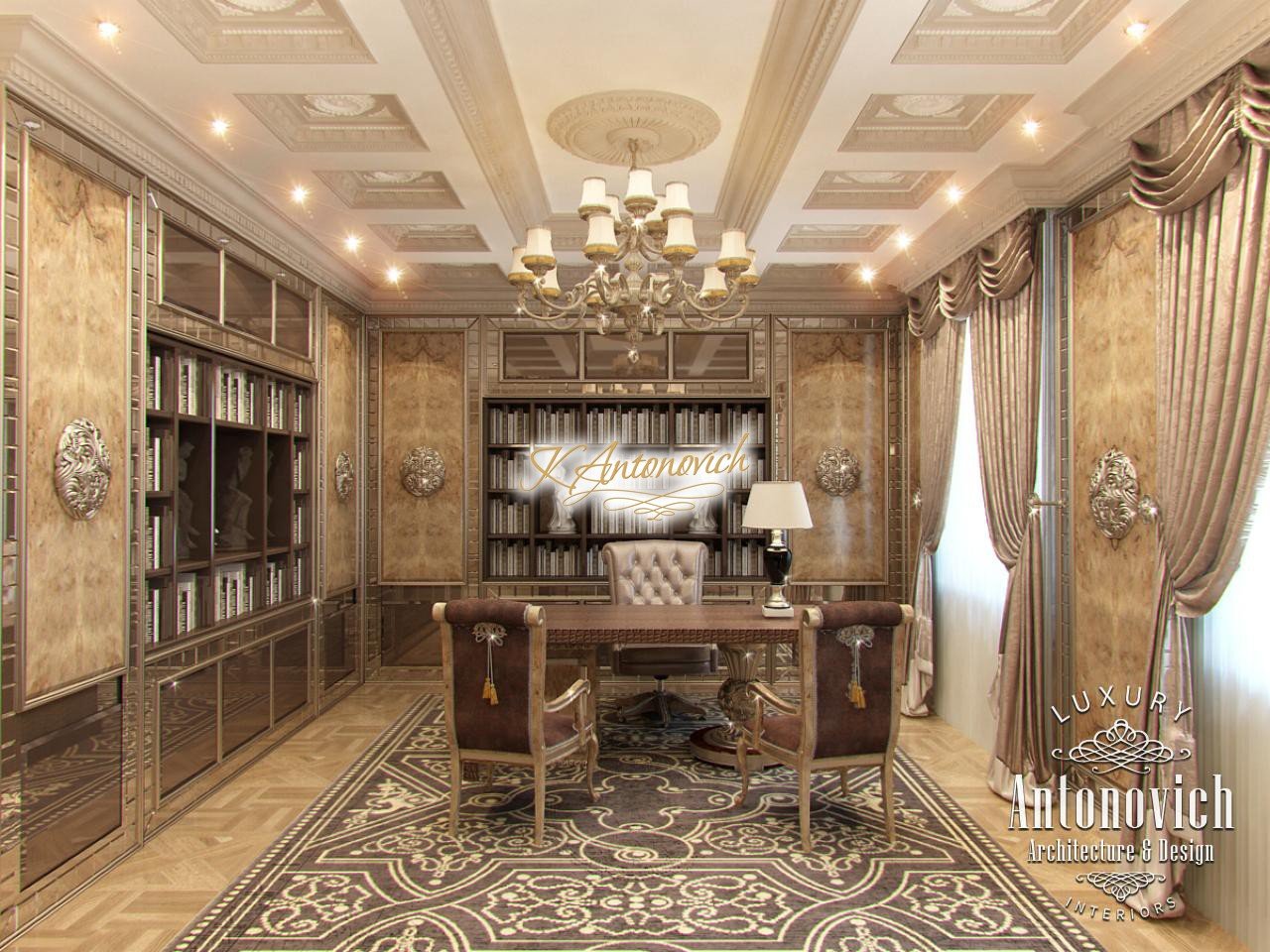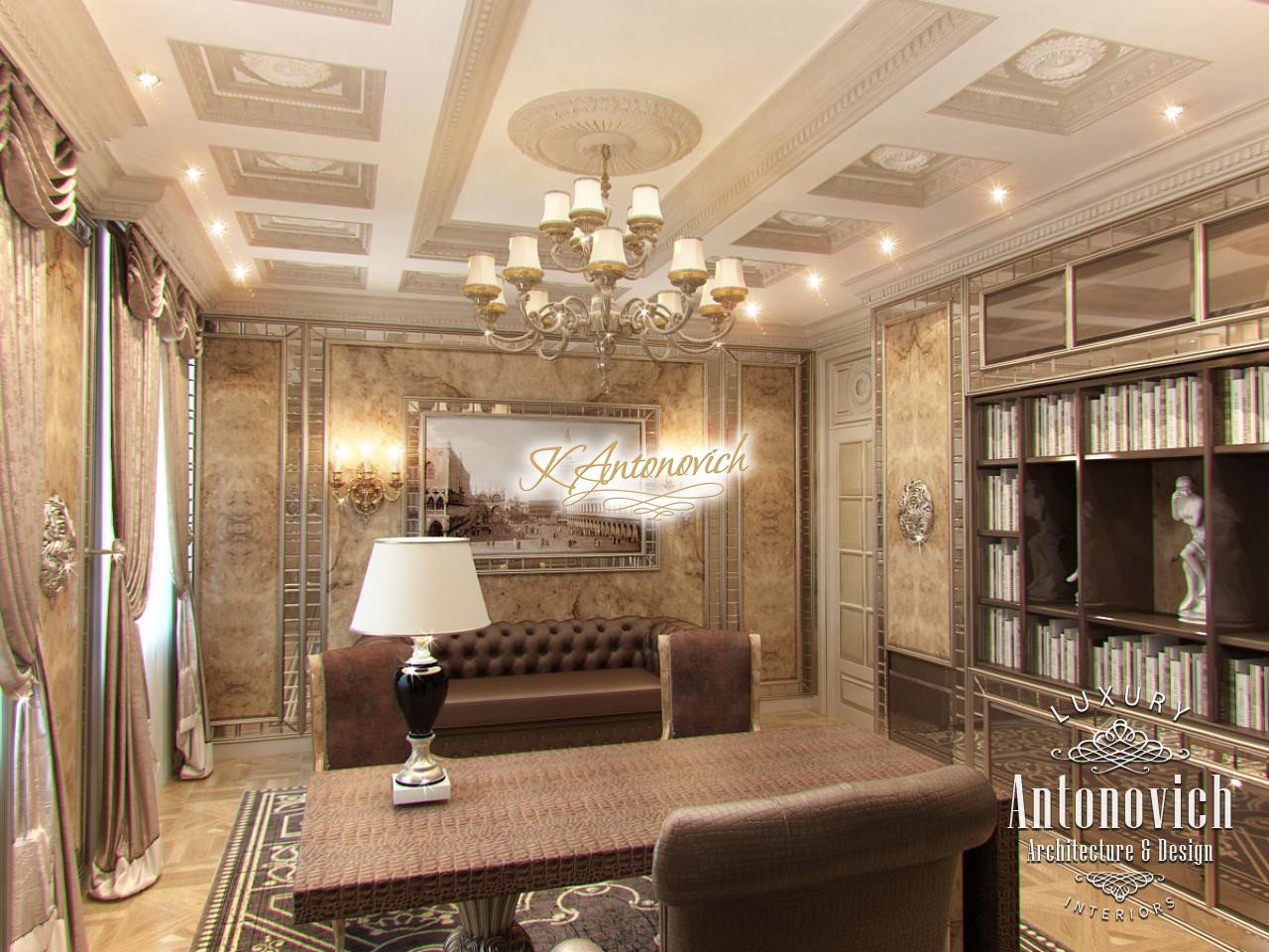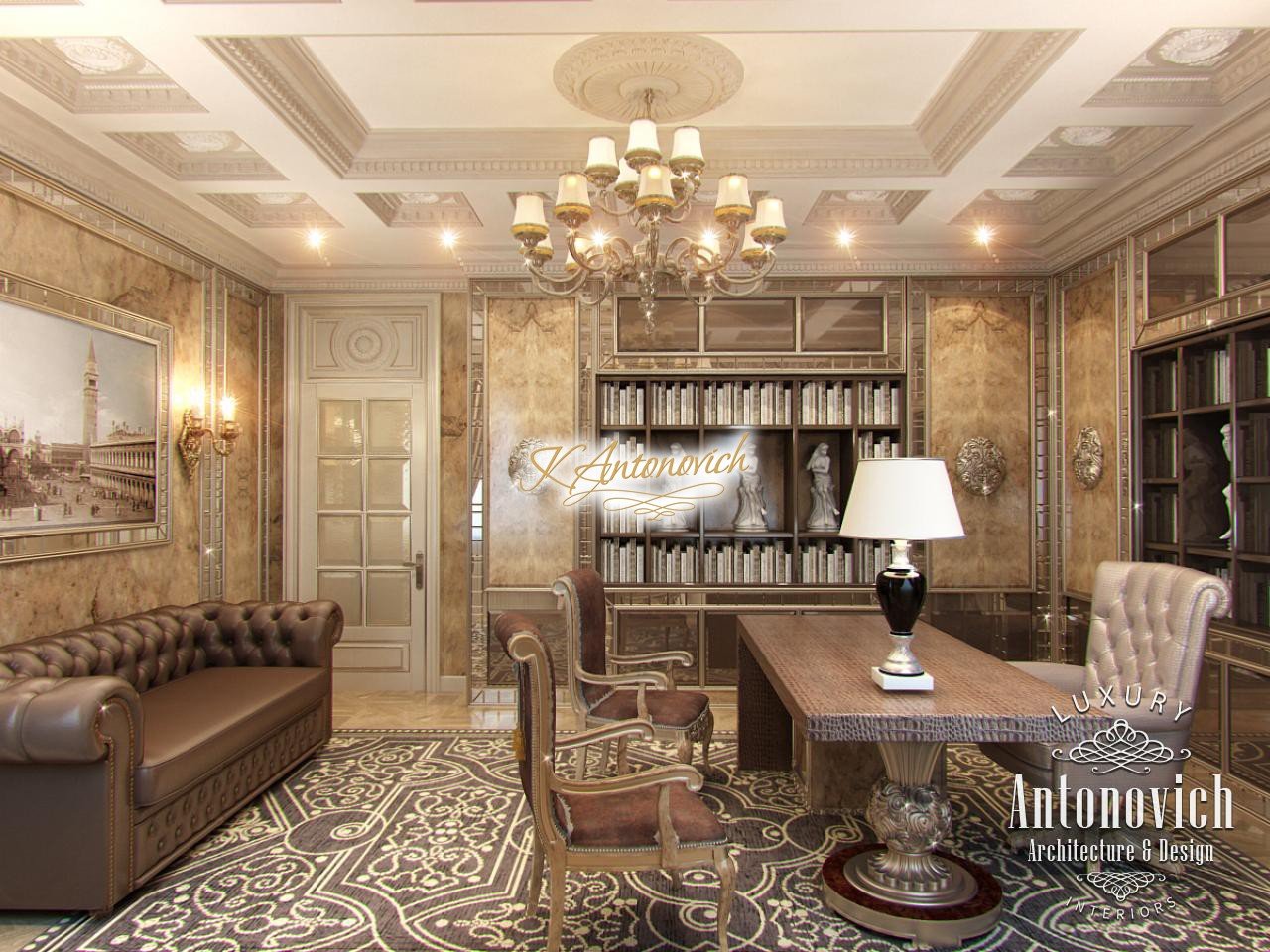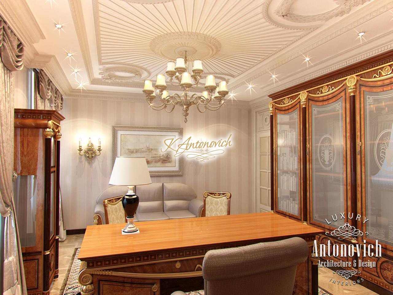 Office interior design from studio Luxury Antonovich Design is an ideal organization of space and the creation of a comfortable environment to work effectively. Office Design for the head of a large company is intended to emphasize the success of the company and its management. Interior Designers Dubai offered a project in a traditional classical style. Particularly luxury classics is most able to reflect the refined taste of the office owner and his high status. In the offices interior design the most important is furniture. And here it played a very big role. Luxury furniture of valuable species wood with exquisite carved decor gives the office an elegant image. Negotiations will be held in this office on a wave of confidence and friendly atmosphere. Feeling of warmth of home comfort contributes to this, which interior designers Dubai have made with the help of such traditional elements like curtains and soft carpet. Office Design became a luxurious mix of business atmosphere and cozy warmth.