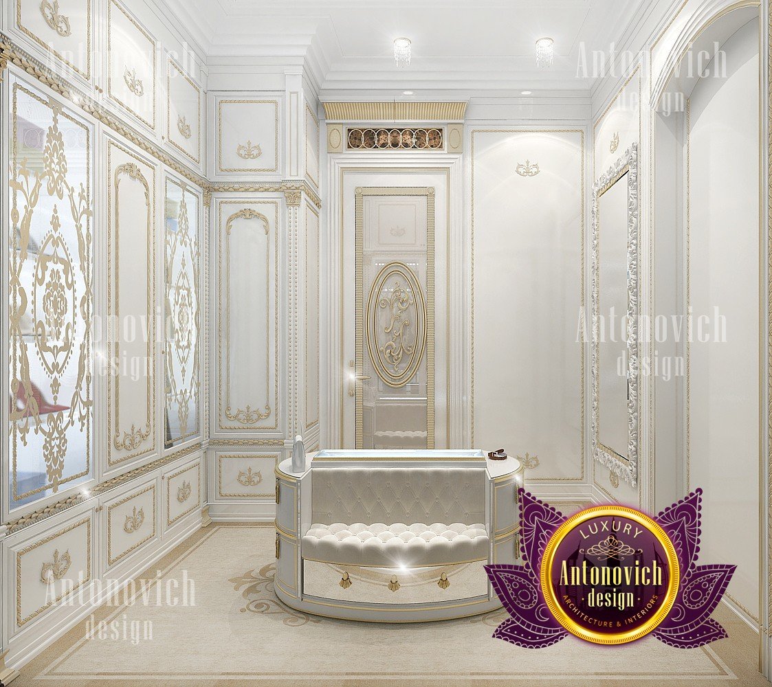 Charming dressing room is located in the attic room in Abu Dhabi. Interior designers masterfully arranged particular architectural layout of the room. Dressing room interior design is very clear and clearly speaks of gentle and refined character of its owner. Slope of the roof is decorated with plaster that gives pearly luster. The window is curtained with white silk. Creamy-pink range of shades in the dressing room interior sets the basis for the romantic mood of the interior. A soft fluffy carpet on the floor of wood looks cozy, warm and charming. Charming boudoir table is illuminated from the inside with soft blue backlight. Round mirror looks cute on a soft wall panel, which is upholstered with natural leather of pink color. Dressing room interior design combines luxury and functionality.