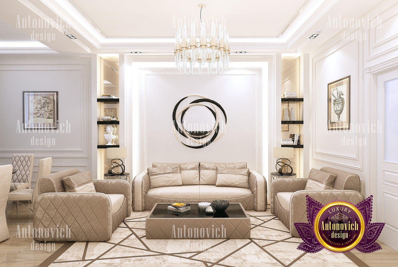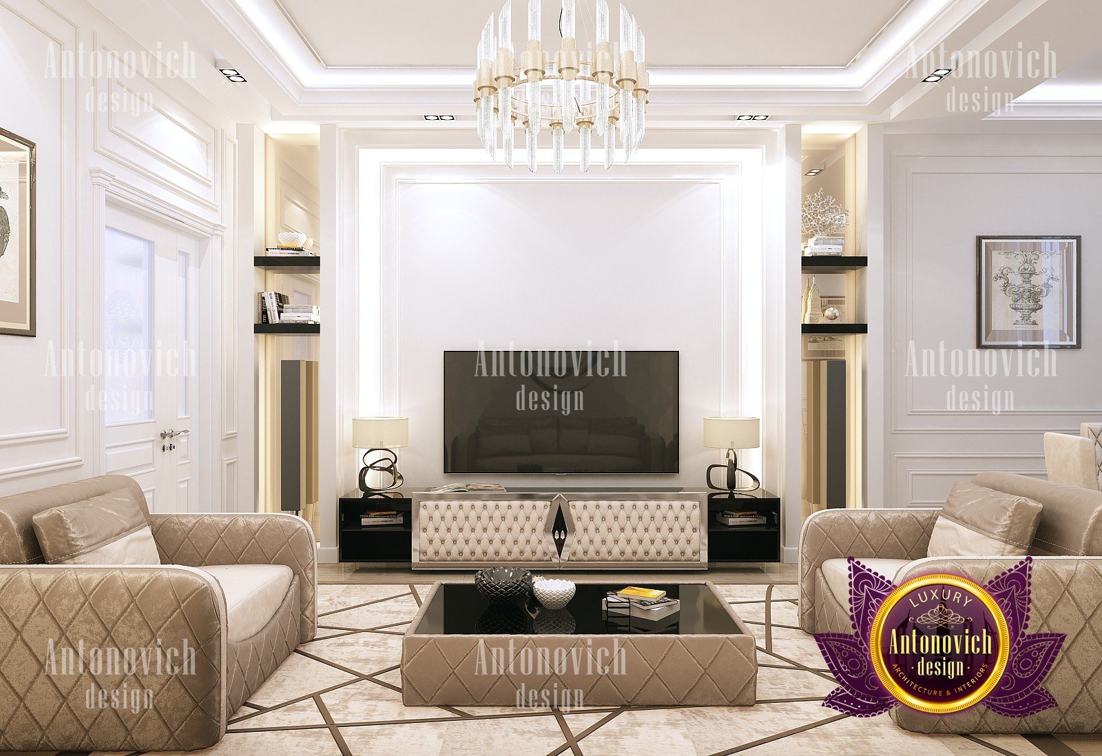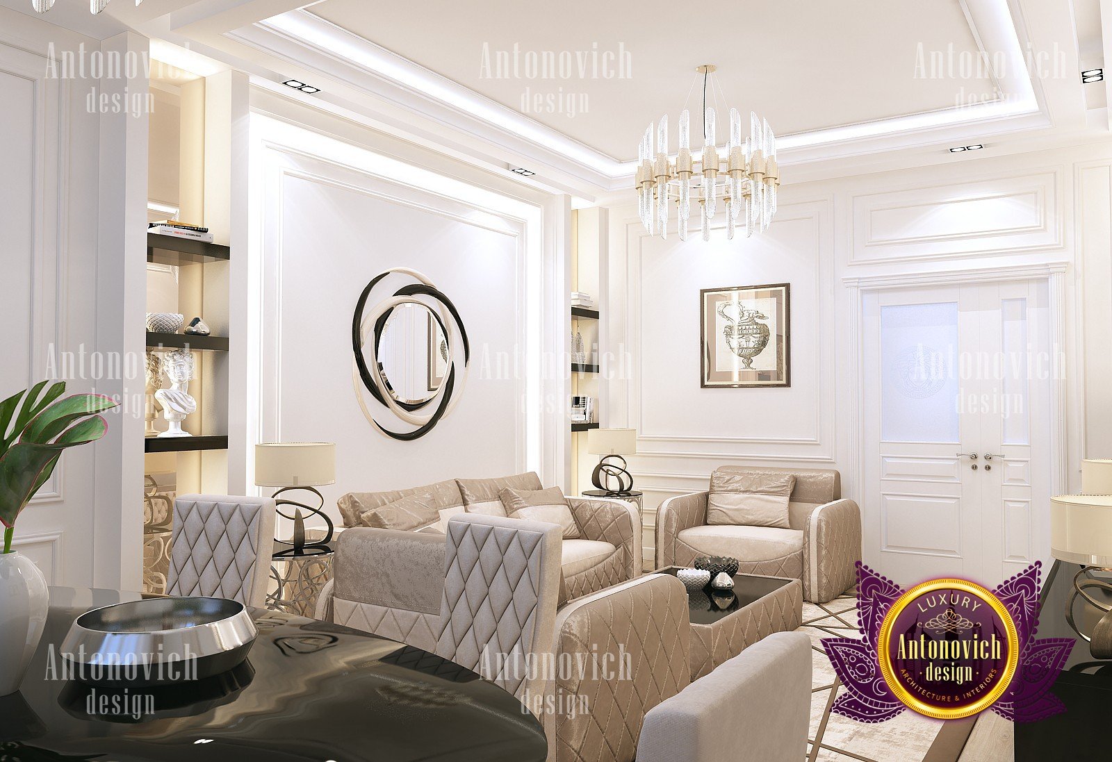 Living room interior design is conditionally open space to all. Here, the family and friends spend time. Homeowners in Dubai are very friendly and hospitable people, who are always welcome and are ready to provide the best of everything. Interior Designers Dubai offered a stylish and spectacular interior solutions in the spirit of a modern classic, which fully reflects the respectability of the house and the understanding of beauty. The cozy living room with large panoramic windows sets the mood for a pleasant comfort. The windows are curtained with luxurious curtains in a classic style of noble silk. Stressing the hospitality of this house, interior designers Dubai pay special attention to that part of space which houses a dining room. The large dining table made of wood inlaid with carved decor. It is surrounded by the high upholstered chairs with noble backs. Above the center of the living room and dining room interior is decorated with magnificent crystal chandeliers with lots of hangers. Under the brilliance of charming crystal graceful swirls of stucco decoration play with the light. Living room interior design exudes the aesthetic perfection and elegant mood of a contemporary palace. Warm and homey look of natural wood floors with special impregnation strengthens the luxurious feeling with Persian carpets in the living area and dining area. Luxury interior design of Luxury Antonovich design expresses the individuality of each house and gives its owners a unique feeling of absolute comfort at any time of the day.