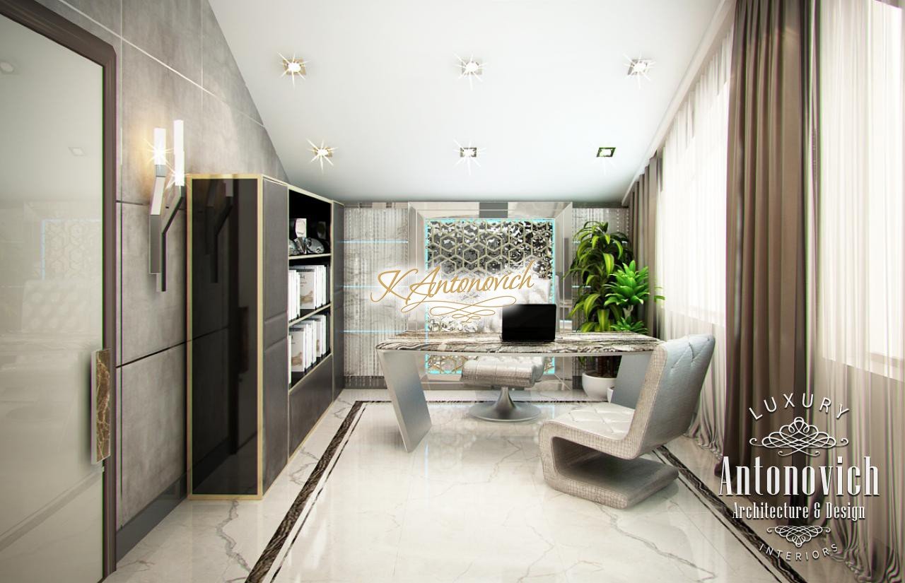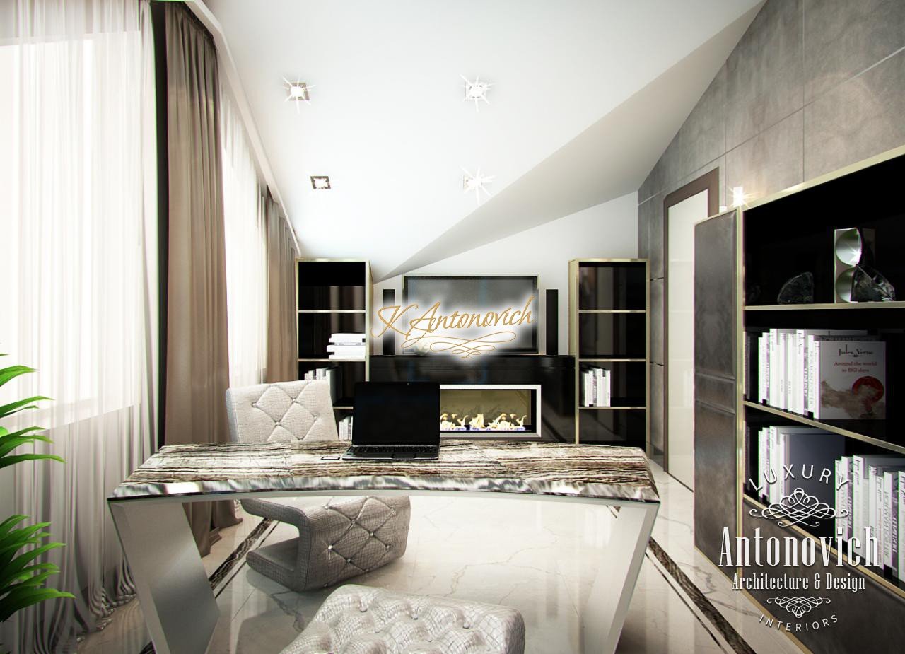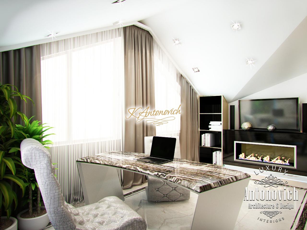 Office interior in a house was allocated in an attic room. Interior Designers Dubai perfectly organized the space, paying attention to characteristics of the architectural layout of the room. By itself, the attic adjusts to privacy and full concentration. The stylish interiors in a contemporary style has become a wonderful reflection of the wishes of the owner of the house. Interior Designers Dubai organized a multi-functional space in which to work nice and comfortable rest are possible. For a comfortable rest in the office interior a modern fireplace is provided. The white slope of the roof is decorated with a neat ceiling lights. In the windows decoration curtains in a modern style of noble silk of dark chocolate shade look luxurious. Concise outlines of the furniture perfectly reflect business spirit of the interior. Office interior design emphasizes the fact that its owner is a person, very successful and passionate about his business. Particularly in this unique office all perfectly corresponds to an effective job.