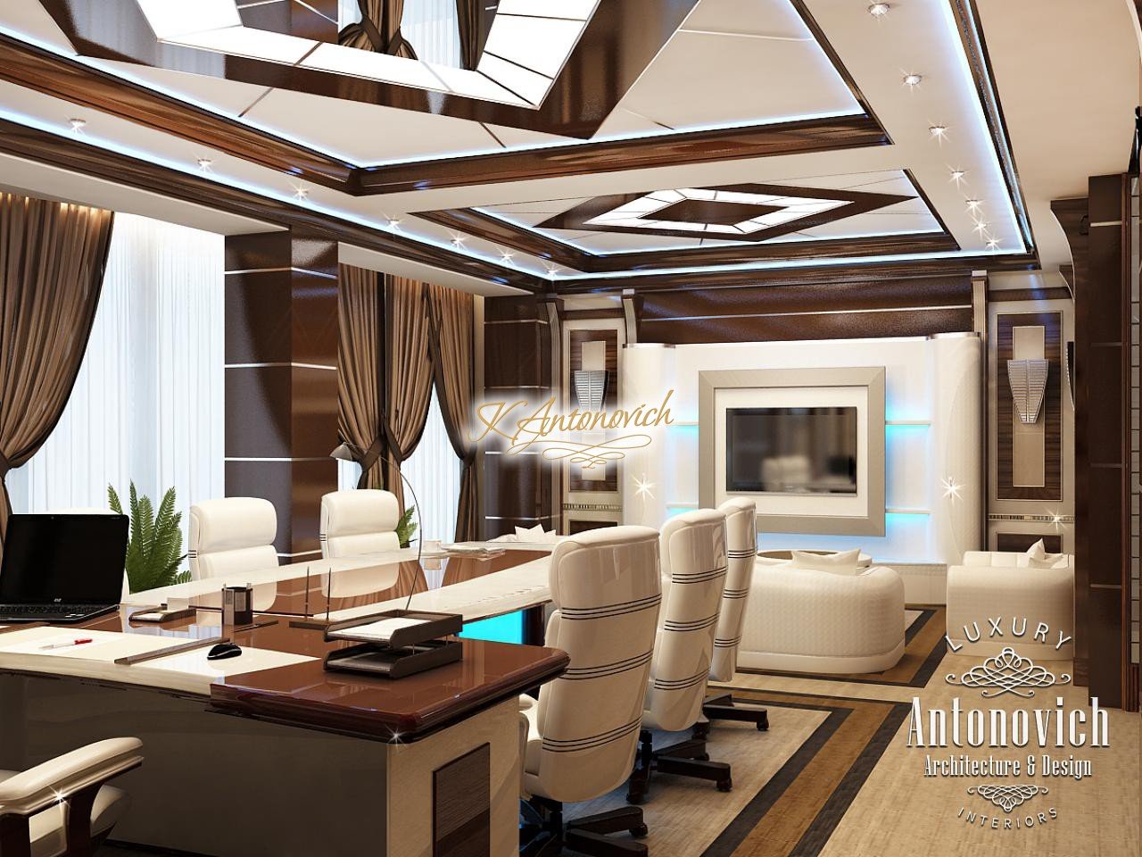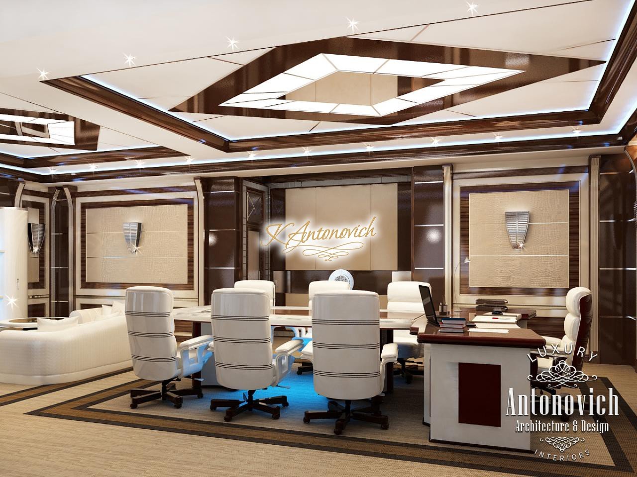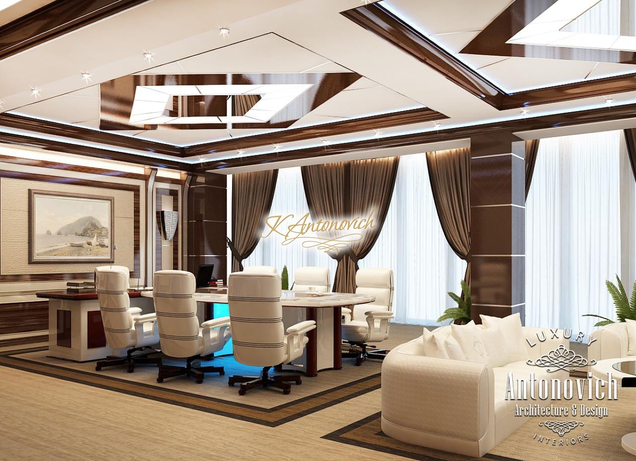 This grand architectural interior design was developed for a successful law firm. Interior design in a modern style with spectacular original solutions underscores the success of the company's respectability. From the first moment of your stay in the office the client understands that there is a serious work and successful lawyers, and they can be trusted with the most responsible thing. Waiting area for clients is decorated in a modern style. And every visitor feels comfortable, interior designers Dubai added emphasis of cozy mood. The combination of warm shades of beige and brown adjusts to the feeling of warmth. Elegant decor of walls and ceiling give aesthetic pleasure. Office interior design provides separate interior of each room of the office building. Сonference hall interior design fully corresponds to the high status of the law firm. Comfortable furniture, exquisite architectural decorations and precious materials were the basis of this luxurious interior.