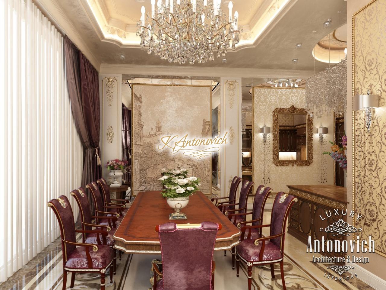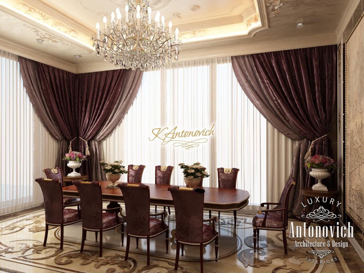 House Design in Abu Dhabi in the classical style. Luxury with a solemn character inherent in each room of the beautiful villa. Interior Designers of studio Luxury Antonovich Design masterfully blended into their project great traditions of classical style with new accents that are possible through the use of new technologies. The spacious apartment combines a large area of the dining room and kitchen. Kitchen interior design now requires not just creative ideas, but talent of the designer. Today, the interior designer must have additional technical knowledge. Interior Designers Dubai closely monitor all new items to offer their customers the best solutions for absolute comfort. Kitchen interior design impresses with its elegant and luxurious features. The authors of the project decided to zone space by a decoration of floors and ceilings. The ceiling is divided into two niches, each of which is filled with decorative plaster with the texture of velvet. Due to massive crystal chandeliers and soft lighting lines, plaster shimmers pearlescent under the light. On the floor the dining area and kitchen area are determined with exquisite carvings of dark marble. The facades of kitchen furniture made of wood valuable species are inlaid with carved decor and complemented by luxury fittings. The dining room makes it clear that the house is welcome and hospitable.
