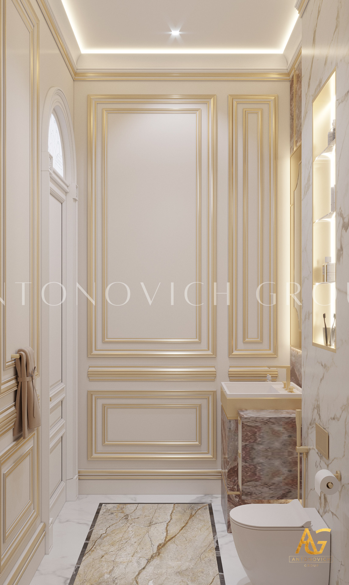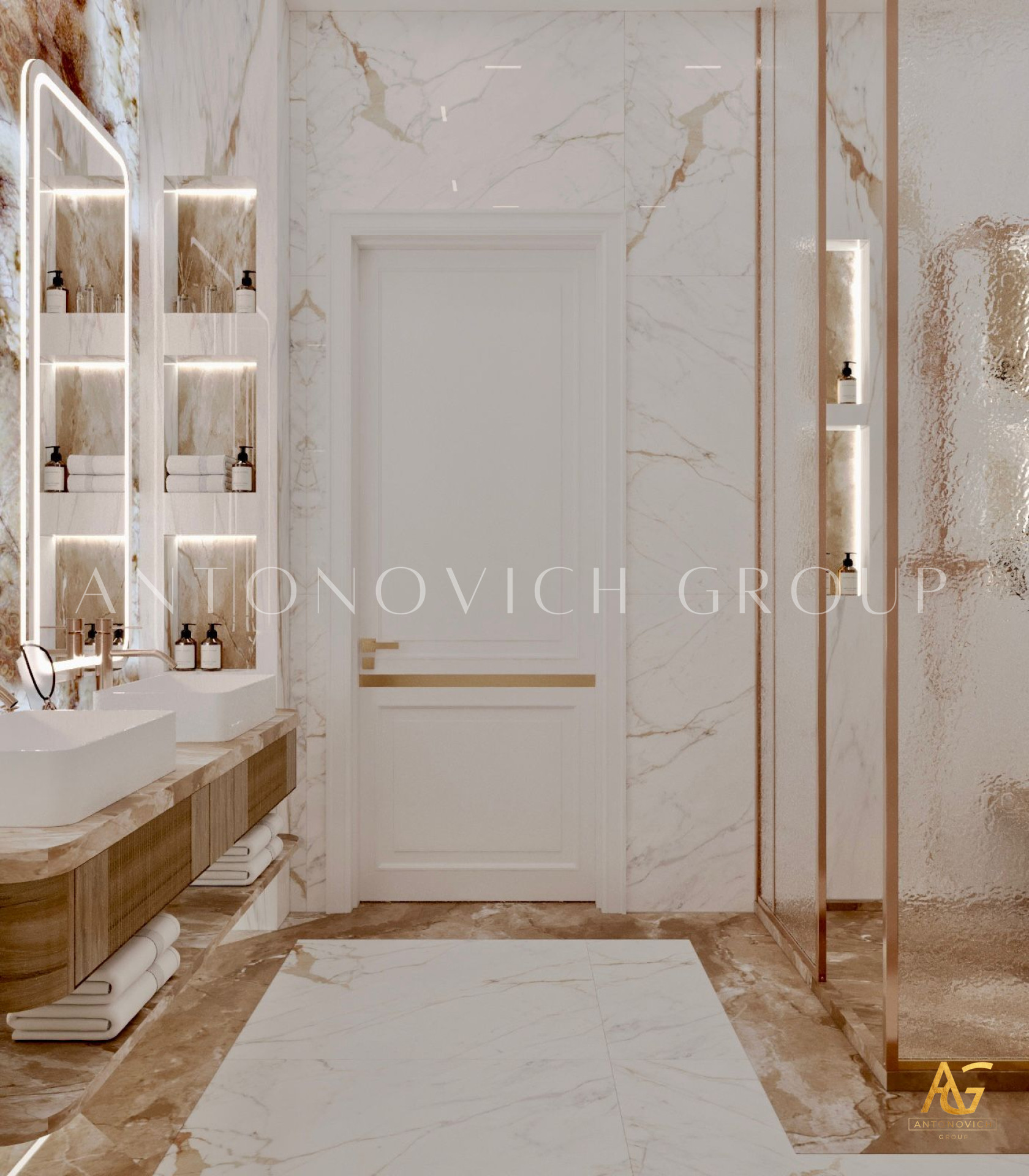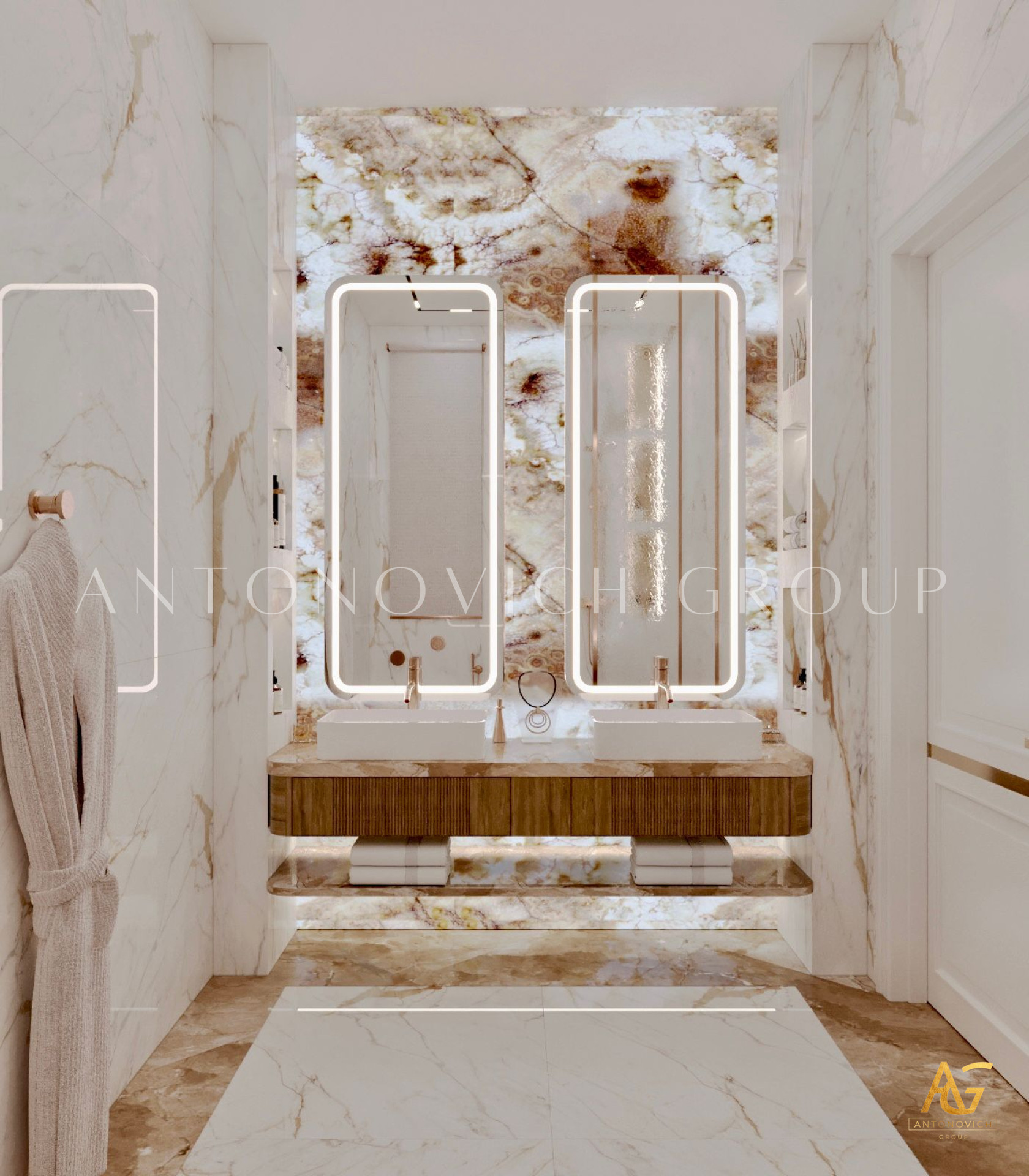 Apartment Interior design in Dubai is stylish and sophisticated filling the luxury apartment with the special charm of modern luxury. The space of the bathroom is perfectly organized for the owners of the luxury apartment to feel completely comfortable and cozy. The bathroom design like the design of the rest of the apartment sets a festive mood, giving a sense of aesthetic pleasure. The interior is full of charming decorations. A marble floor with an exquisite pattern of carved stone defines the center of the room, but as elegant chandelier shades with fine dark chocolate shade. It looks beautiful and expressive with a dressing table. Luxury furniture looks fantastic on the background of a large panel with a mirror facet. Graceful white pilasters framed mirrors, making the song complete.