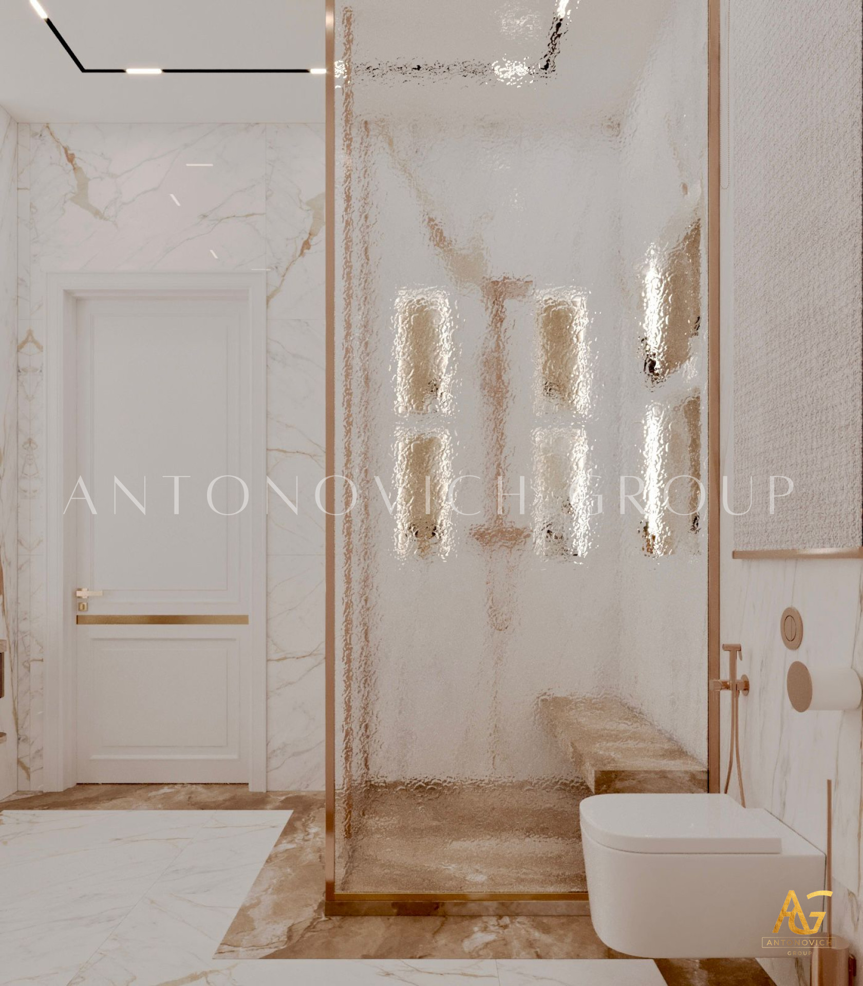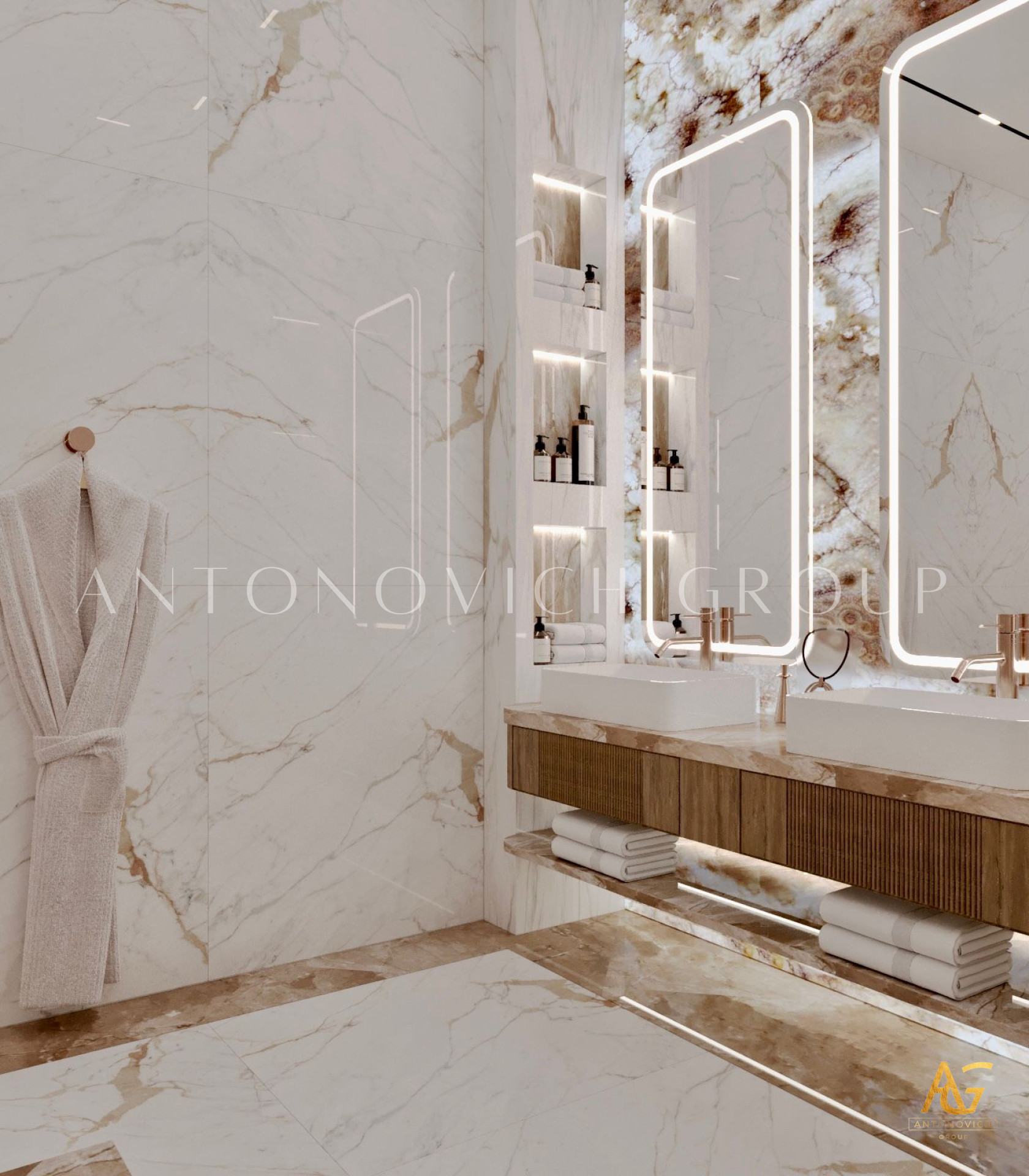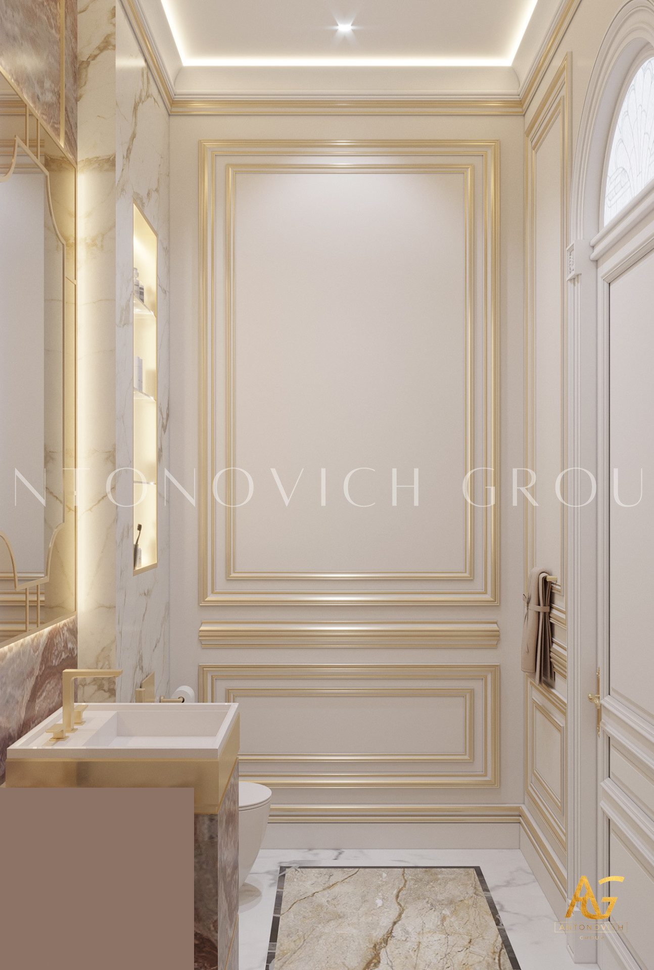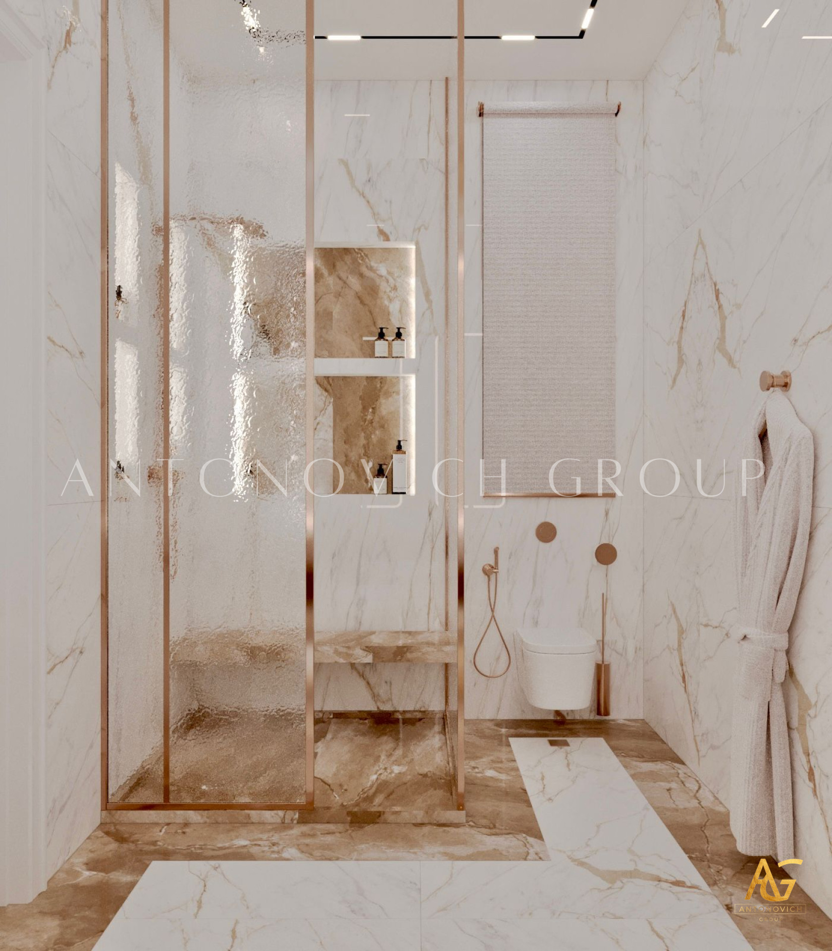 Apartment Interior design in Dubai is stylish and sophisticated filling the luxury apartment with the special charm of modern luxury. The space of the bathroom is perfectly organized for the owners of the luxury apartment to feel completely comfortable and cozy. The bathroom design like the design of the rest of the apartment sets a festive mood, giving a sense of aesthetic pleasure. The interior is full of charming decorations. A marble floor with an exquisite pattern of carved stone defines the center of the room, but as elegant chandelier shades with fine dark chocolate shade. It looks beautiful and expressive with a dressing table. Luxury furniture looks fantastic on the background of a large panel with a mirror facet. Graceful white pilasters framed mirrors, making the song complete.
