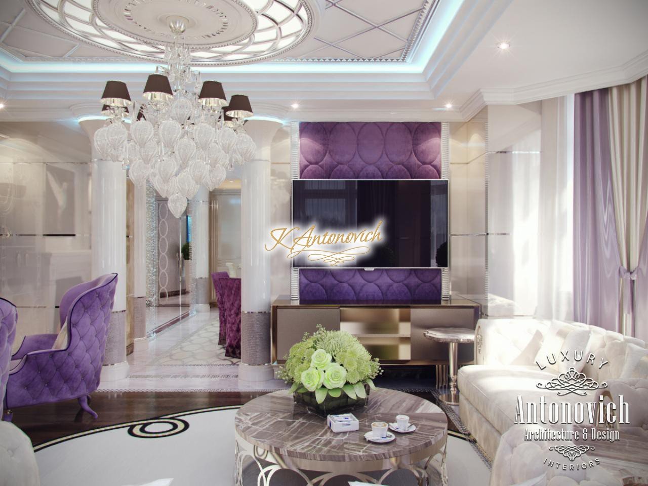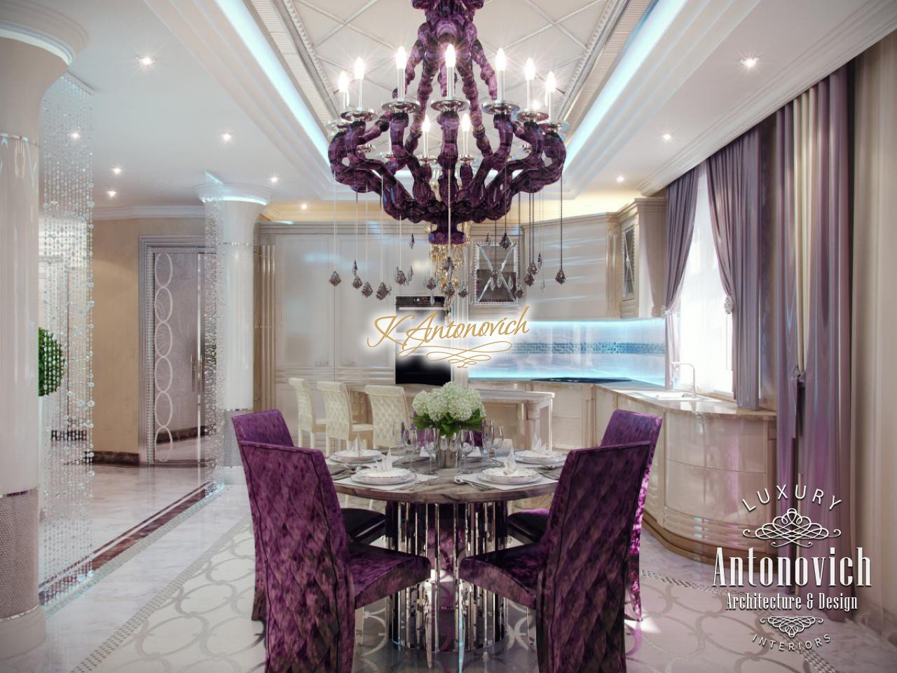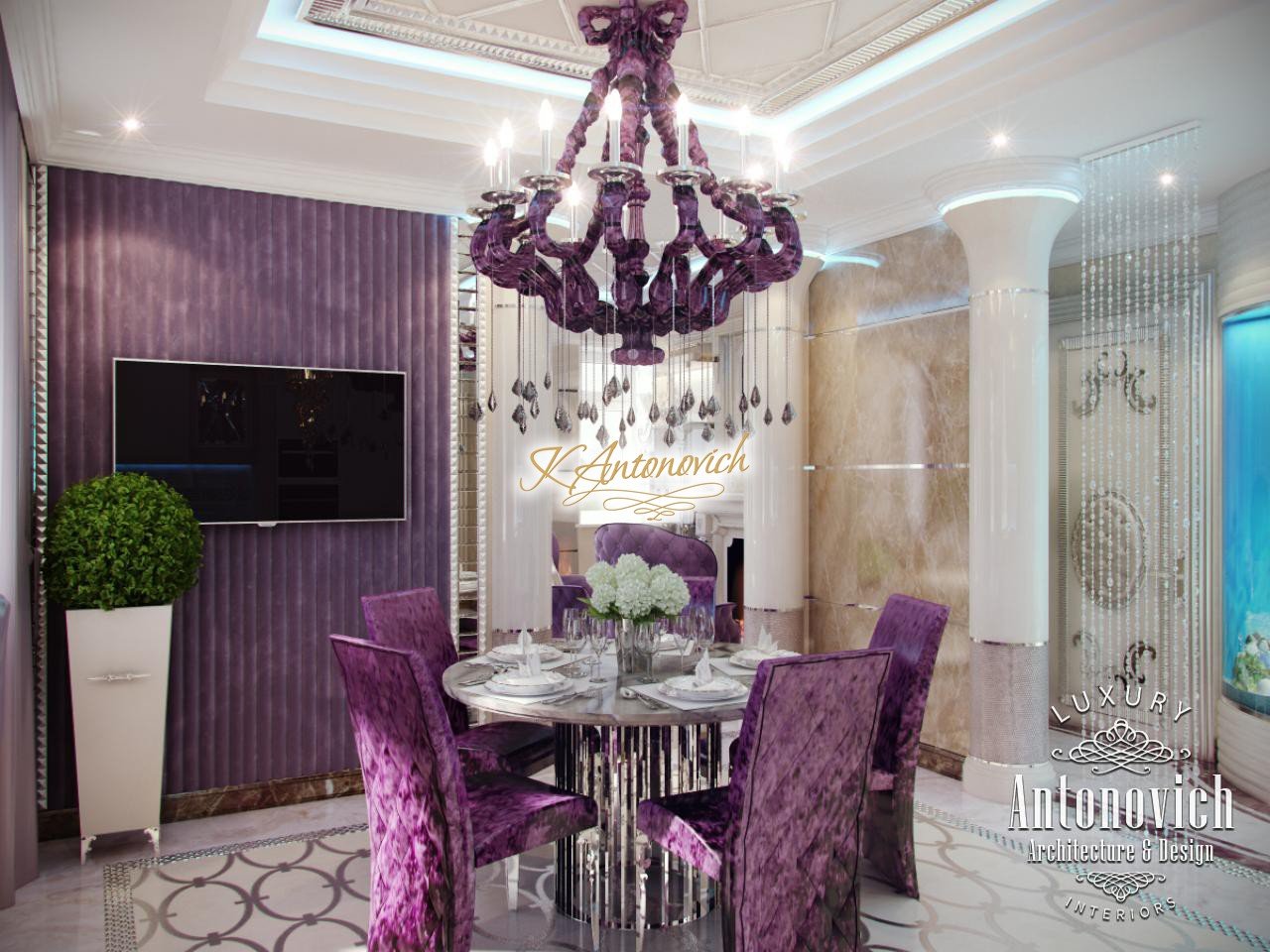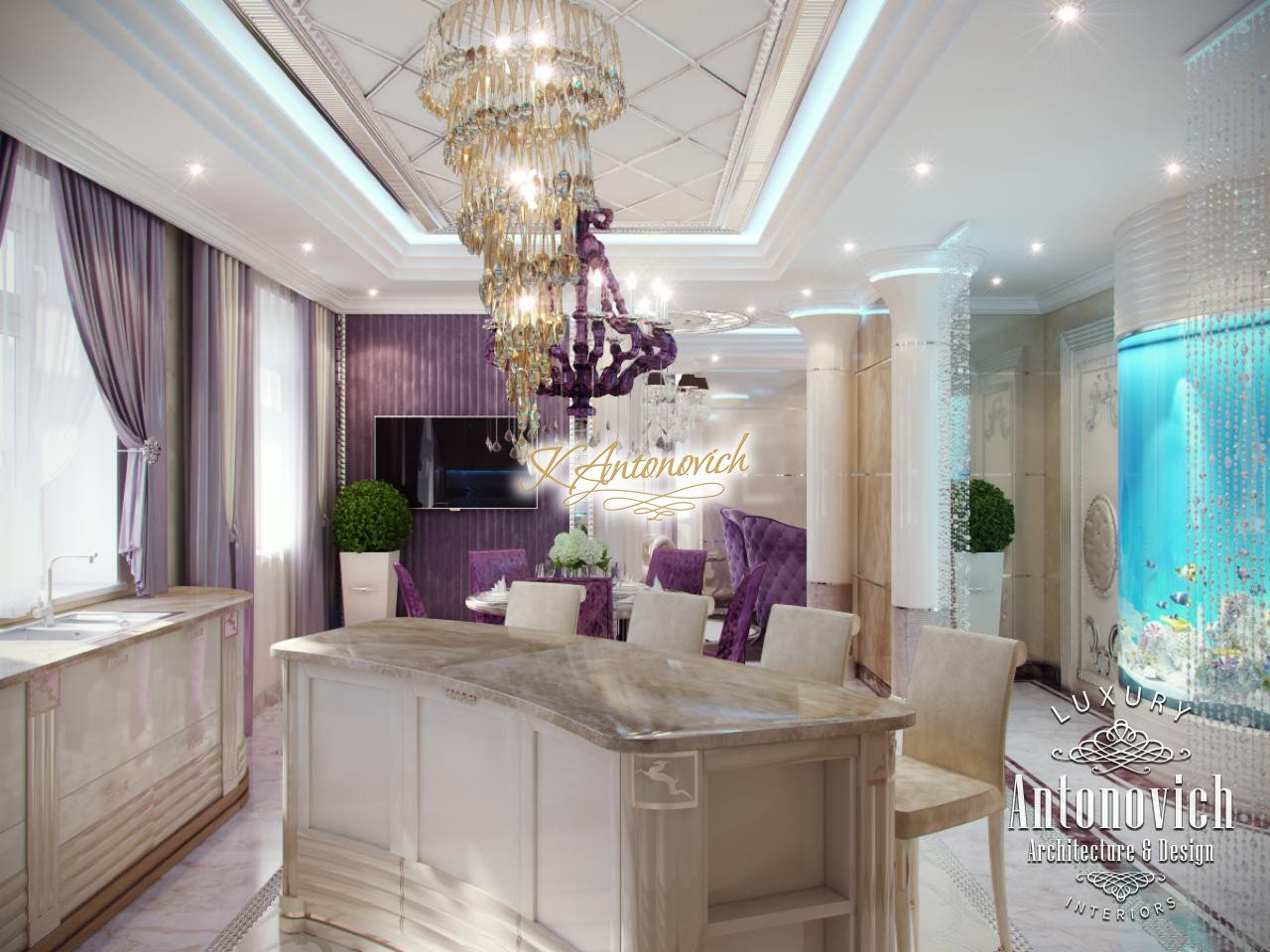 Easy mood of warmth and comfort that has been made by interior designers in the unique apartment project charms and delights. Apartment design in essence became a luxurious mix of modern classics and art deco. And bright character of the apartment interior is based on bright interior solutions. Interior Design Dubai invariably combines familiar to us interior details and innovative solutions. The basis of a bright image of the apartment project is a living room interior. The room is full of charm, which subtly repeated image of a charming lady. The basis of a cozy living room is luxurious furniture. Soft sofas upholstered in silk velvet of delicate creamy colour. Soft chairs by the fireplace are upholstered in velvet of juicy lilac shade. This game of contrasts gives the interior an additional charm. Curtains design picks up these charming motifs. The windows are decorated with silk curtains of noble cream and purple. Ceiling decor complements the room with shine and glamor. LED lighting in interiors becomes more traditional. Using it along with traditional chandeliers, interior designers Dubai make images of projects more stylish and expressive. In the walls decor there is a charming contrast. And not only colors contrast, but materials and textures that designers offered for decoration. Soft velvet wall panel not only decorates the interior, but also is a wonderful way of sound insulation. A wall decor of natural marble emphasizes the respectability of the apartment.