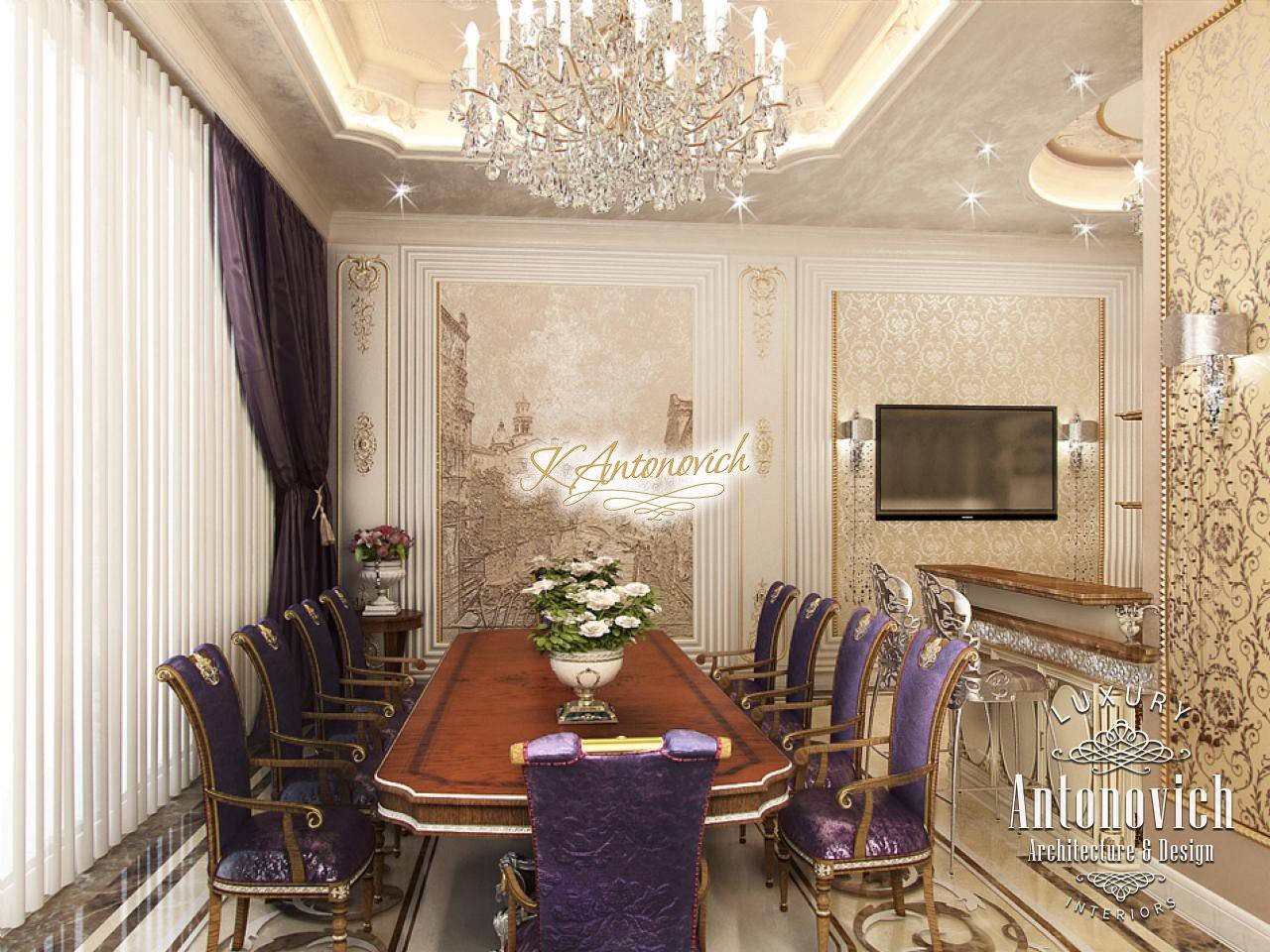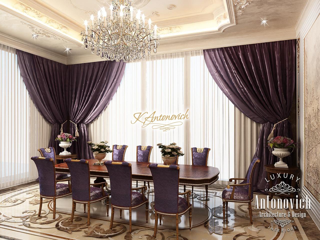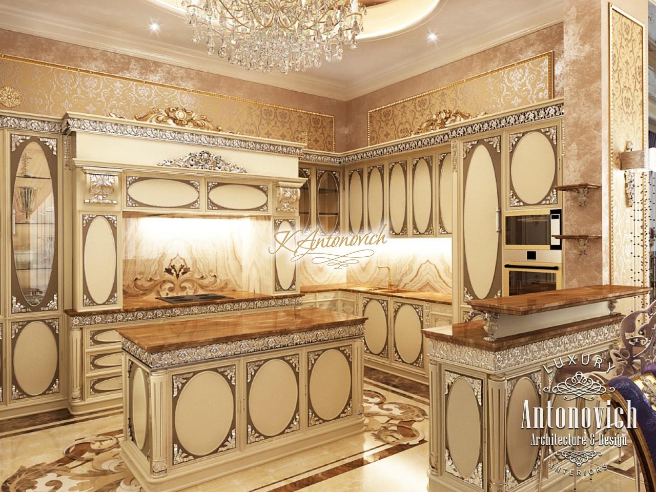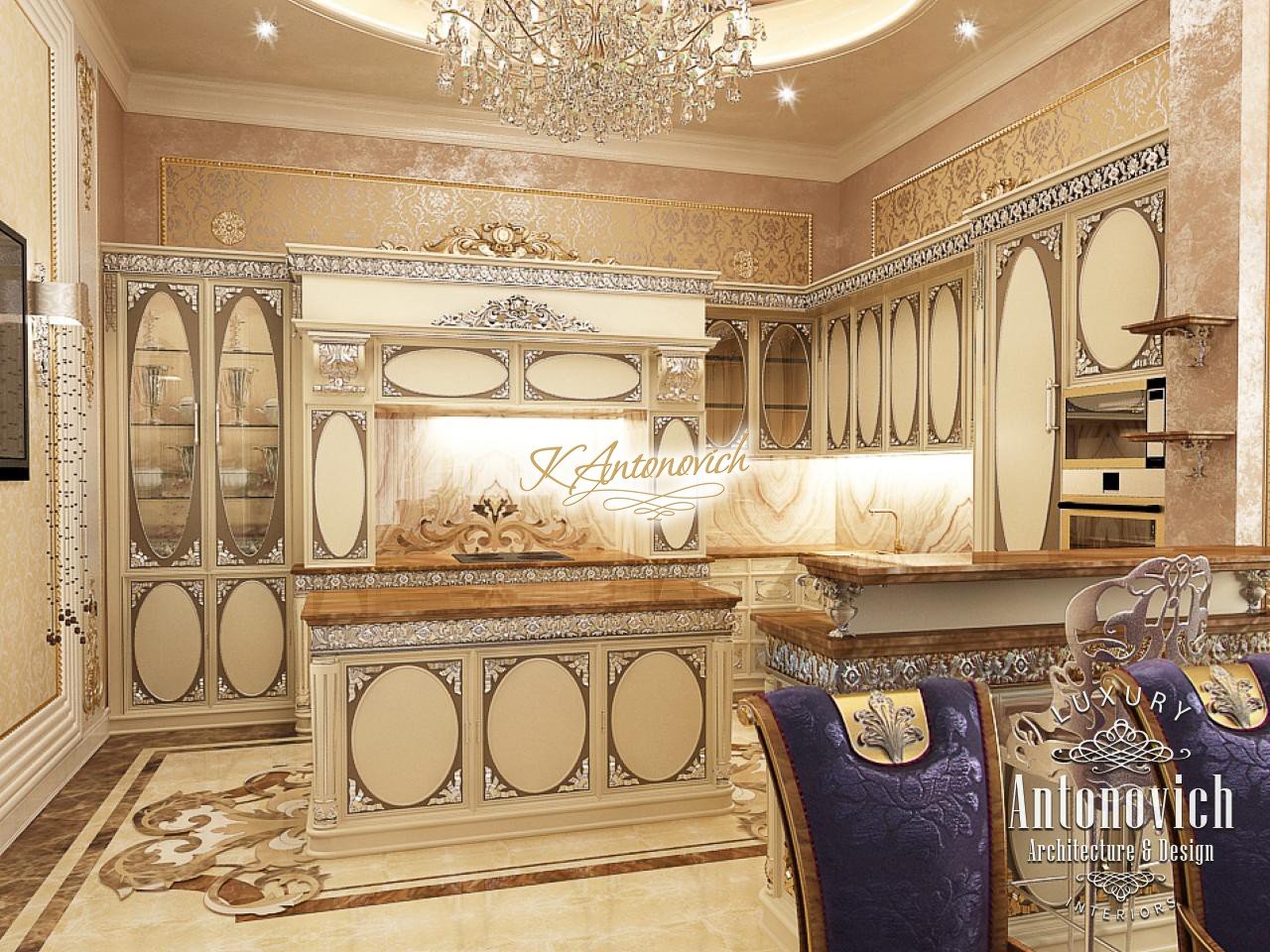 The classical style of the interior underlines its elite status, respectability and refined taste of the owners of the house. Villa Design in Dubai impresses with its elegant and unique features, luxurious image. Elite interior design studio Luxury Antonovich Design creates unique beauty of classical interiors. In this project for the kitchen interior designers offered elegant solutions in the decoration and organization of space. Kitchen interior design is gorgeous in every detail. Area dining room is decorated with a large dining table made of wood of valuable species with carved decoration and soft chairs with high noble backs that are encrusted with handmade carved decoration. The chairs are upholstered in soft purple velvet of pleasant shade that perfectly blends in the decoration of windows. The windows have curtains made of silk velvet in the same colors. The elite status of the interior and the classical romantic orientation are emphasized with the bas-relief on one wall. Kitchen design in classical style is complemented by moments of modern storage systems, as well as new ways of lighting. Luxury kitchen furniture facades of two types of wood look refined at the background of luxury wallpaper in wall decor. In this fantastic and magnificent interior each meal becomes a special charm, a special elegance.