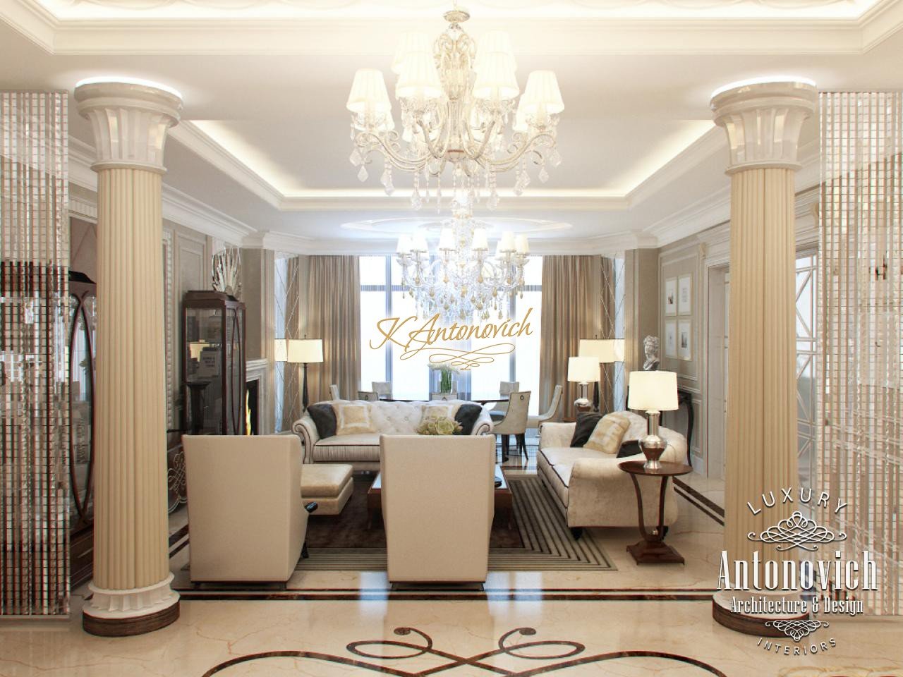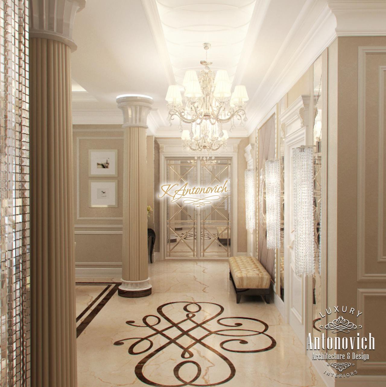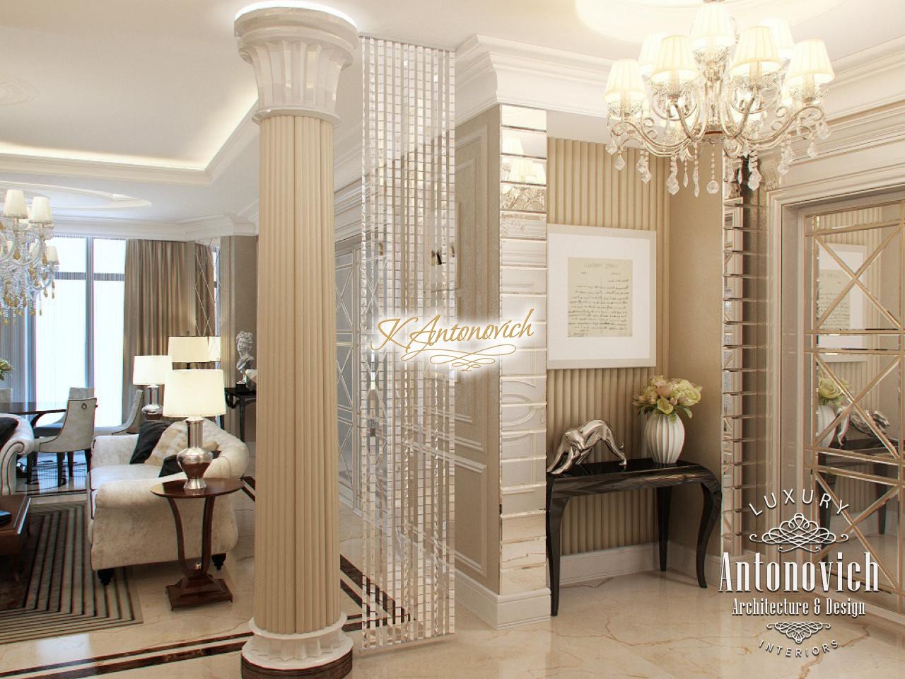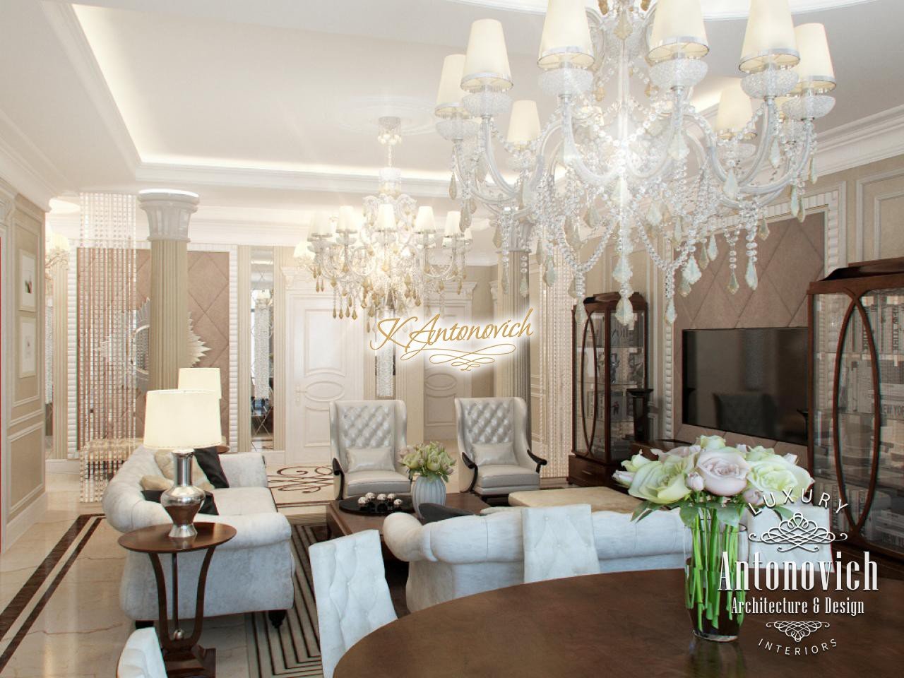 Apartment design Dubai from the studio Luxury Antonovich Design is in the style of neoclassicism. Interior designers in this elegant and a little prim style added some accents of elegant art deco. The integrity and expression of the the apartment project is based on luxurious design techniques. Hall of the apartment meets with light mood of romance and warmth of home comfort. The snow-white ceiling with ornate chandeliers is visually supported by two columns with exquisite cream-colored trunks, which are decorated with a goffre effect. The white capitals are highlighted with soft lighting. In the wall decor a soft velvet wall panel of coffee with milk color looks charming and rustic. Glitter of luxury is supplemented with curtains of crystal beads and charming carvings on the marble floor. Interior designers Dubai continue The the same motifs in the decoration of walls, ceiling and floors in the cozy living room interior. Bedroom design embodies tenderness and elegance. Here the interior is also decorated with textile panel with a shallow sink marks, bringing the interior a perfect mood of warmth and home comfort. Apartment Design Dubai differs with ideal organization of space. Interior designers have created a modern storage system for a dressing room and a kitchen interior. Two bathrooms are elegant and romantic. Apartment interior design adjusts to positive emotions and a sense of absolute comfort. Everything shines with soft and aesthetic perfection.