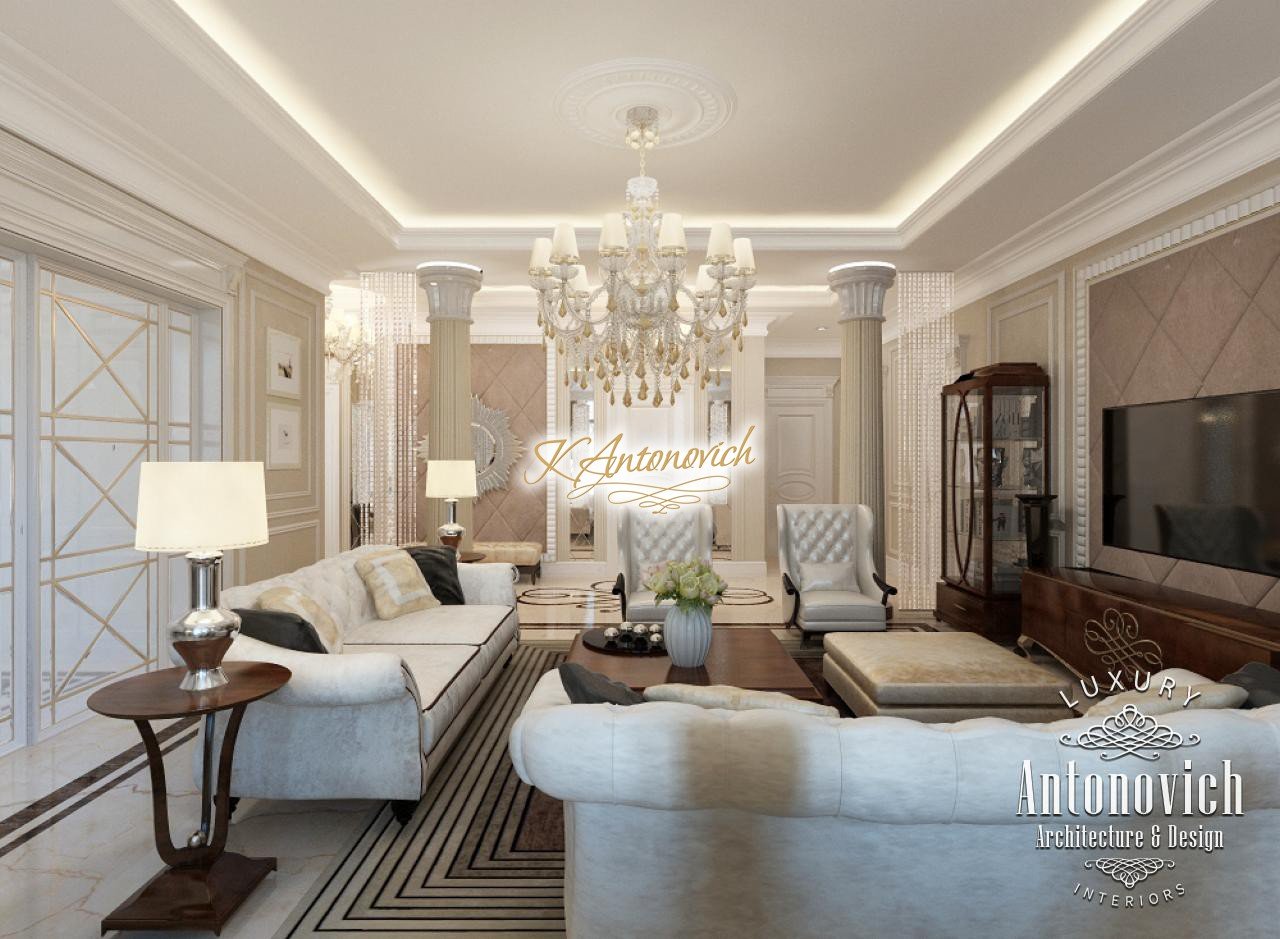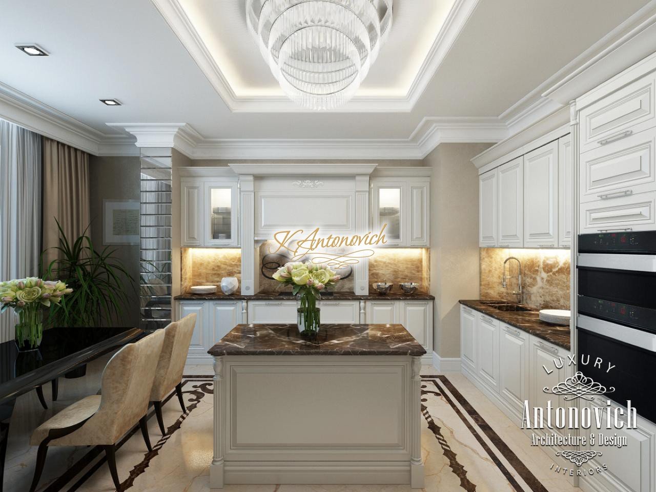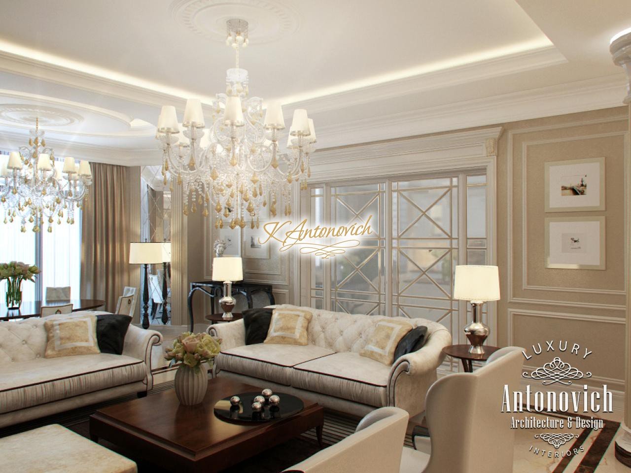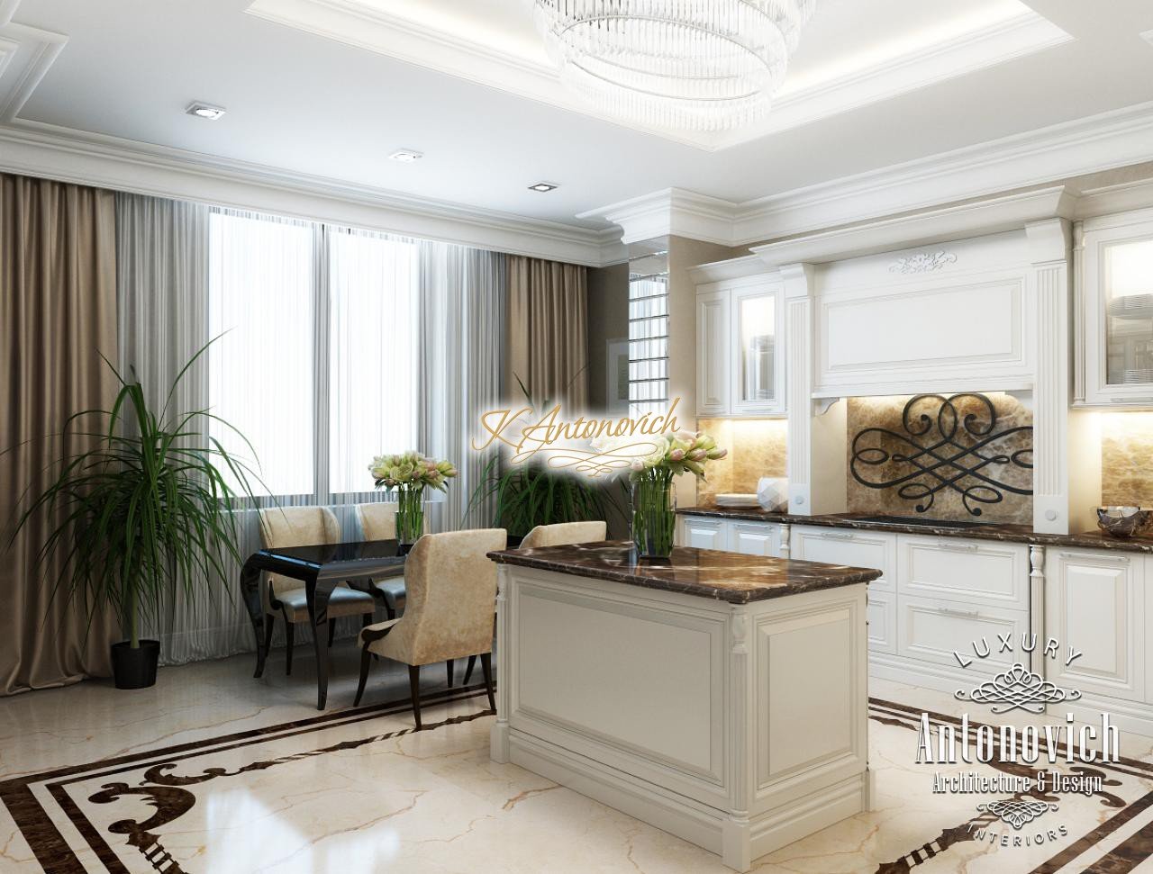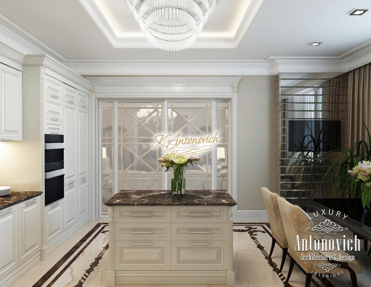 Apartment design Dubai from the studio Luxury Antonovich Design is in the style of neoclassicism. Interior designers in this elegant and a little prim style added some accents of elegant art deco. The integrity and expression of the the apartment project is based on luxurious design techniques. Hall of the apartment meets with light mood of romance and warmth of home comfort. The snow-white ceiling with ornate chandeliers is visually supported by two columns with exquisite cream-colored trunks, which are decorated with a goffre effect. The white capitals are highlighted with soft lighting. In the wall decor a soft velvet wall panel of coffee with milk color looks charming and rustic. Glitter of luxury is supplemented with curtains of crystal beads and charming carvings on the marble floor. Interior designers Dubai continue The the same motifs in the decoration of walls, ceiling and floors in the cozy living room interior. Bedroom design embodies tenderness and elegance. Here the interior is also decorated with textile panel with a shallow sink marks, bringing the interior a perfect mood of warmth and home comfort. Apartment Design Dubai differs with ideal organization of space. Interior designers have created a modern storage system for a dressing room and a kitchen interior. Two bathrooms are elegant and romantic. Apartment interior design adjusts to positive emotions and a sense of absolute comfort. Everything shines with soft and aesthetic perfection.