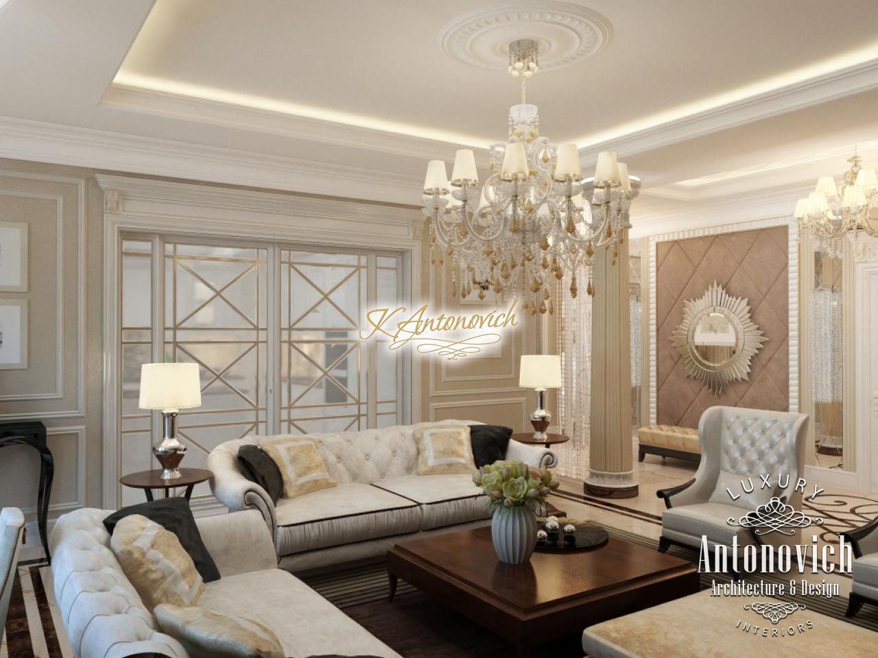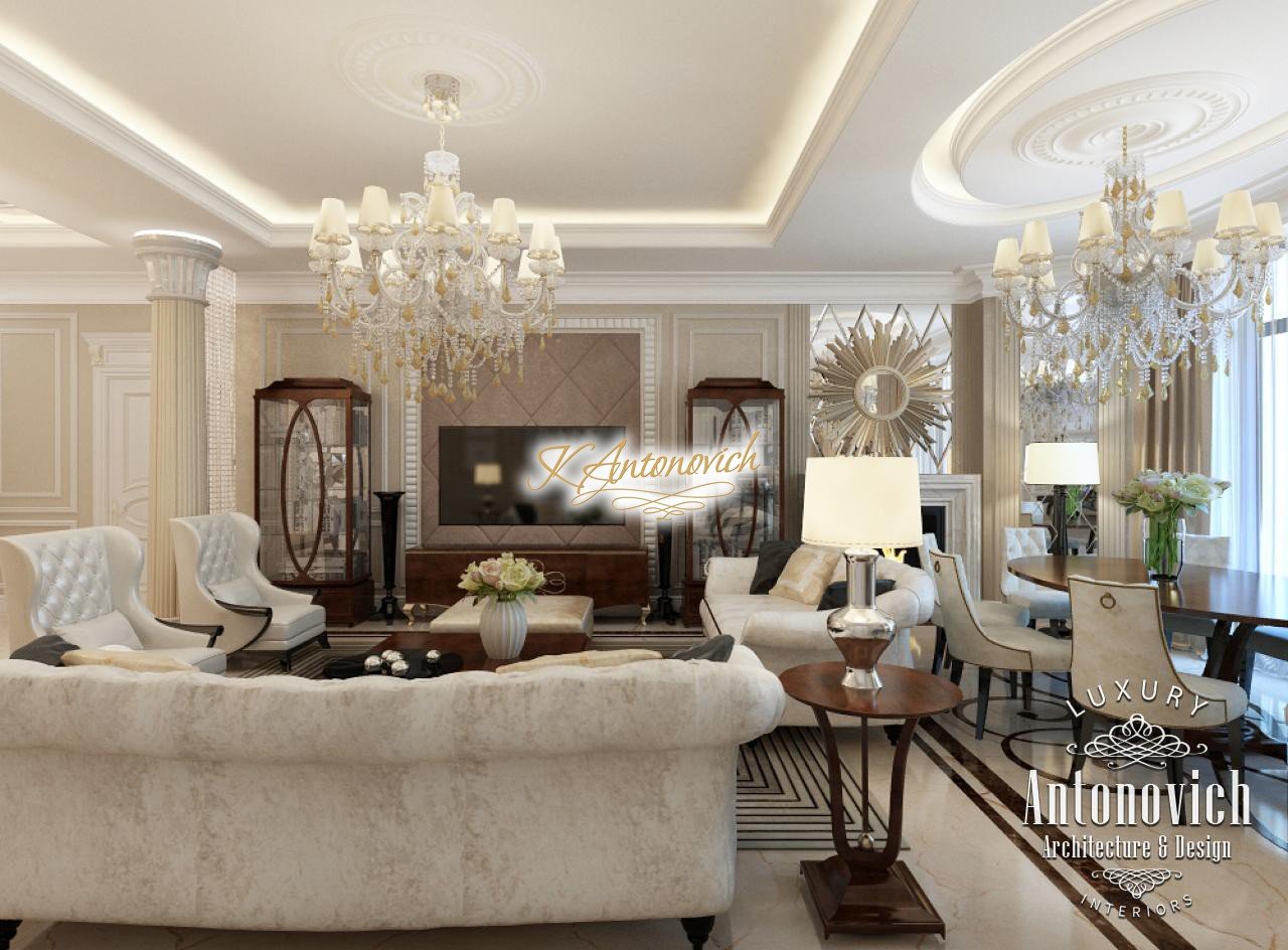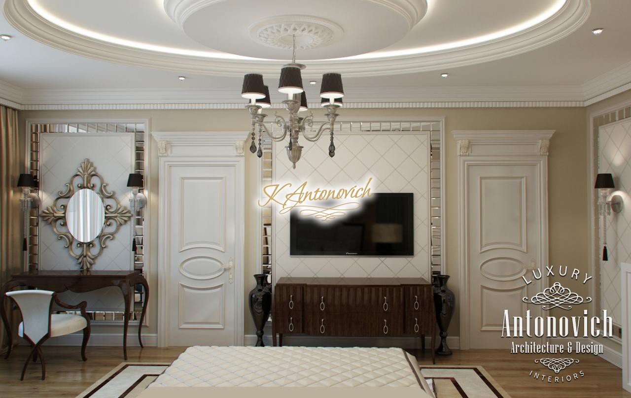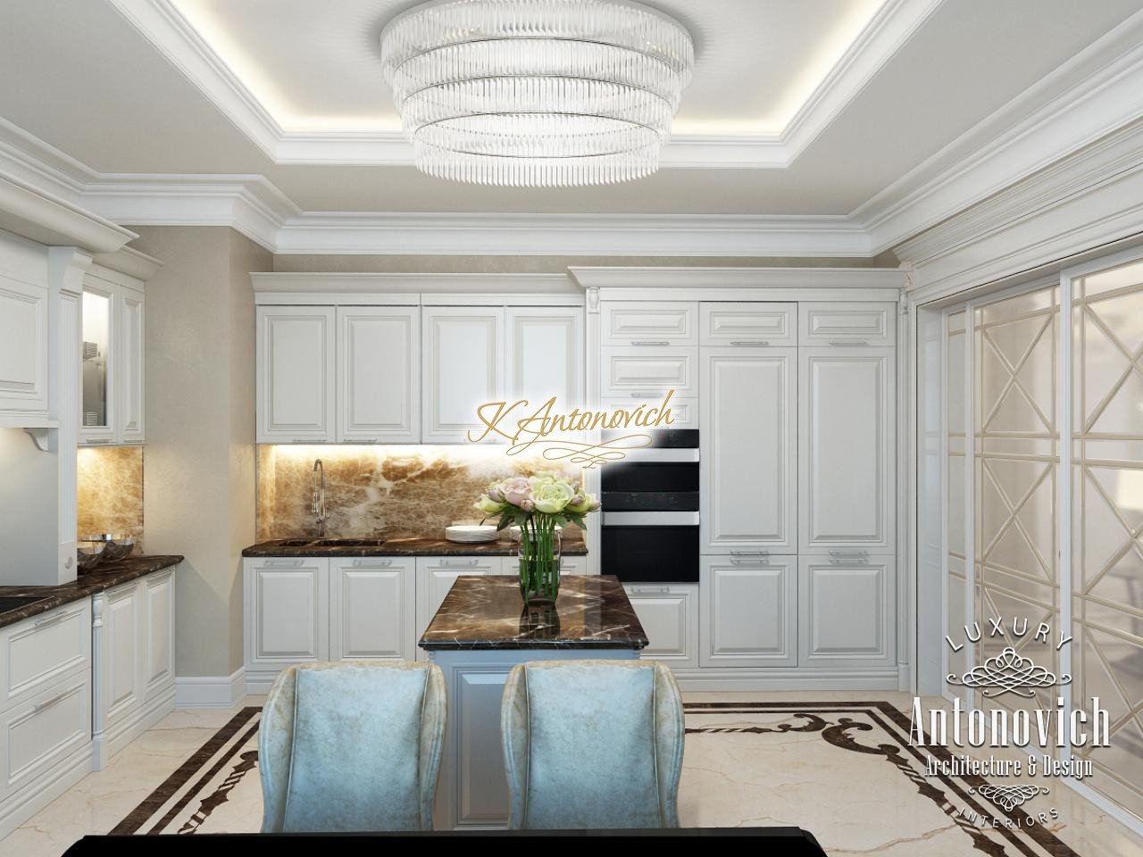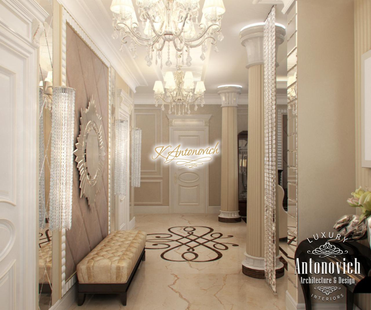 Apartment design Dubai from the studio Luxury Antonovich Design is in the style of neoclassicism. Interior designers in this elegant and a little prim style added some accents of elegant art deco. The integrity and expression of the the apartment project is based on luxurious design techniques. Hall of the apartment meets with light mood of romance and warmth of home comfort. The snow-white ceiling with ornate chandeliers is visually supported by two columns with exquisite cream-colored trunks, which are decorated with a goffre effect. The white capitals are highlighted with soft lighting. In the wall decor a soft velvet wall panel of coffee with milk color looks charming and rustic. Glitter of luxury is supplemented with curtains of crystal beads and charming carvings on the marble floor. Interior designers Dubai continue The the same motifs in the decoration of walls, ceiling and floors in the cozy living room interior. Bedroom design embodies tenderness and elegance. Here the interior is also decorated with textile panel with a shallow sink marks, bringing the interior a perfect mood of warmth and home comfort. Apartment Design Dubai differs with ideal organization of space. Interior designers have created a modern storage system for a dressing room and a kitchen interior. Two bathrooms are elegant and romantic. Apartment interior design adjusts to positive emotions and a sense of absolute comfort. Everything shines with soft and aesthetic perfection.