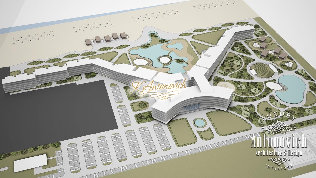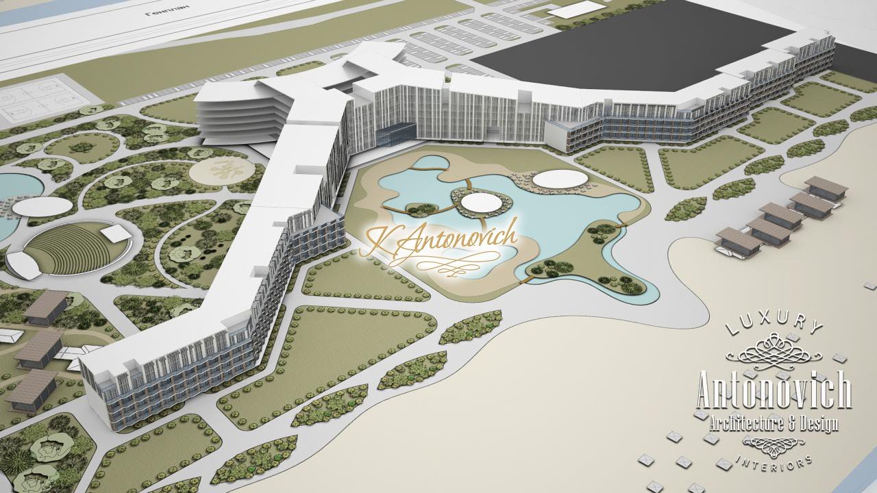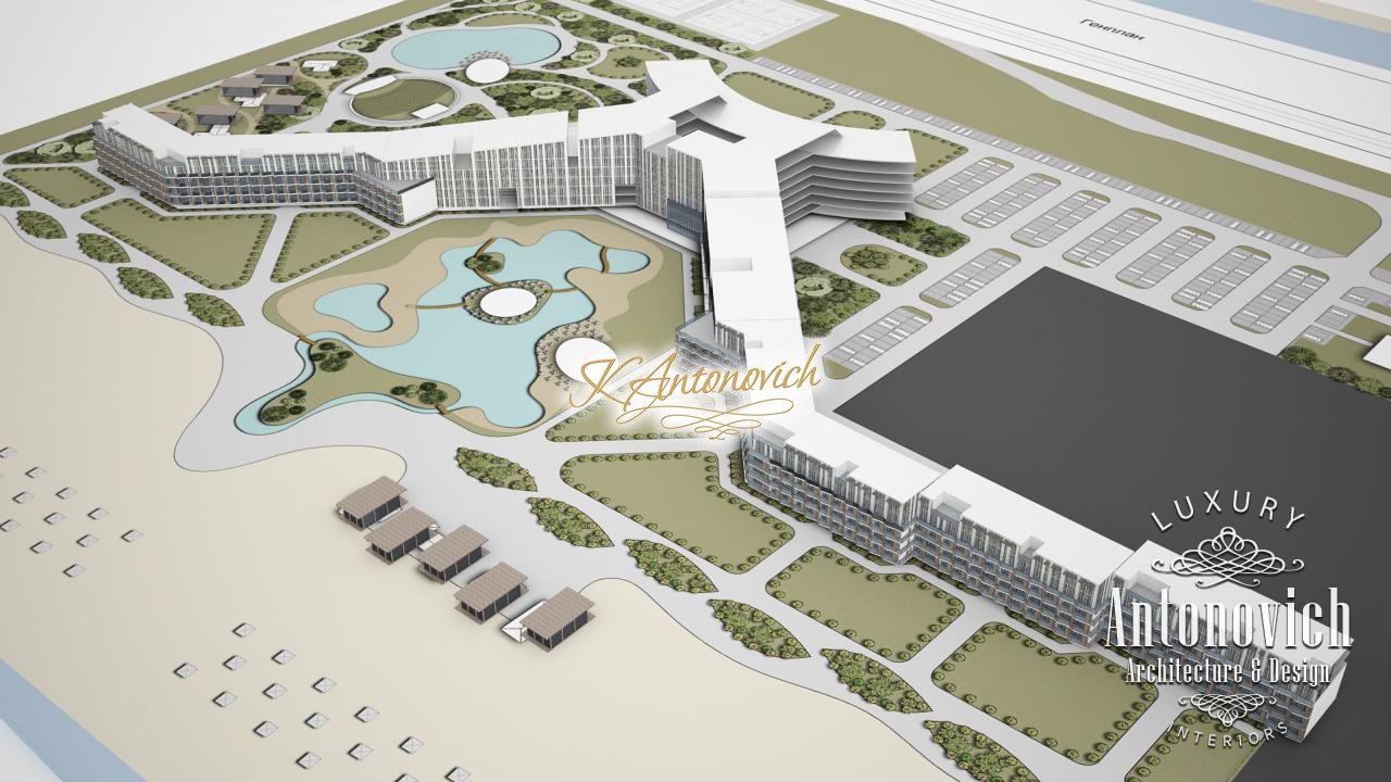 The scale of this architectural design is impressive with unique beauty of the original solutions. Visual perception of the architectural ensemble of the hotel complex in Dubai is distinguished by clarity and harmony, both nearby and bird's eye panorama. Architect Dubai accurately completes the task in terms of building regularities, agreement on certain elements of the building and bringing of all the elements to a unified image of clean lines perfection and shapes. Architectural design distinguishes with unique original solutions in terms of quiet rhythm of facades, which is formed by windows and a combination of symmetric elements. The project clearly meets the marketing strategy of the network of luxury hotels and underlines their style of service. The ease and grace of an architectural ensemble, which from bird's eye visually resembles wings, adjusts to the pleasant and romantic mood. That symmetry, which is one of the most common methods in architecture, is a part of the author's ideas and adds a perfect a flawless image of the project. The architects Dubai created a multi-faceted image with several symmetrical planes. The complexity of the project, on the basis of which gorgeous architectural ensemble turned out, is based on the addition of the compositions with mixed structures. Architectural studio Luxury Antonovich Design Dubai offers a comprehensive approach that includes full support for the project. Necessary part of the design is also a landscape design. Professional approach to business is based on the successful experience of projects of luxury hotels worldwide.