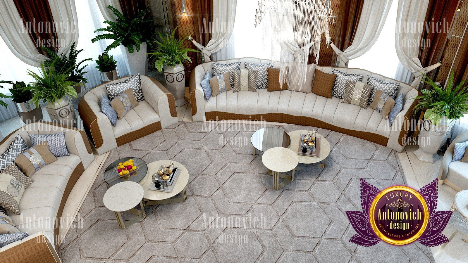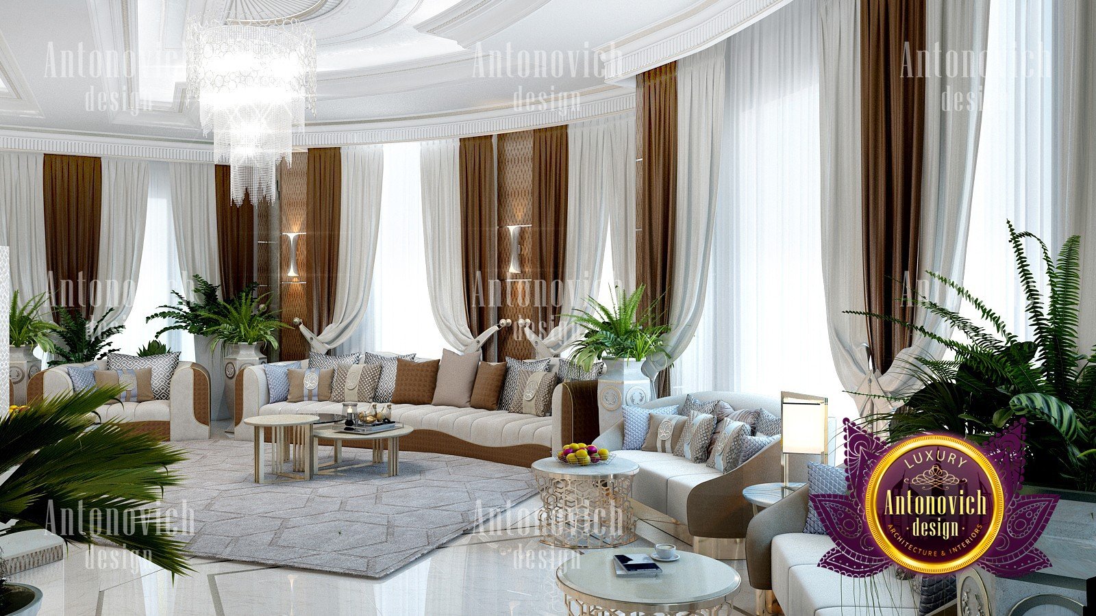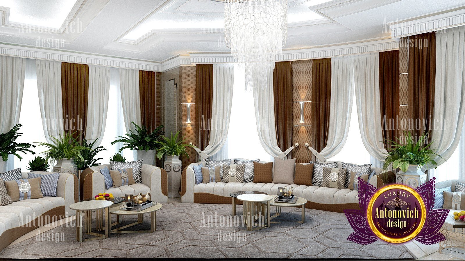 And elegant console tables, mirrors and exquisite lamps complement. Floors design with unique carved patterns make the handwriting of designers recognizable. In the hall on the floor pattern echoes elegantly decorated ceiling. The living room interior designers Dubai offered large curls of carved patterns that look great in a spacious apartment with ceilings, extending the full height of the building. From the cozy hall, we get into a posh living room. The semi-circular portal of the building with tall windows opened up space for creative designers.