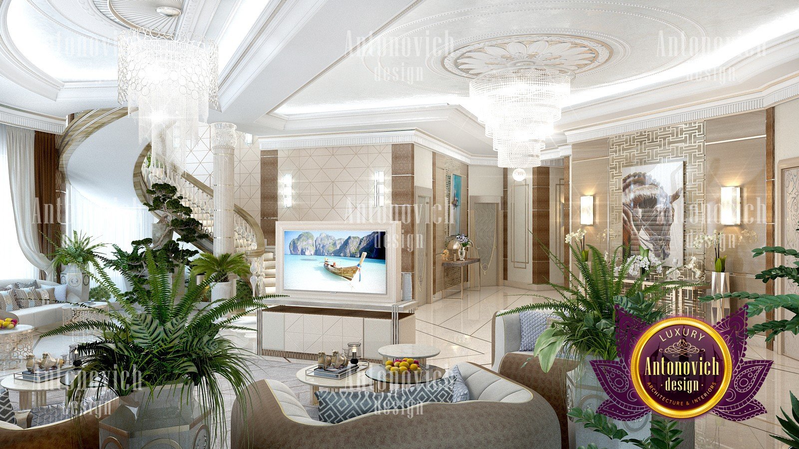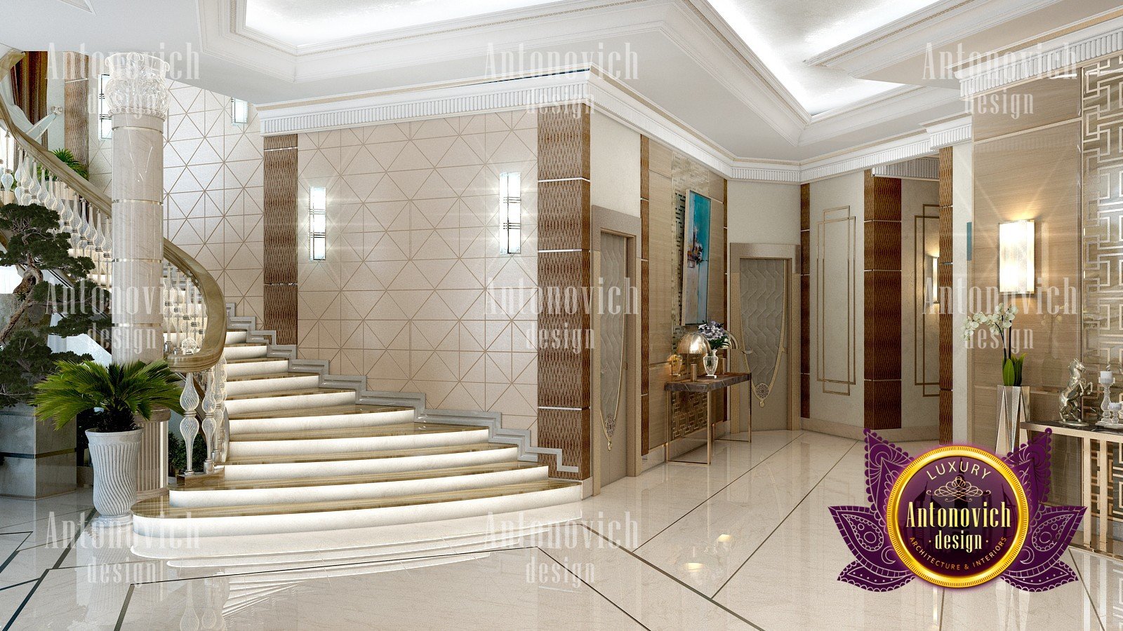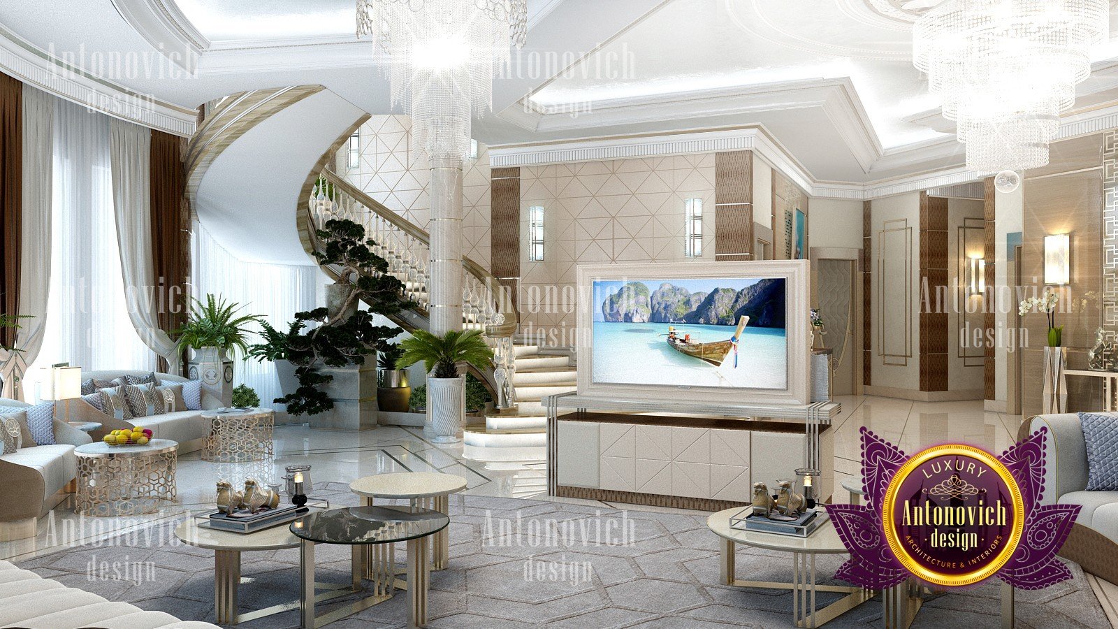 Luxurious interior with very bright and effective features is offered by studio designers of Luxury Antonovich Design. Consistency of shapes and lines, the perfect combination of colors and textures formed the basis of impeccable image of the interior. Villa design Dubai is full of spectacular designs. The hall interior was the beginning of a luxurious and comfortable interior story. Interior designers use the method of symmetry. Two soft wall panels, which are covered with noble velvet of purple hue, as if reflected in each other.