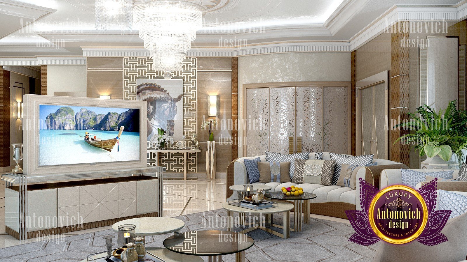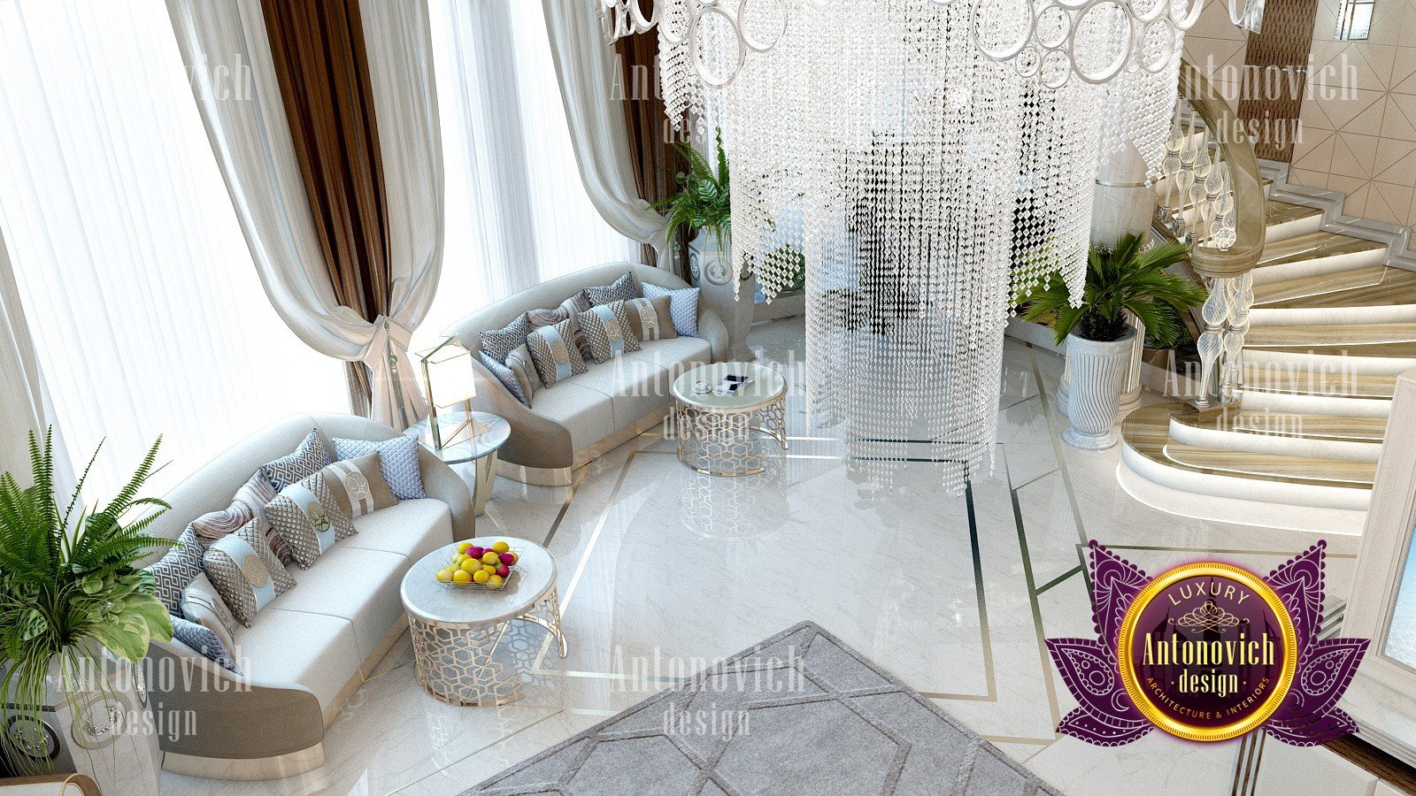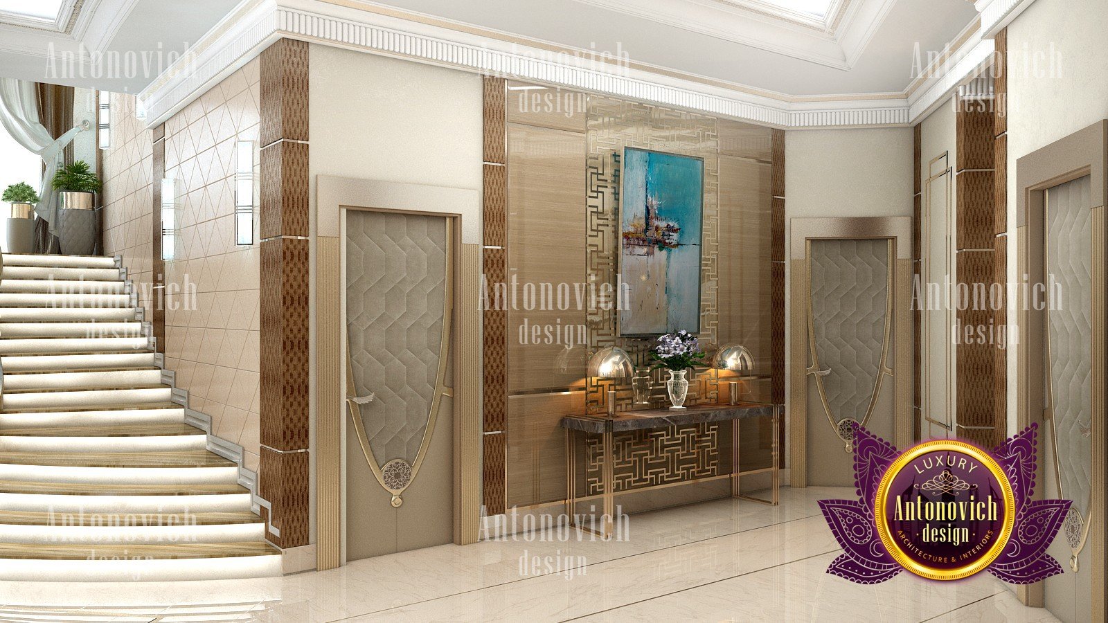 Luxurious interior with very bright and effective features is offered by studio designers of Luxury Antonovich Design. Consistency of shapes and lines, the perfect combination of colors and textures formed the basis of impeccable image of the interior. Villa design Dubai is full of spectacular designs. The hall interior was the beginning of a luxurious and comfortable interior story. Interior designers use the method of symmetry. Two soft wall panels, which are covered with noble velvet of purple hue, as if reflected in each other.