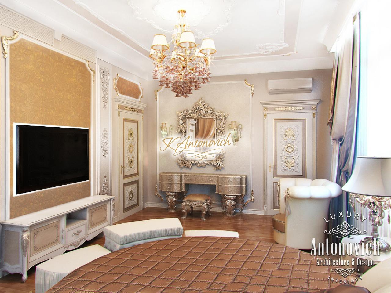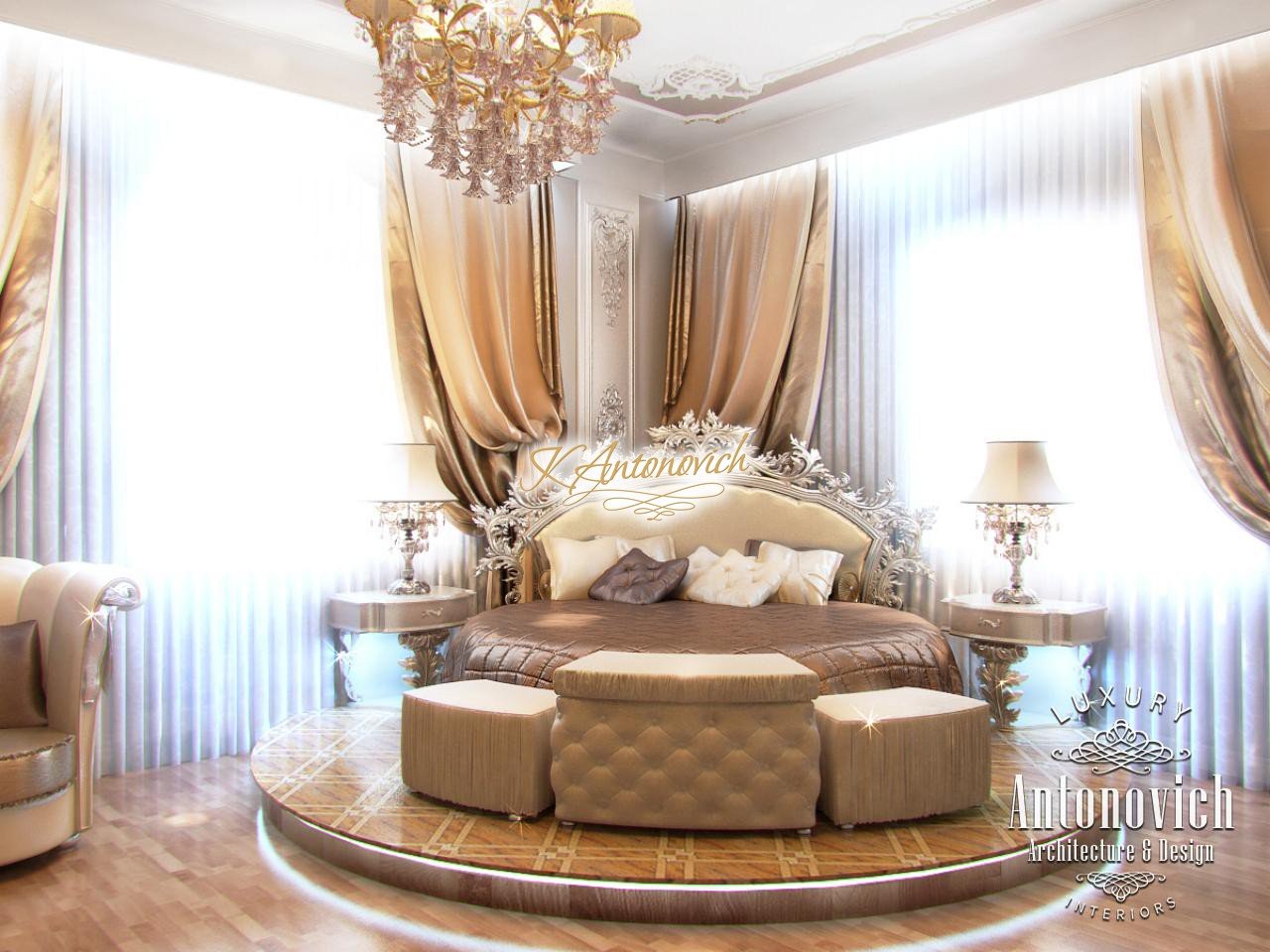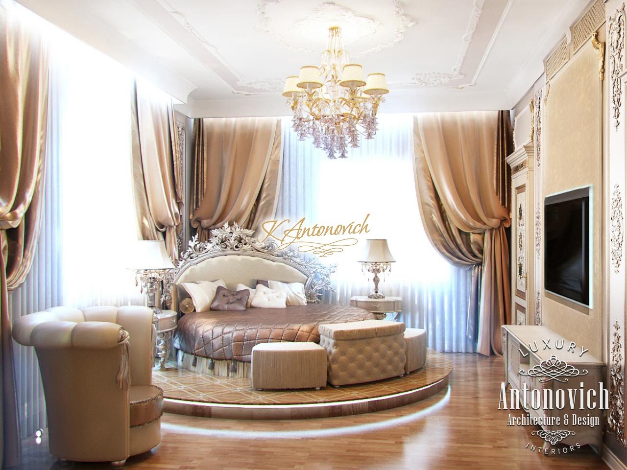 Extraordinary in its beauty bedroom interior design is offered by Luxury Antonovich Design studio in the luxury apartment. Elegant and sophisticated, stylish and bright interior with a particularly romantic charm delightfully reflects the character and personality traits of the owner of the apartment. The apartment design Dubai takes into account architectural layout of the apartment. And bedroom design particularly emphasized that in the corner of the room, there are two large windows. In order to make the interior image complete, interior designers Dubai place great comfortable bed on a low round podium in the corner between two windows. This solution has brought to the bedroom bright element of personality. Podium, like the floor, is decorated with flooring boards of wood of valuable species. The line LED illumination around the perimeter of the floor of the podium looks effectively. The configuration of the bed perfectly fits in this picture. Round bed is adorned with a high upholstered headboard carved with lace patterns. Blinds in the interior of noble silk of two hues, filling with cozy bedroom with mood and emphasizing its respectability. To create in the bedroom interior effect of absolute comfort interior designers Dubai include several additional items of upholstered furniture, upholstered in creamy velvet. The mood of tenderness and grace complement the decor with white swirls of ceiling moldings and refined chandeliers. Bedroom interior design deliciously repeats all motives of the apartment interior and at the same time has its own cozy and seductive mood.