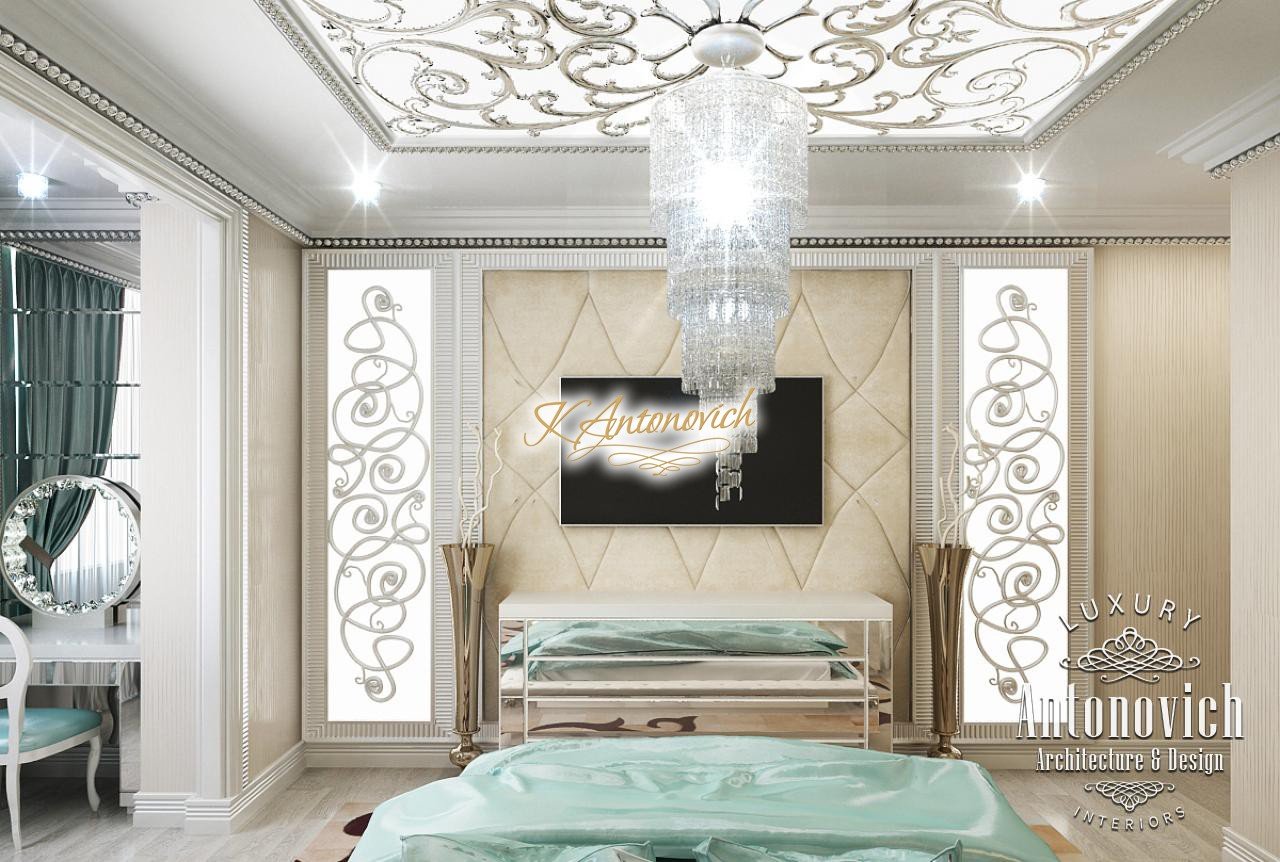 Apartment interior design is divided into several areas. And bedroom interior design is a story with a special interior mood. Luxury interior design from studio Luxury Antonovich Design in each project reflects the fashion trends in interior, preferences of customers, their dreams of an ideal habitat and status. Apartment Design Dubai in the style of neoclassicism with light accents of art deco. Bedroom interior radiates tenderness and warmth, elegance and sophistication. Bedroom Design project includes some alterations to the apartment. Interior Designers Dubai joined a small loggia with the bedroom and organize a cozy corner with a table with a boudoir. Wall decor in the form of mirror panels visually expands the space of this zone. Bedroom interior itself is designed in warm shades of light, which are underlined with gentle turquoise silk shades in the decoration of windows and the decoration of the bed. This fashionable element of decoration in interiors of any style as soft wall panel in the bedroom interior complements its softness and warmth. The panels are upholstered in soft creamy velvet. Shallow marks with large diamonds complete the image of the interior with expressiveness. Dubai Interior designers always use the opportunities of new technologies. This is an excellent way to realize the most daring design solutions. In this project, with the help of LED backlight and new materials, they create an original wall and ceiling decor. Niches illuminated through the delicate patterns fill the interior with charm.