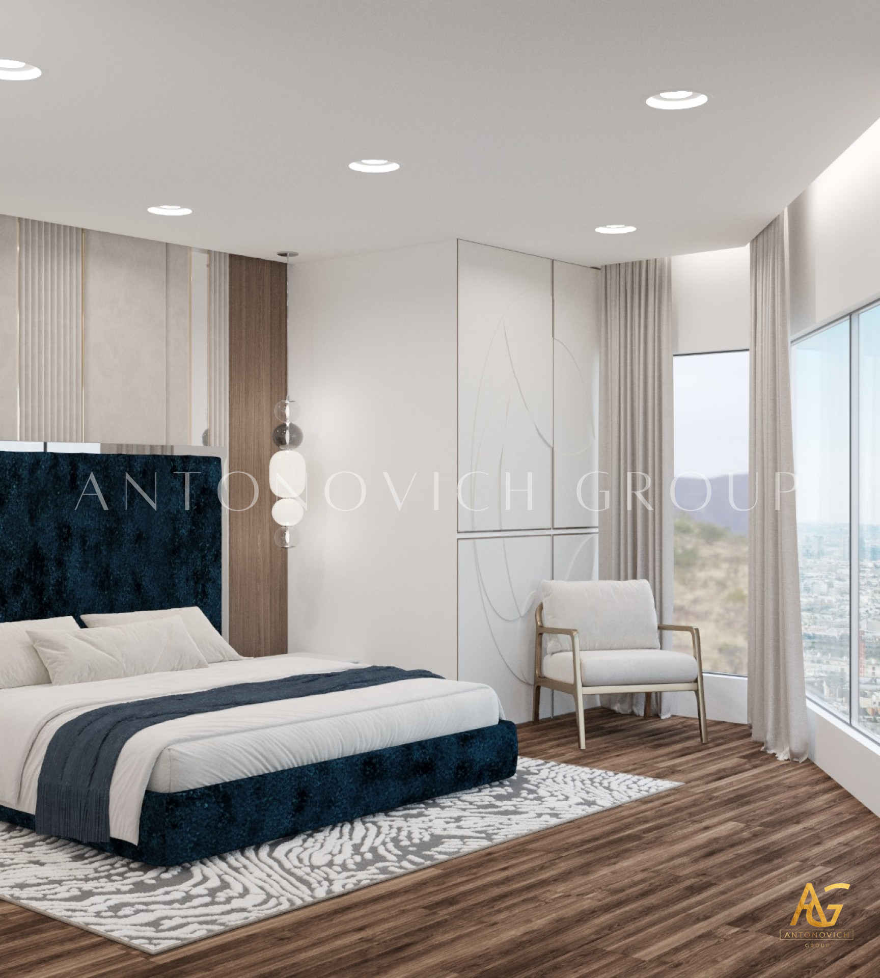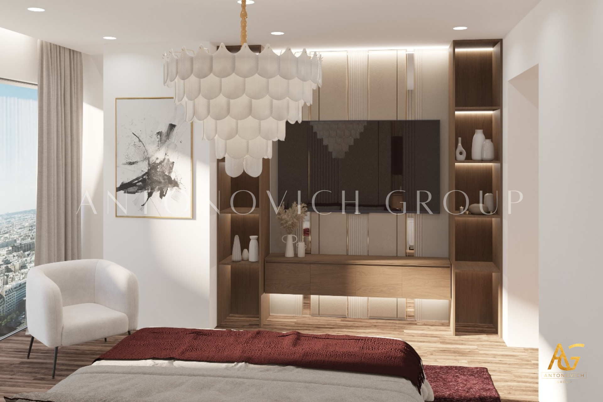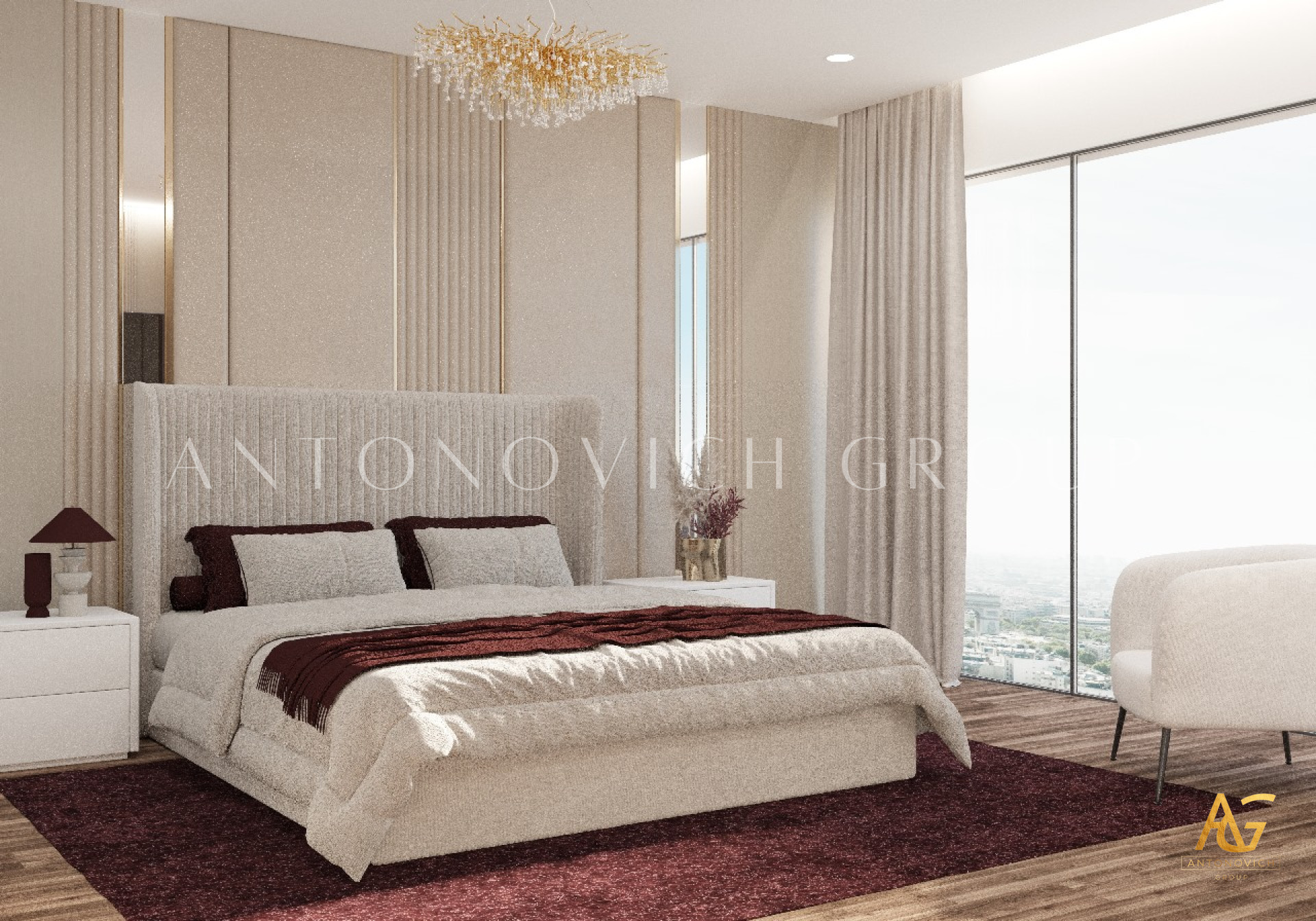 Each member of a large and happy family is a person with a bright and extraordinary personality. And interior designers UAE beautifully reflected this uniqueness and originality in the authors apartment project. The most striking and eye-catching is a living room interior. Luxurious upholstered furniture of noble velvet in burgundy hue contributes to this. Apartment design as a whole is made in the best traditions of modern classics. As befits a modern stylish interior, a living room and dining area are a single space. The cozy dining area with a large dining table surrounded by padded chairs with noble backs is located at a large window. The dark velvet upholstery contrasts stylishly with a warm shade of beige silk in windows decoration. Apartment interior design is full of elegant and bright accents. So kitchen design has a bright and stylish character. Against the background of laconic kitchen furniture facades high upholstered chairs look luxury and catchy. Interior designers have paid special attention to childrens room design for two daughters of the homeowners. Childrens room design perfectly contributes to the harmonious development of children and education of their sense of beauty. In a pleasant pastel shades of childrens room interior decorative painting on the wall behind headboards looks luxurious. Bedrooms interiors are in a style of Art Deco, with its bright and elegant character. Mirrored panels, canopies, soft wall panels and silk wallpaper. All these are bright accents of luxurious apartment interior.
