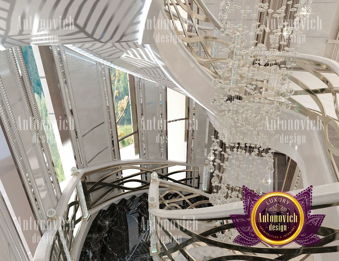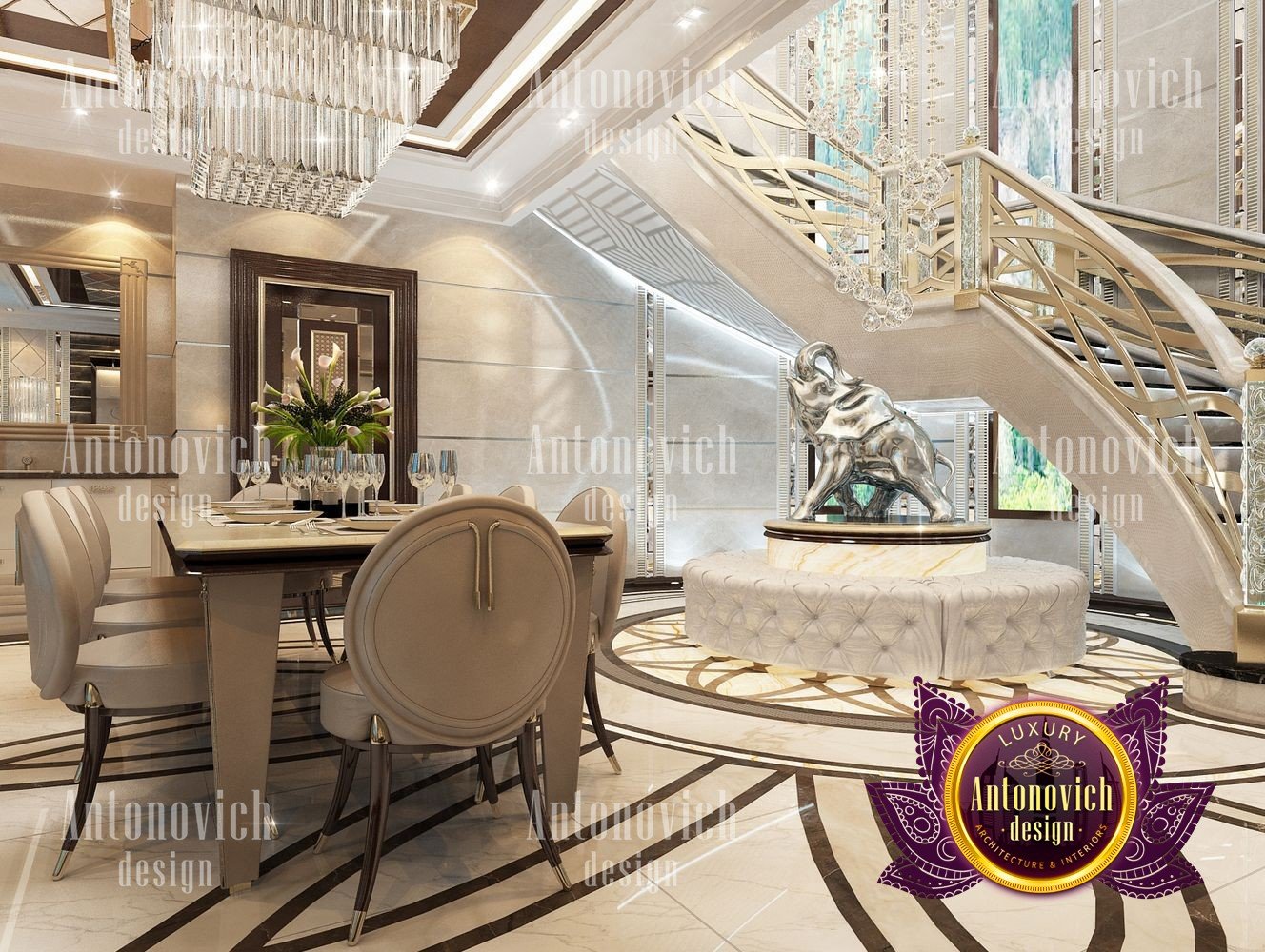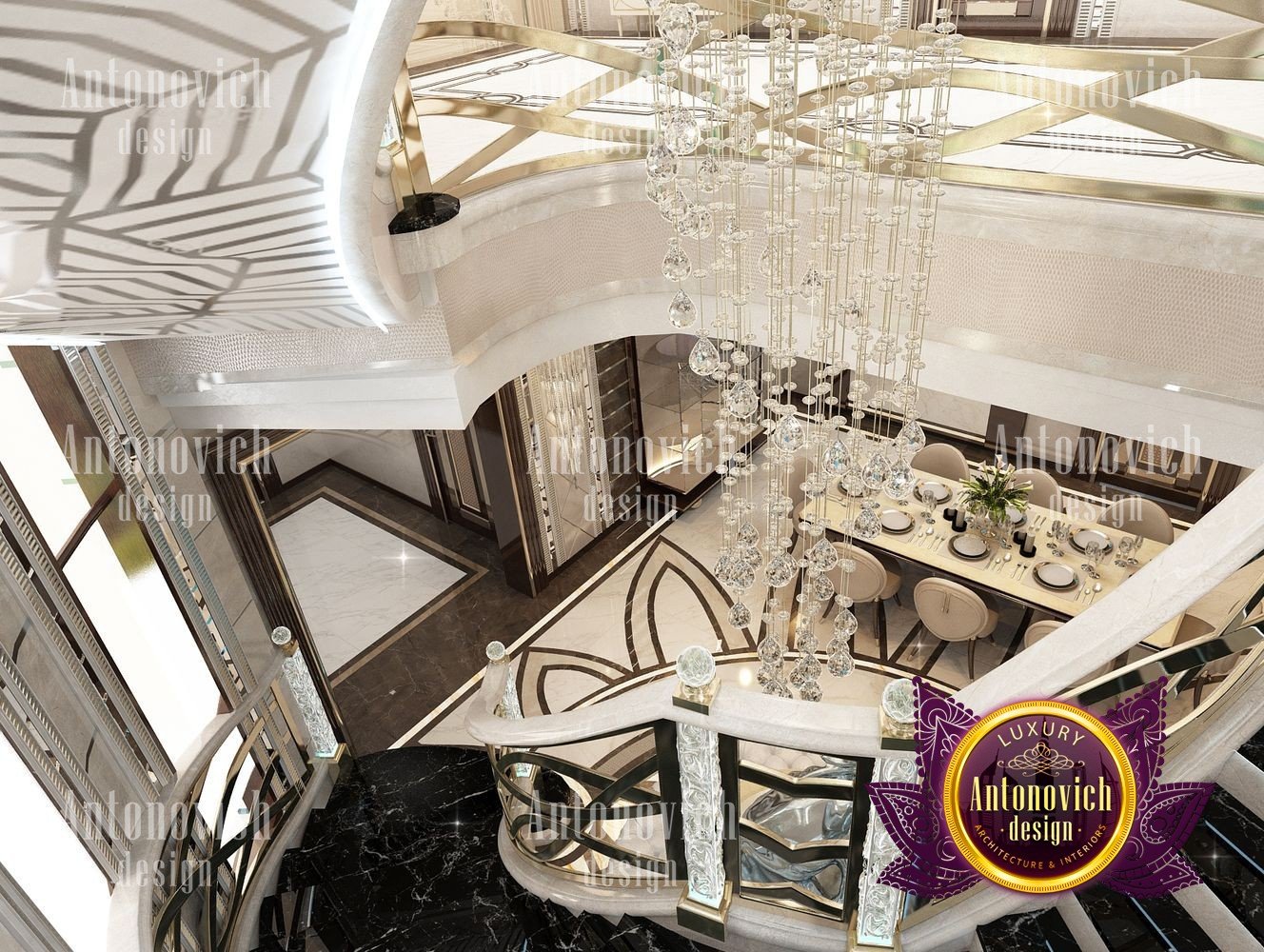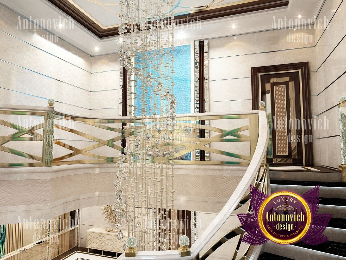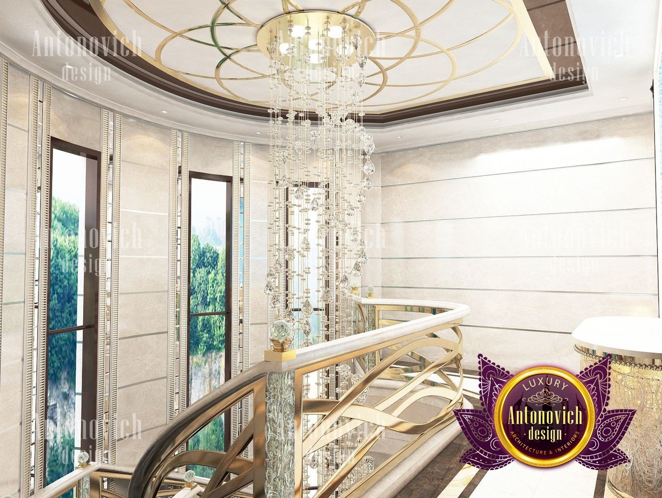 The versatile and luxurious villa project in the UAE is made with Art Deco accents with stylish contemporary style. The owners are people with bright and extraordinary character, who perceive great new things and willing to experiment. UAE interior designers had a task to create a comfortable and luxurious house in which every member of a large and happy family, and their friends will feel comfortable. Villa design UAE adjusts to light and festive mood in the living room, relaxes and soothes in the bedroom, invigorates in the home spa area and pleases with the comfort and aesthetic perfection in every square meter. Interior designers offered a living room in the first floor to divide into two zones. A seating area by the fireplace looks particularly striking and luxurious. In creating such a brilliant image an important role is played by furniture in visionary style. At the luxurious marble fireplace there is a comfortable sofa and two exquisite high-backed chairs. The design of the first floor is in the same motives. In the ceiling decoration decorative plaster with the velvet texture and elegant crystal chandeliers with decorative feathers look luxurious. The space of the hall is separated by exquisite columns and curtains of crystal beads. The villa design takes into account all the wishes of its owners, largely surpassing their wildest dreams. Luxury villa on the second floor is complemented by another living room. The combination of bright and luxurious images of each room makes this project unique and charm.