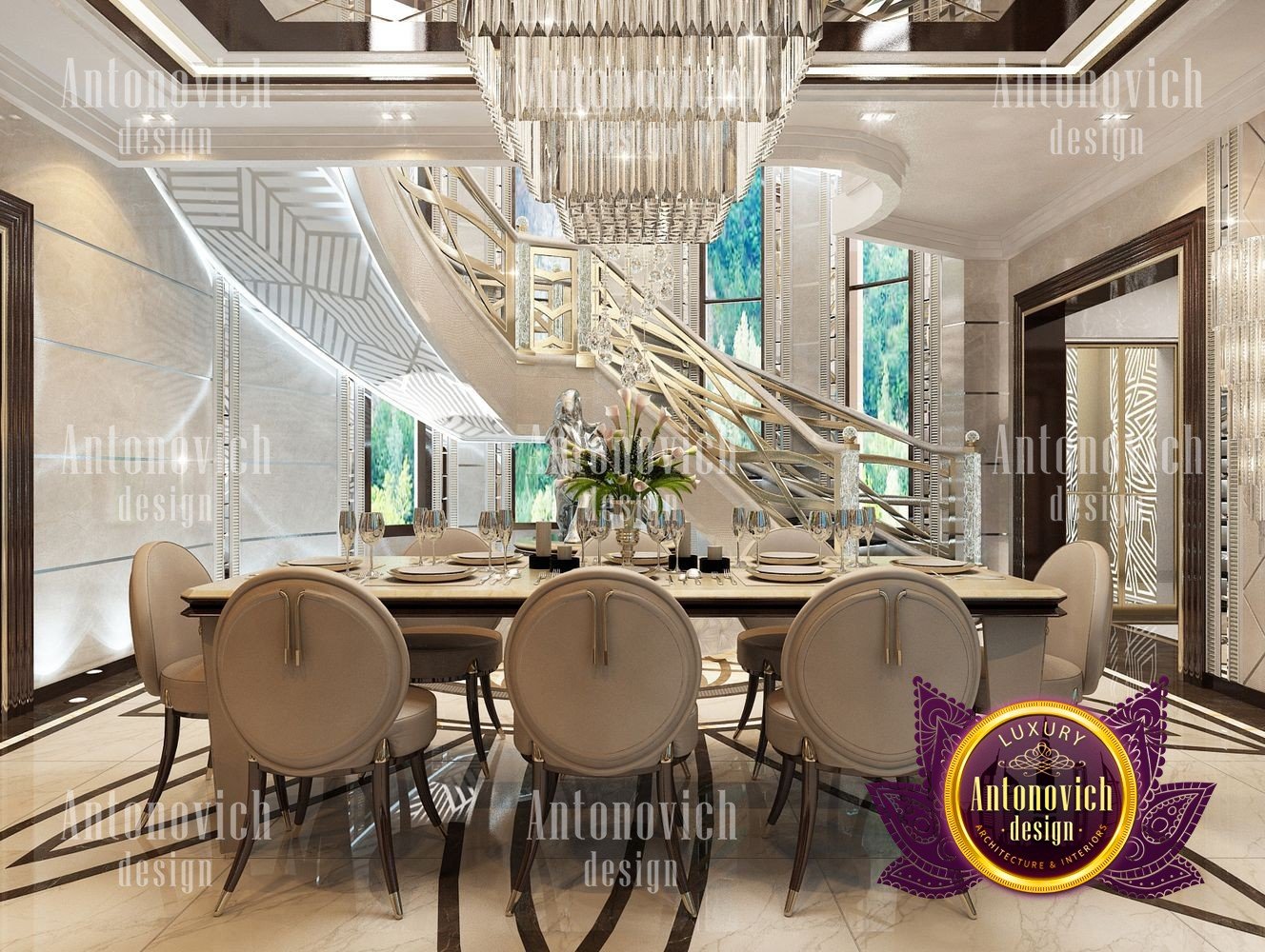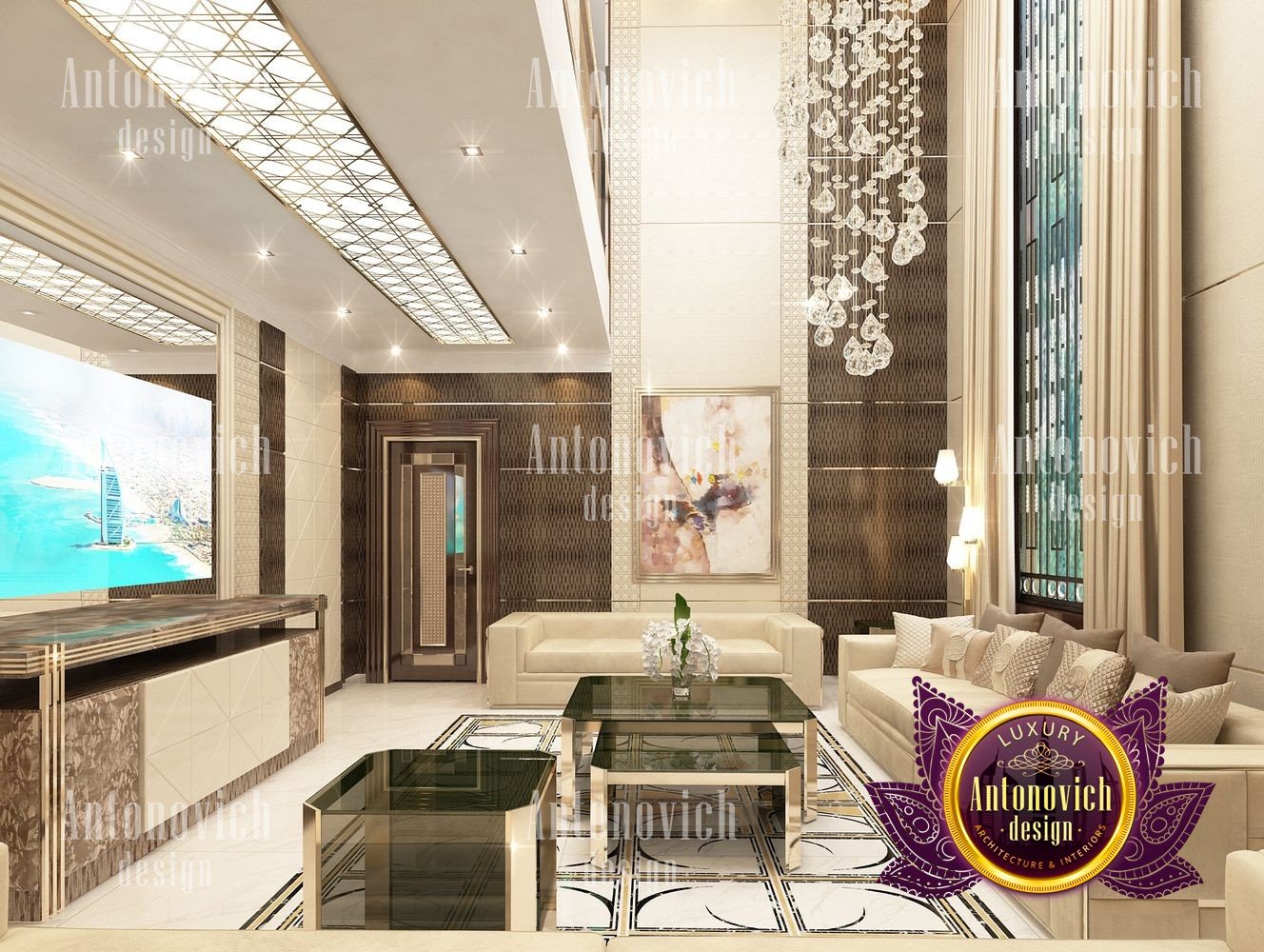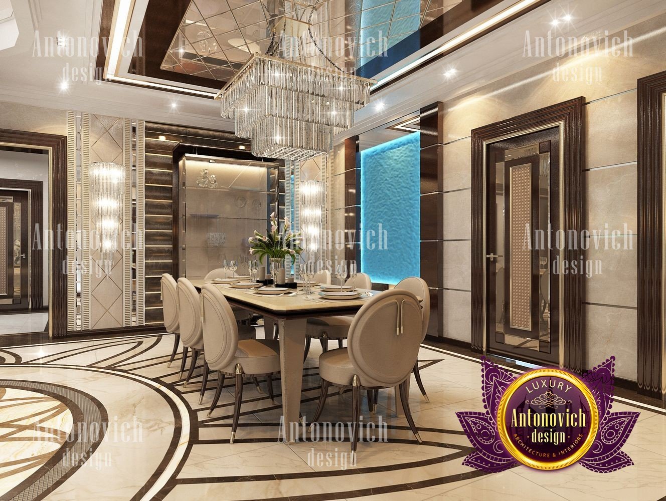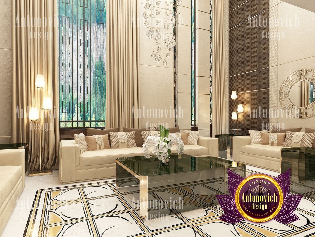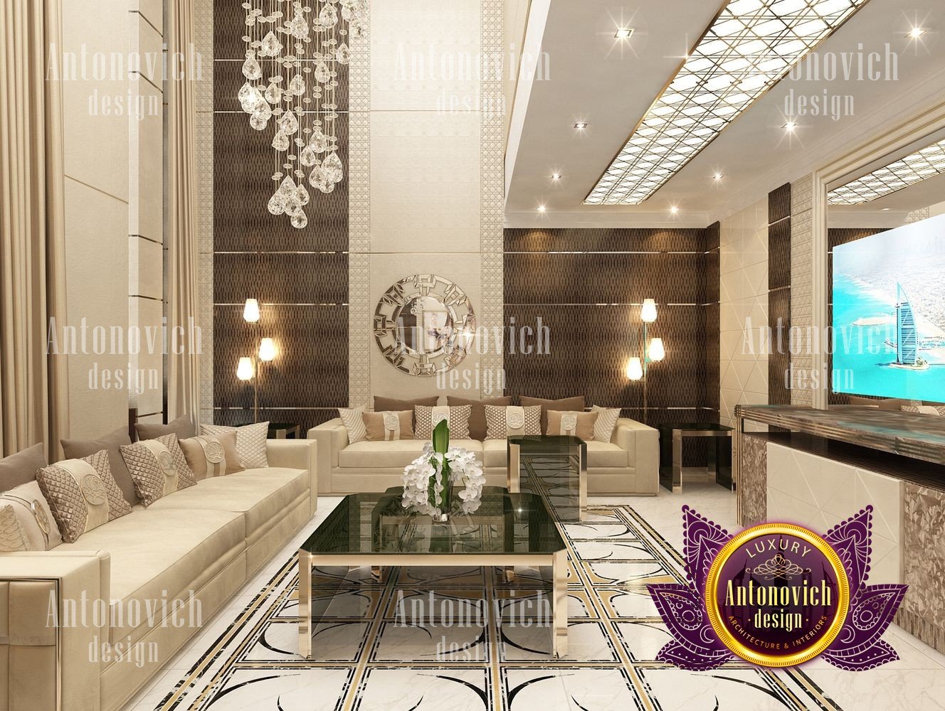 The versatile and luxurious villa project in the UAE is made with Art Deco accents with stylish contemporary style. The owners are people with bright and extraordinary character, who perceive great new things and willing to experiment. UAE interior designers had a task to create a comfortable and luxurious house in which every member of a large and happy family, and their friends will feel comfortable. Villa design UAE adjusts to light and festive mood in the living room, relaxes and soothes in the bedroom, invigorates in the home spa area and pleases with the comfort and aesthetic perfection in every square meter. Interior designers offered a living room in the first floor to divide into two zones. A seating area by the fireplace looks particularly striking and luxurious. In creating such a brilliant image an important role is played by furniture in visionary style. At the luxurious marble fireplace there is a comfortable sofa and two exquisite high-backed chairs. The design of the first floor is in the same motives. In the ceiling decoration decorative plaster with the velvet texture and elegant crystal chandeliers with decorative feathers look luxurious. The space of the hall is separated by exquisite columns and curtains of crystal beads. The villa design takes into account all the wishes of its owners, largely surpassing their wildest dreams. Luxury villa on the second floor is complemented by another living room. The combination of bright and luxurious images of each room makes this project unique and charm.