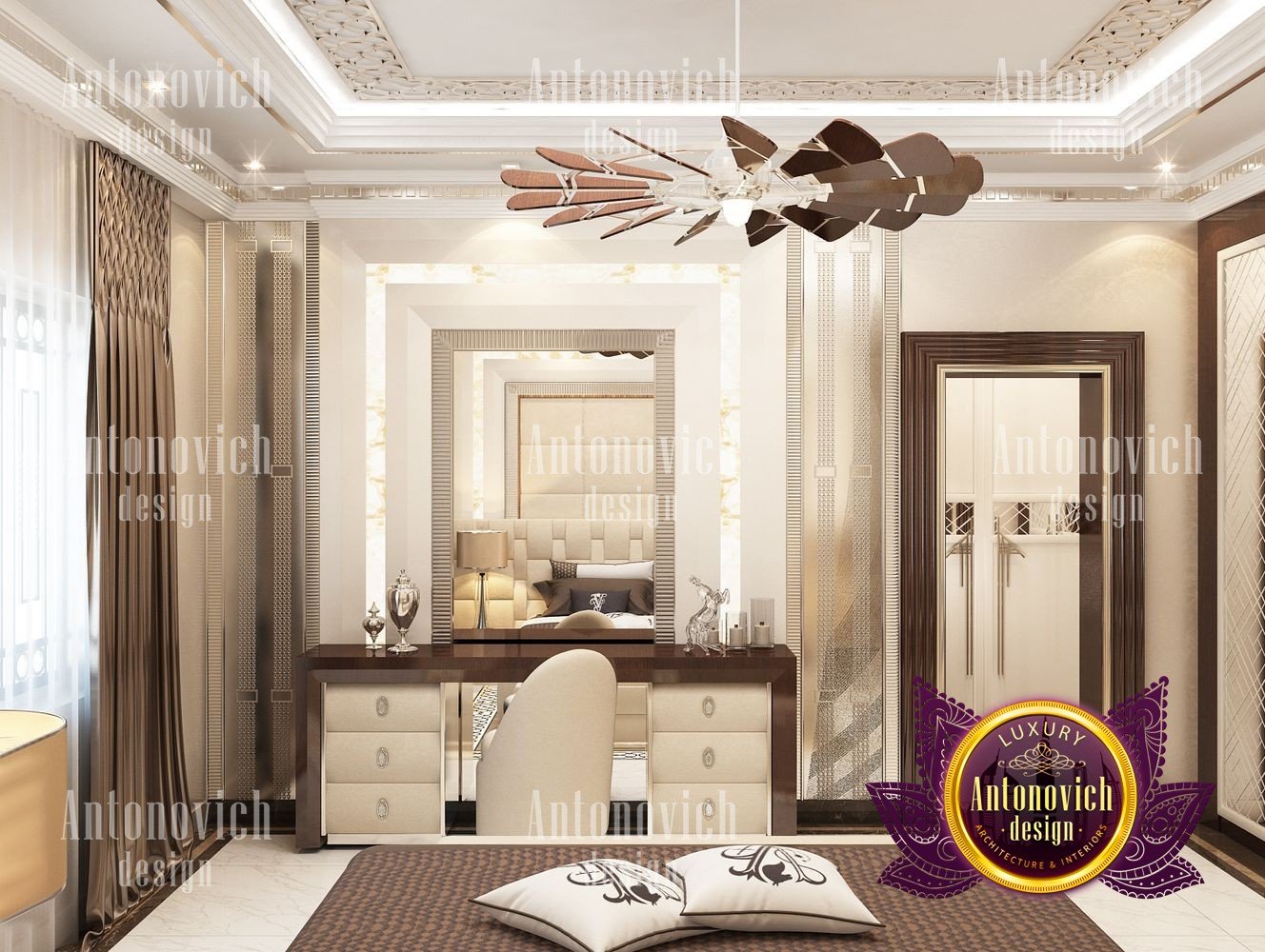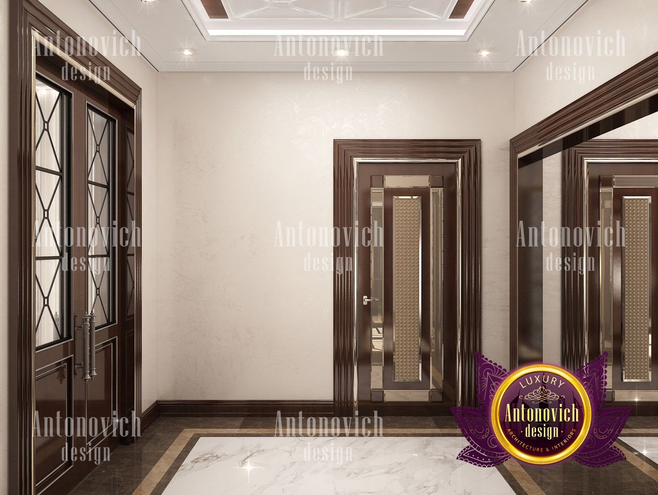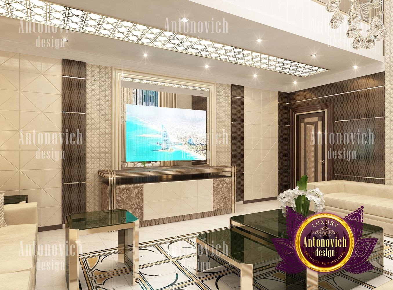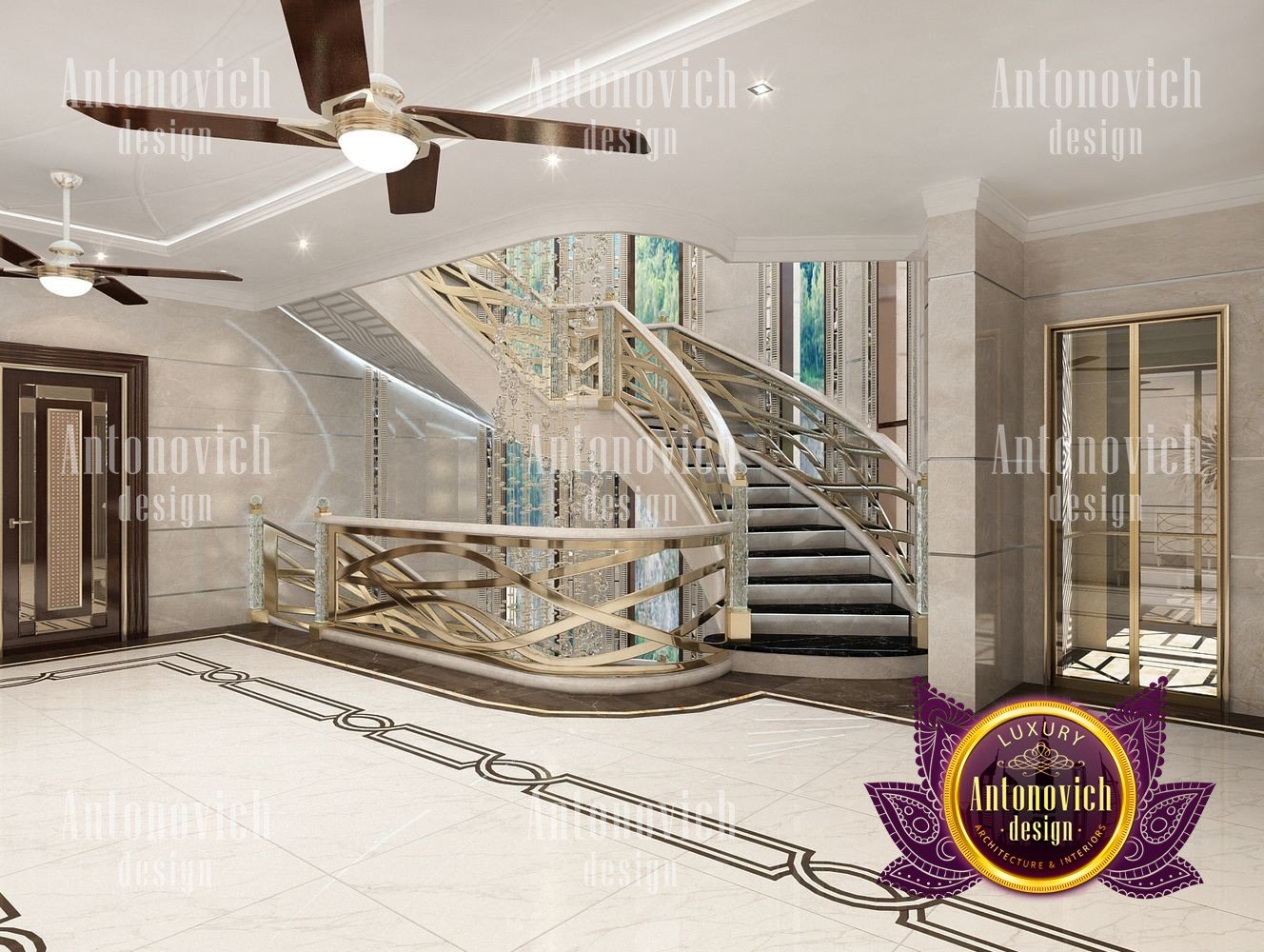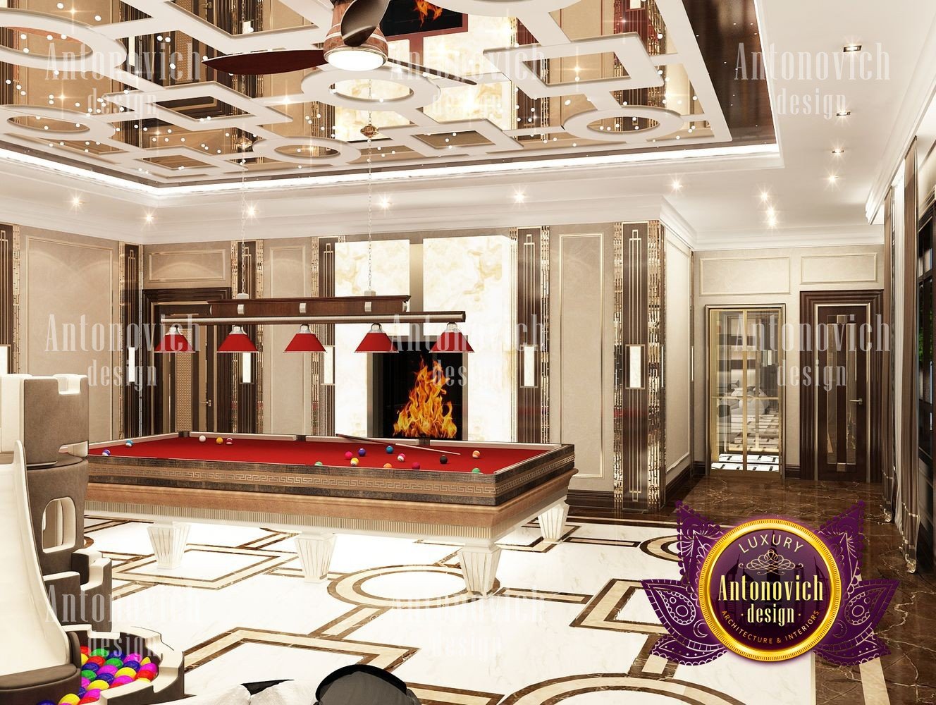 The versatile and luxurious villa project in the UAE is made with Art Deco accents with stylish contemporary style. The owners are people with bright and extraordinary character, who perceive great new things and willing to experiment. UAE interior designers had a task to create a comfortable and luxurious house in which every member of a large and happy family, and their friends will feel comfortable. Villa design UAE adjusts to light and festive mood in the living room, relaxes and soothes in the bedroom, invigorates in the home spa area and pleases with the comfort and aesthetic perfection in every square meter. Interior designers offered a living room in the first floor to divide into two zones. A seating area by the fireplace looks particularly striking and luxurious. In creating such a brilliant image an important role is played by furniture in visionary style. At the luxurious marble fireplace there is a comfortable sofa and two exquisite high-backed chairs. The design of the first floor is in the same motives. In the ceiling decoration decorative plaster with the velvet texture and elegant crystal chandeliers with decorative feathers look luxurious. The space of the hall is separated by exquisite columns and curtains of crystal beads. The villa design takes into account all the wishes of its owners, largely surpassing their wildest dreams. Luxury villa on the second floor is complemented by another living room. The combination of bright and luxurious images of each room makes this project unique and charm.