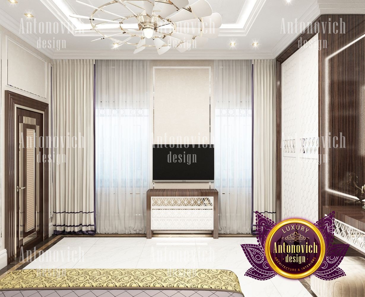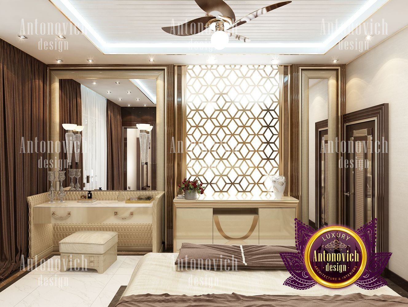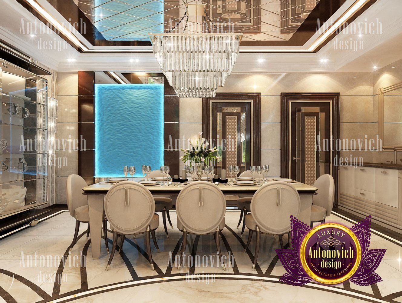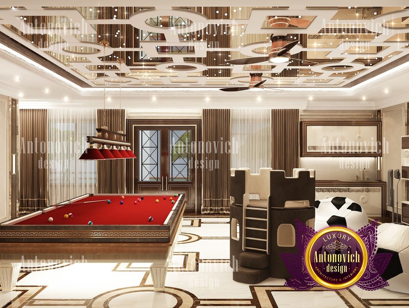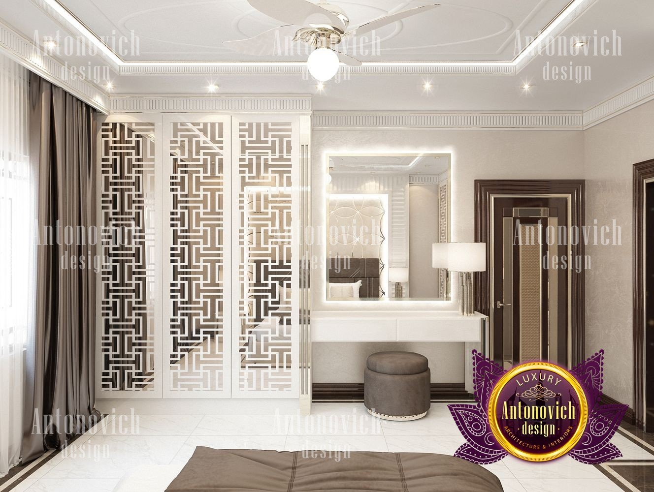 The versatile and luxurious villa project in the UAE is made with Art Deco accents with stylish contemporary style. The owners are people with bright and extraordinary character, who perceive great new things and willing to experiment. UAE interior designers had a task to create a comfortable and luxurious house in which every member of a large and happy family, and their friends will feel comfortable. Villa design UAE adjusts to light and festive mood in the living room, relaxes and soothes in the bedroom, invigorates in the home spa area and pleases with the comfort and aesthetic perfection in every square meter. Interior designers offered a living room in the first floor to divide into two zones. A seating area by the fireplace looks particularly striking and luxurious. In creating such a brilliant image an important role is played by furniture in visionary style. At the luxurious marble fireplace there is a comfortable sofa and two exquisite high-backed chairs. The design of the first floor is in the same motives. In the ceiling decoration decorative plaster with the velvet texture and elegant crystal chandeliers with decorative feathers look luxurious. The space of the hall is separated by exquisite columns and curtains of crystal beads. The villa design takes into account all the wishes of its owners, largely surpassing their wildest dreams. Luxury villa on the second floor is complemented by another living room. The combination of bright and luxurious images of each room makes this project unique and charm.