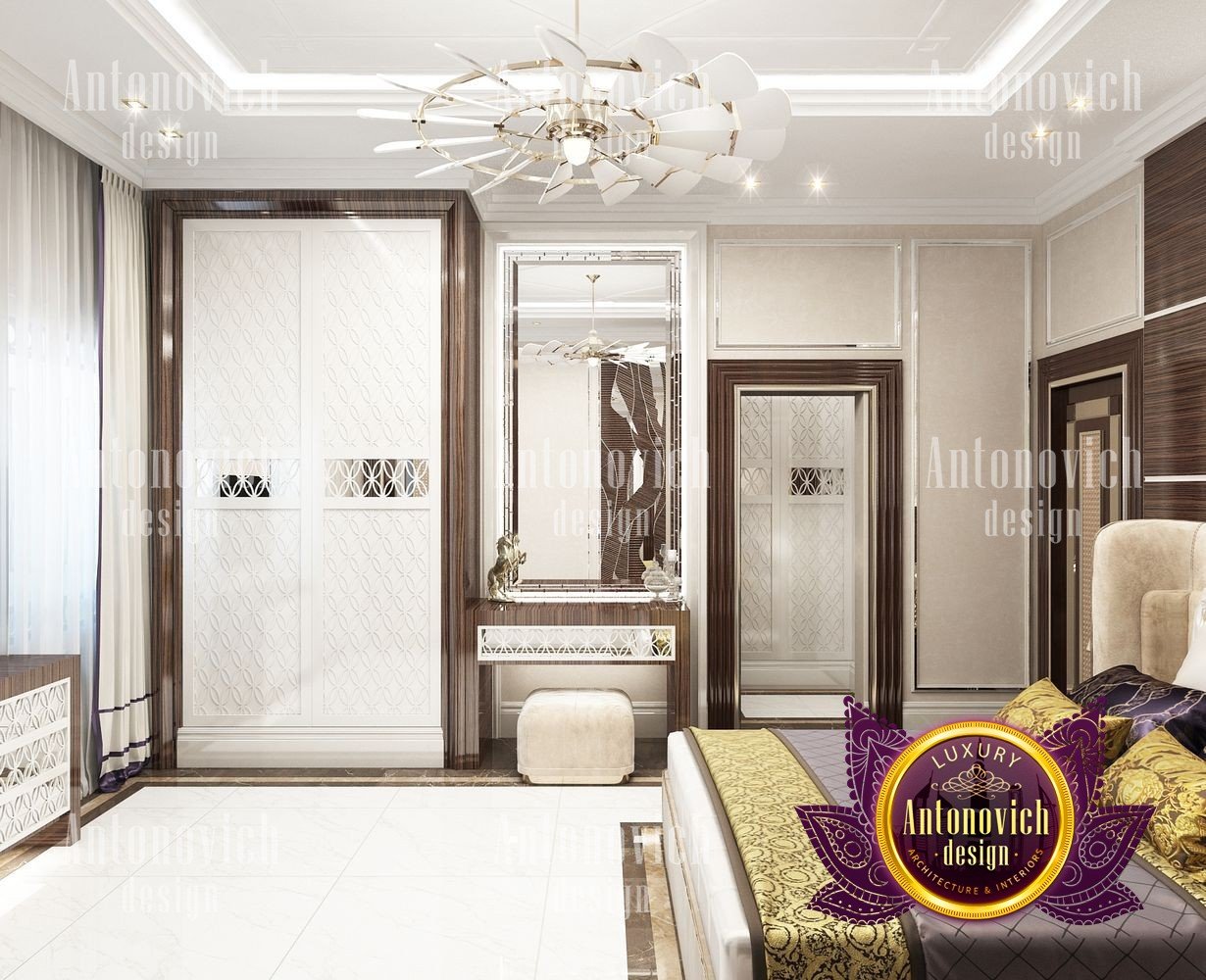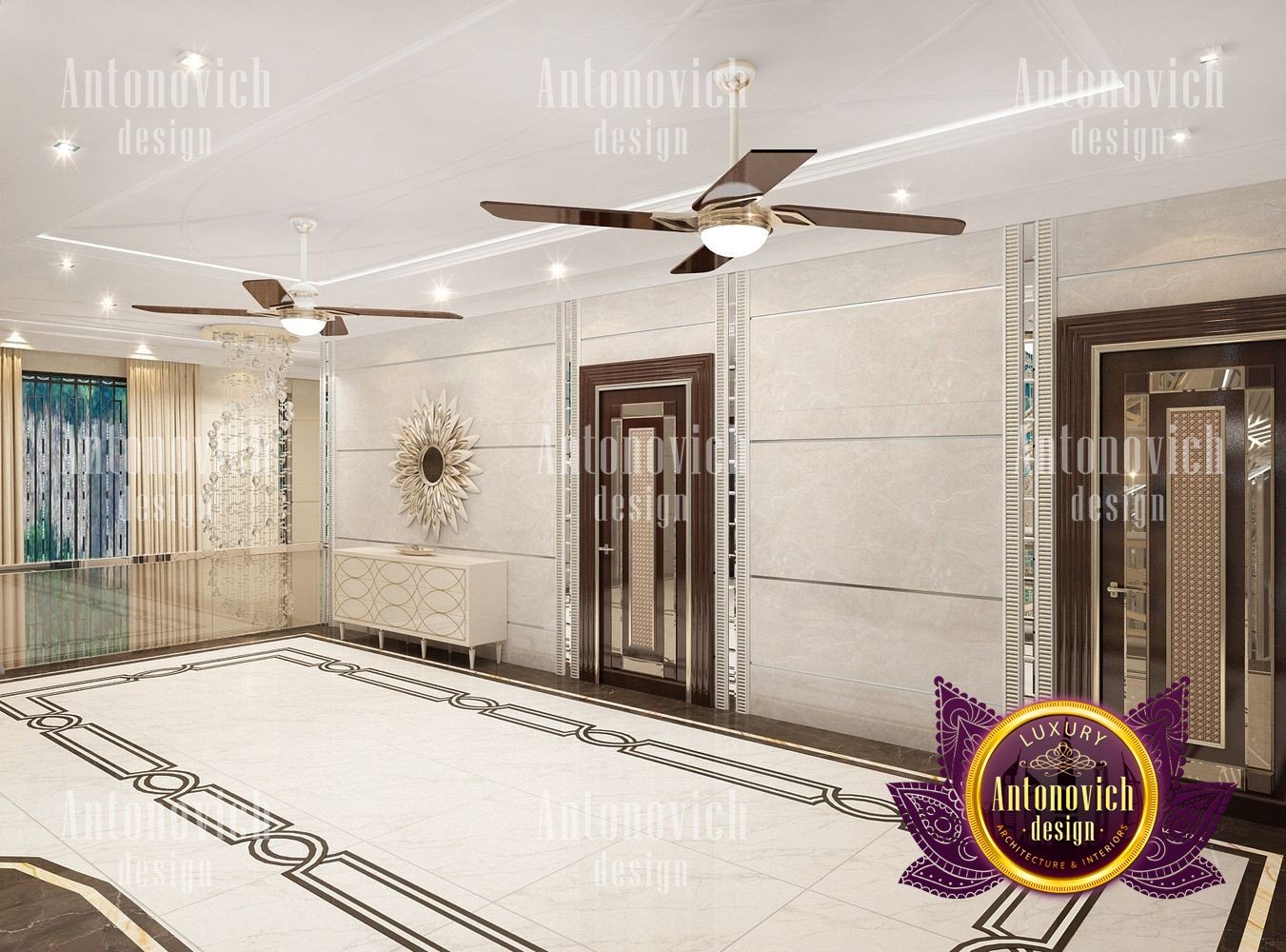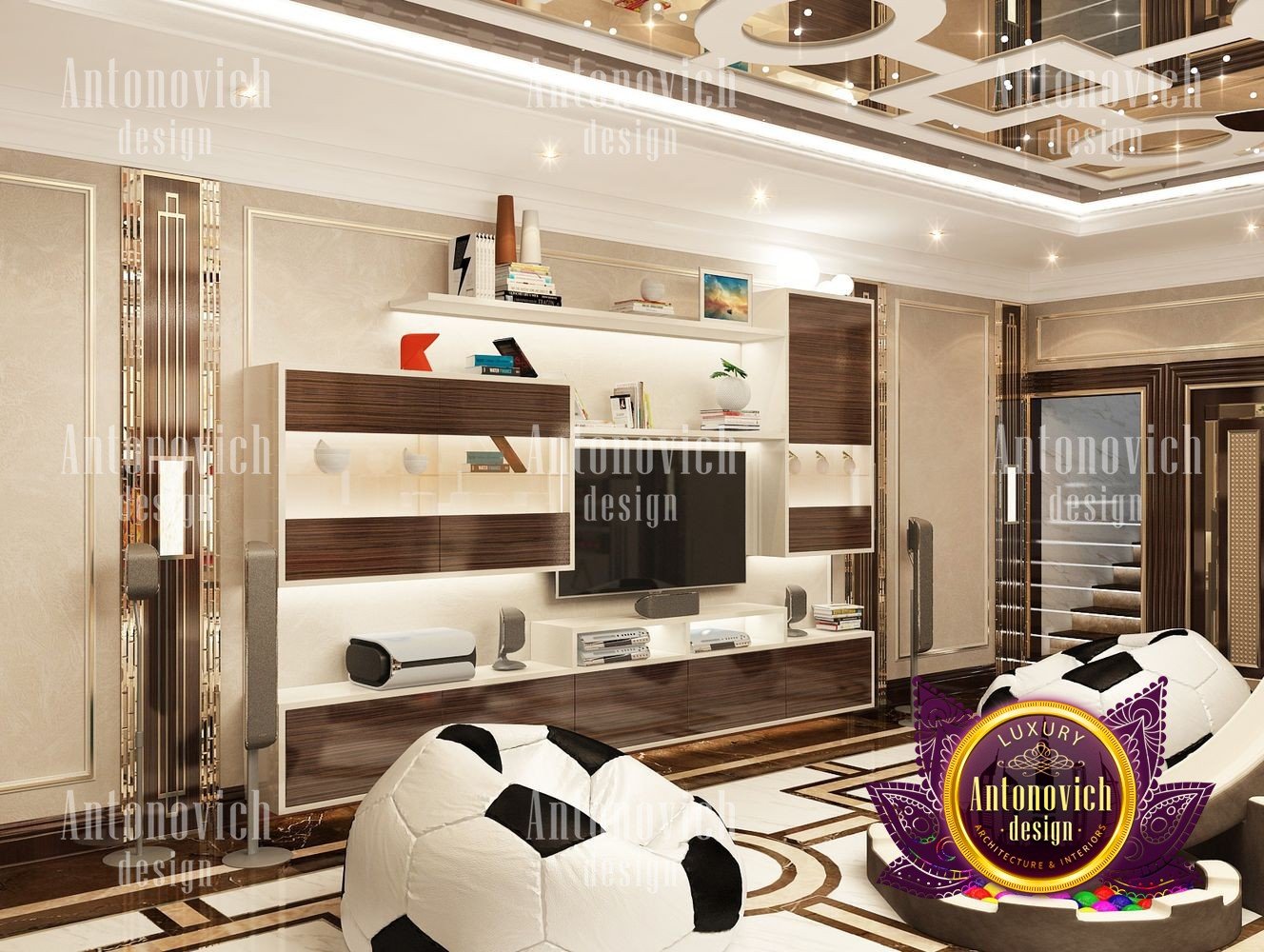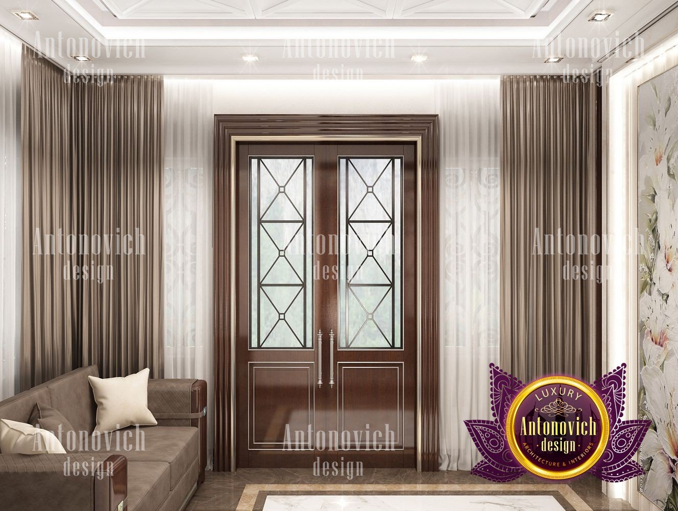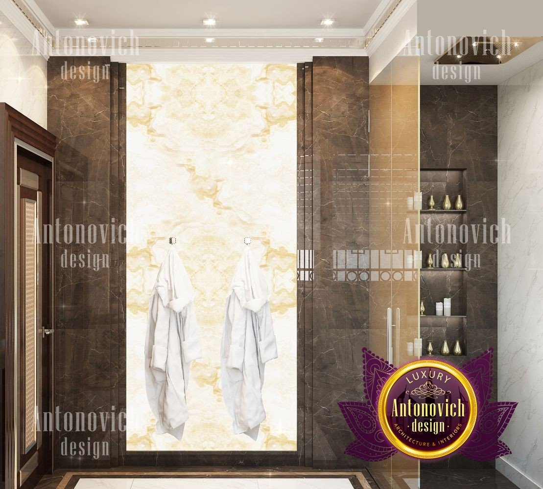 The versatile and luxurious villa project in the UAE is made with Art Deco accents with stylish contemporary style. The owners are people with bright and extraordinary character, who perceive great new things and willing to experiment. UAE interior designers had a task to create a comfortable and luxurious house in which every member of a large and happy family, and their friends will feel comfortable. Villa design UAE adjusts to light and festive mood in the living room, relaxes and soothes in the bedroom, invigorates in the home spa area and pleases with the comfort and aesthetic perfection in every square meter. Interior designers offered a living room in the first floor to divide into two zones. A seating area by the fireplace looks particularly striking and luxurious. In creating such a brilliant image an important role is played by furniture in visionary style. At the luxurious marble fireplace there is a comfortable sofa and two exquisite high-backed chairs. The design of the first floor is in the same motives. In the ceiling decoration decorative plaster with the velvet texture and elegant crystal chandeliers with decorative feathers look luxurious. The space of the hall is separated by exquisite columns and curtains of crystal beads. The villa design takes into account all the wishes of its owners, largely surpassing their wildest dreams. Luxury villa on the second floor is complemented by another living room. The combination of bright and luxurious images of each room makes this project unique and charm.